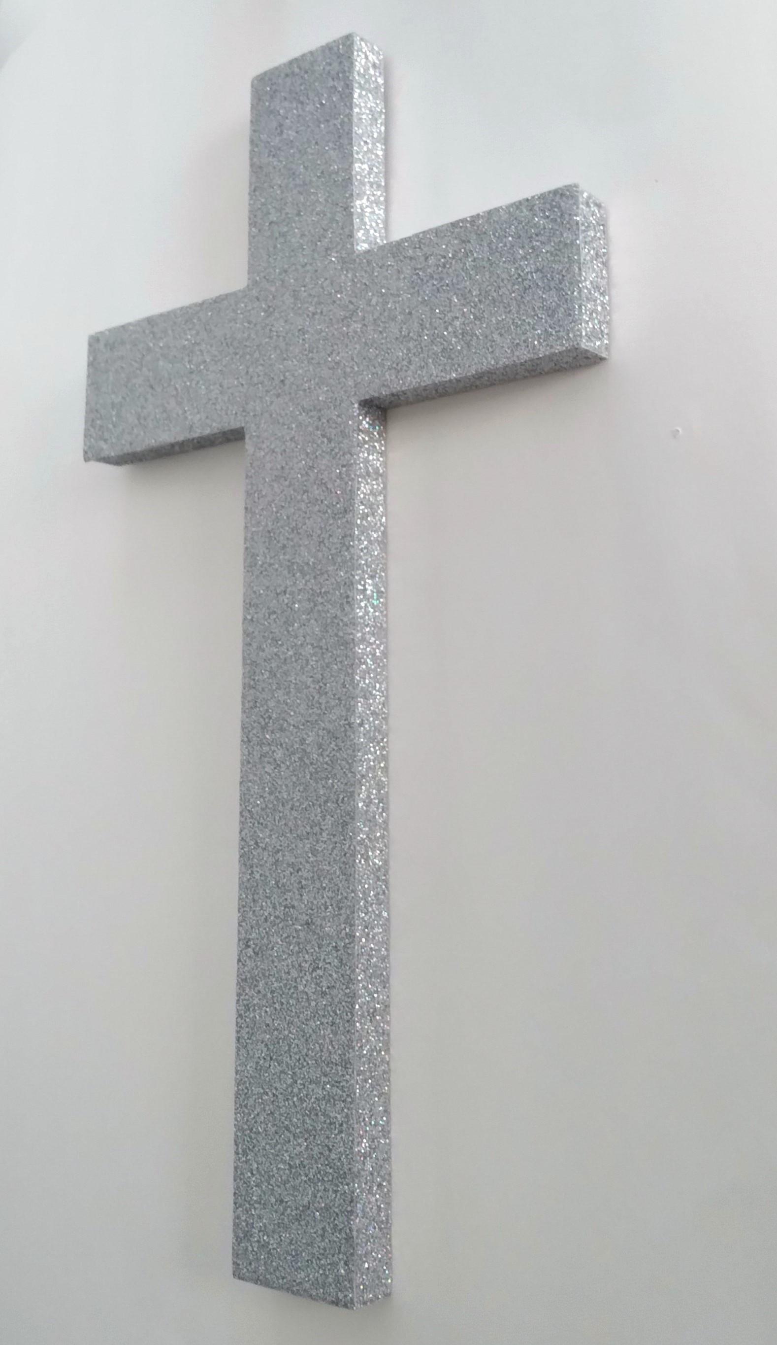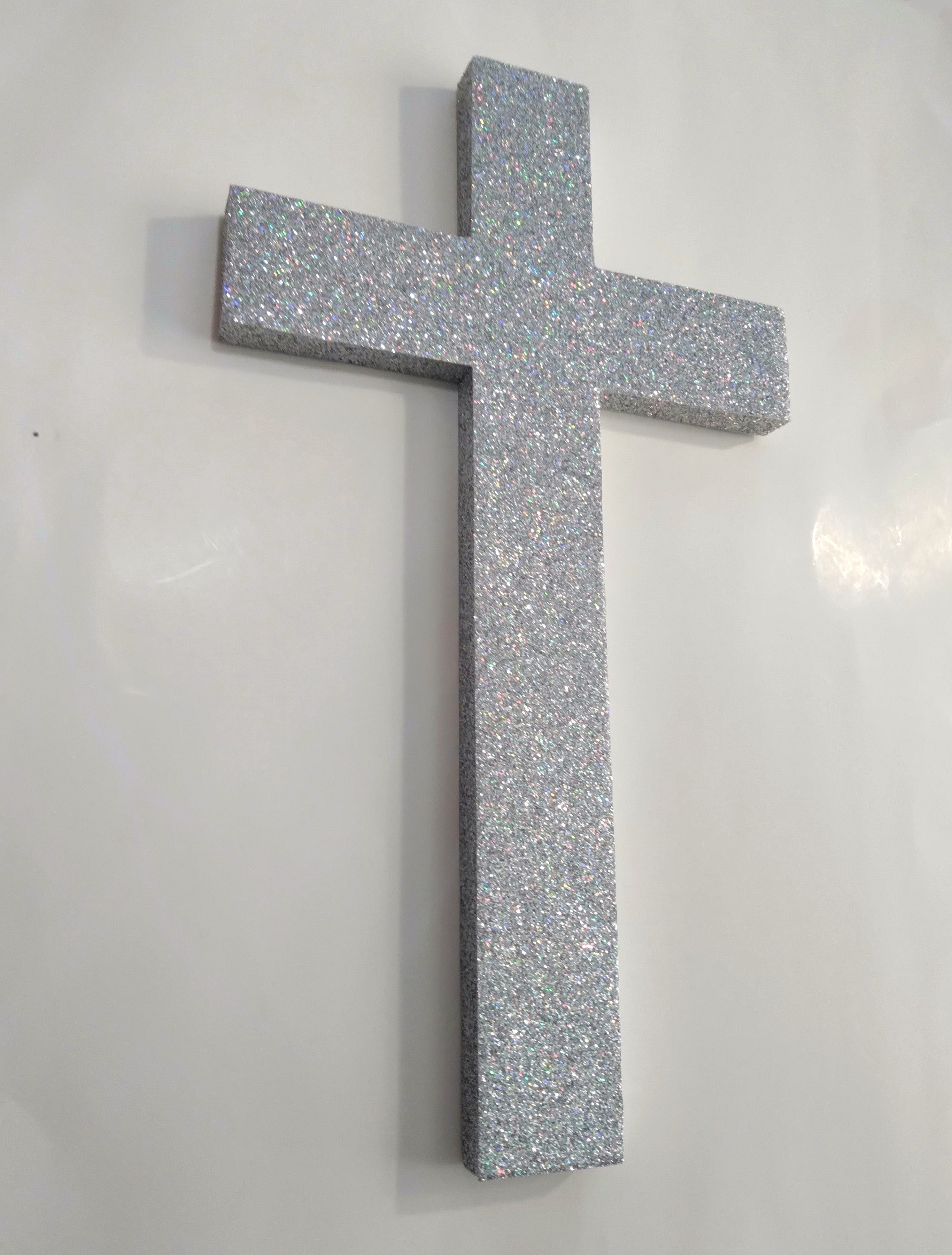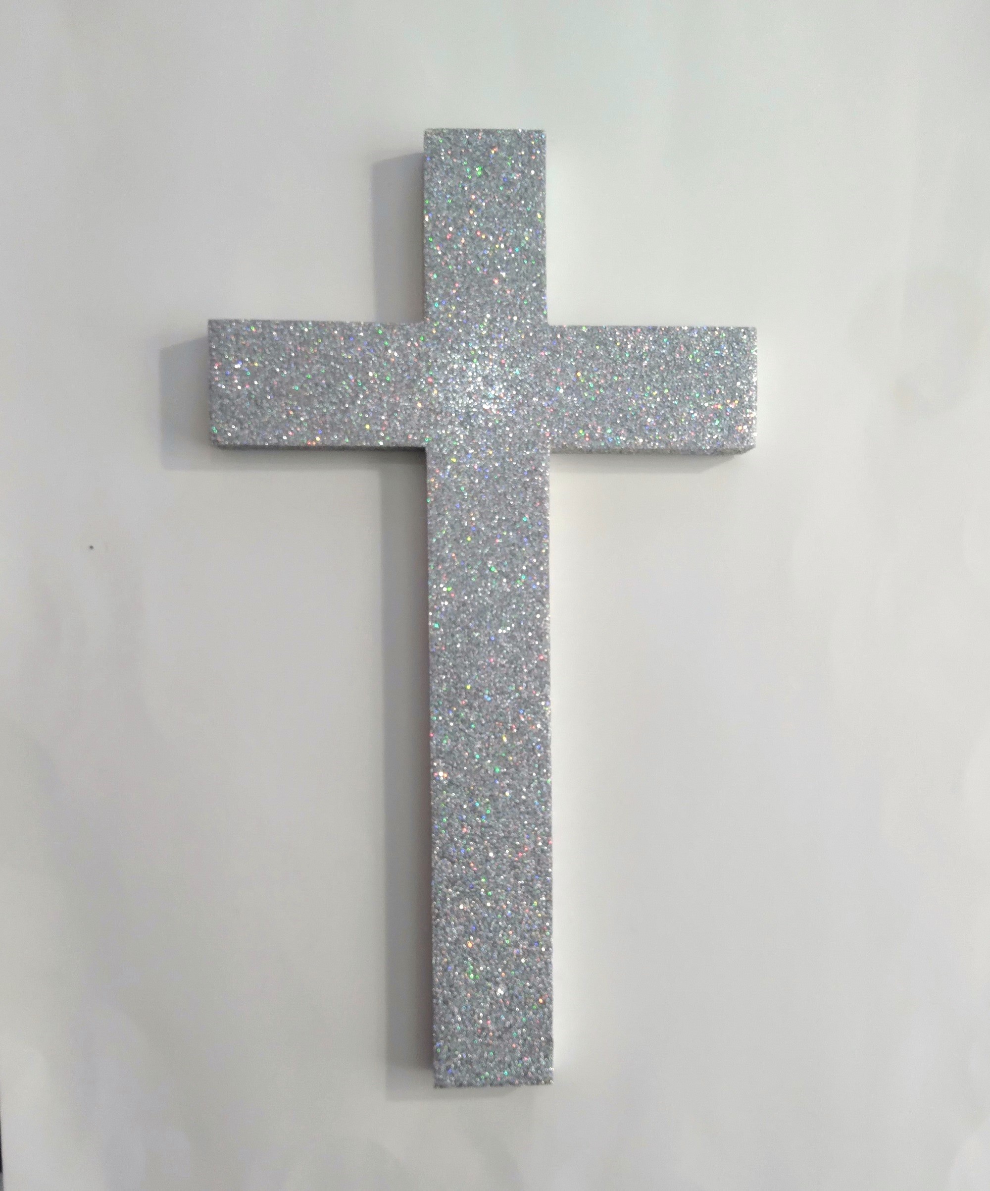 Add sparkle and faith to any room! This iridescent silver glitter wall cross has beautiful sparkle from every angle! It has a combination of fine silver glitter and fine iridescent glitter, giving a slight holographic color to it. The glitter is in the glitter stock material, so there is no loose glitter or shedding. The glitter surface covers the front and all sides and has a clean fine edged look. The cross is made from pine wood. Comes ready to hang. Very beautiful, especially in person! If you like sparkle or glitter, you will love this! Available in 9.5" L x 5.5" W or 12" L x 7.5" W. It is 1/2 inch thick. When ordering, please select from the drop down menu which size you prefer. Also available in other fine glitter varieties (see other listing). Handmade to order..please allow 5-7 business days to make and ship.