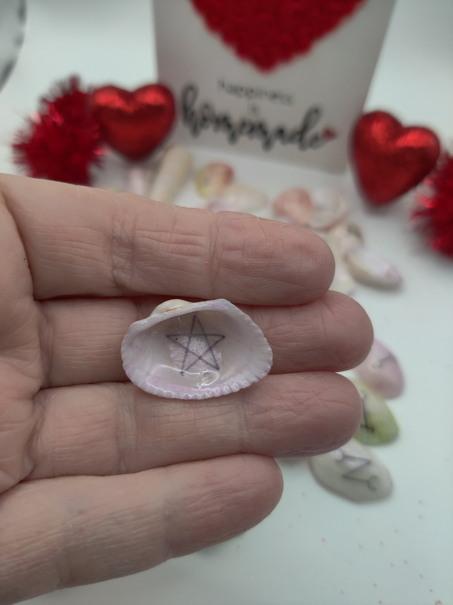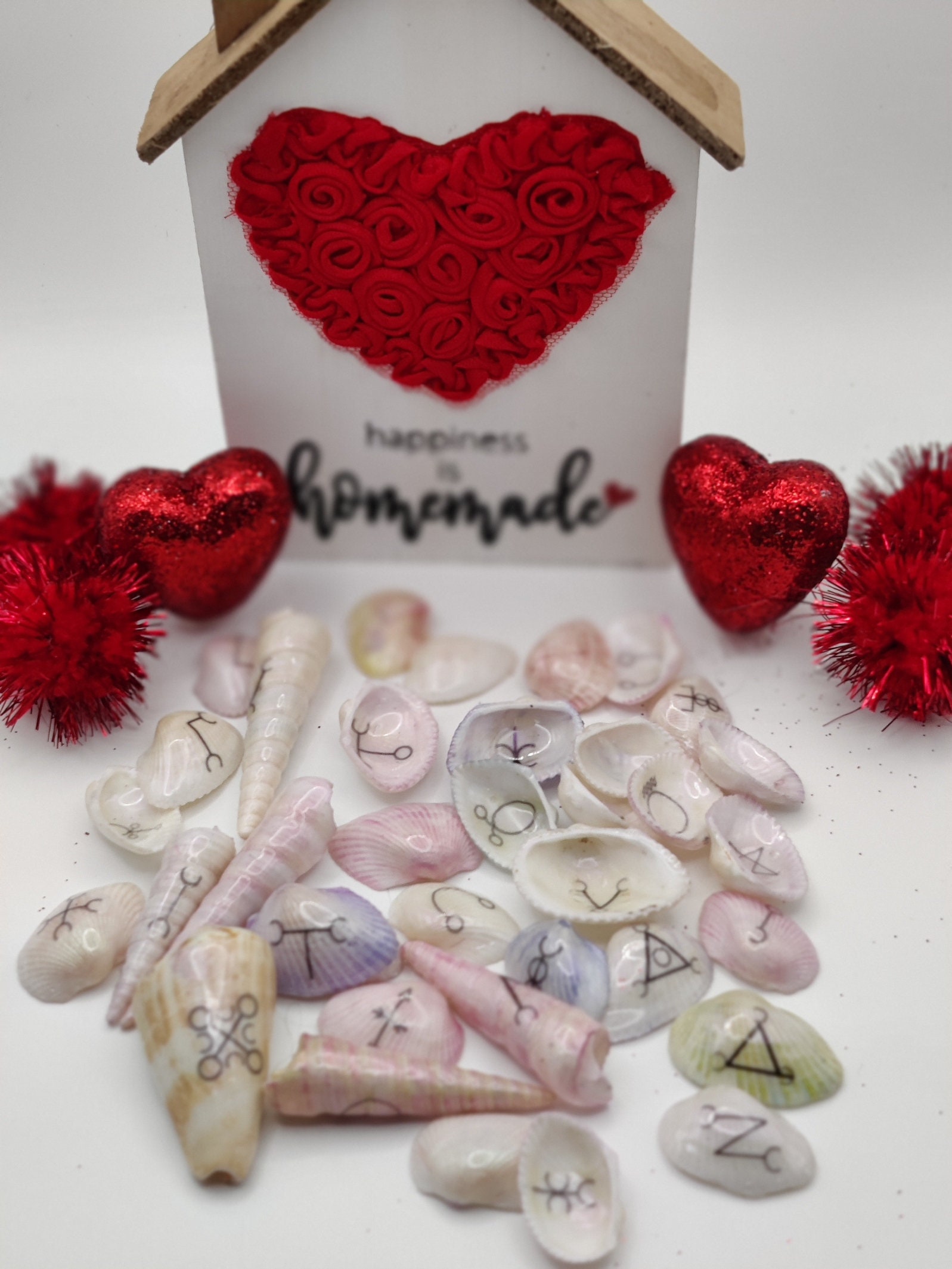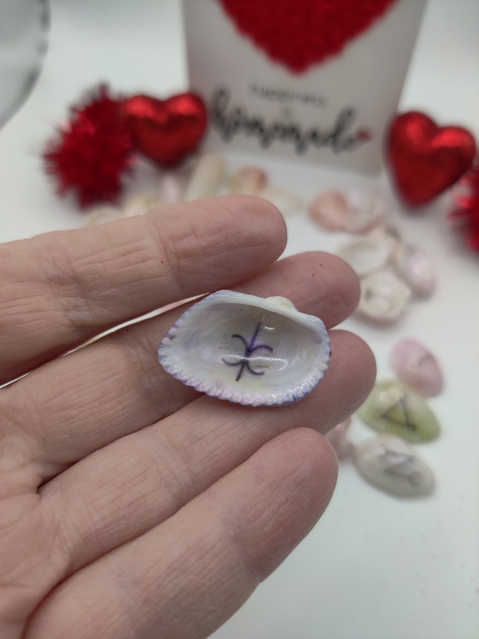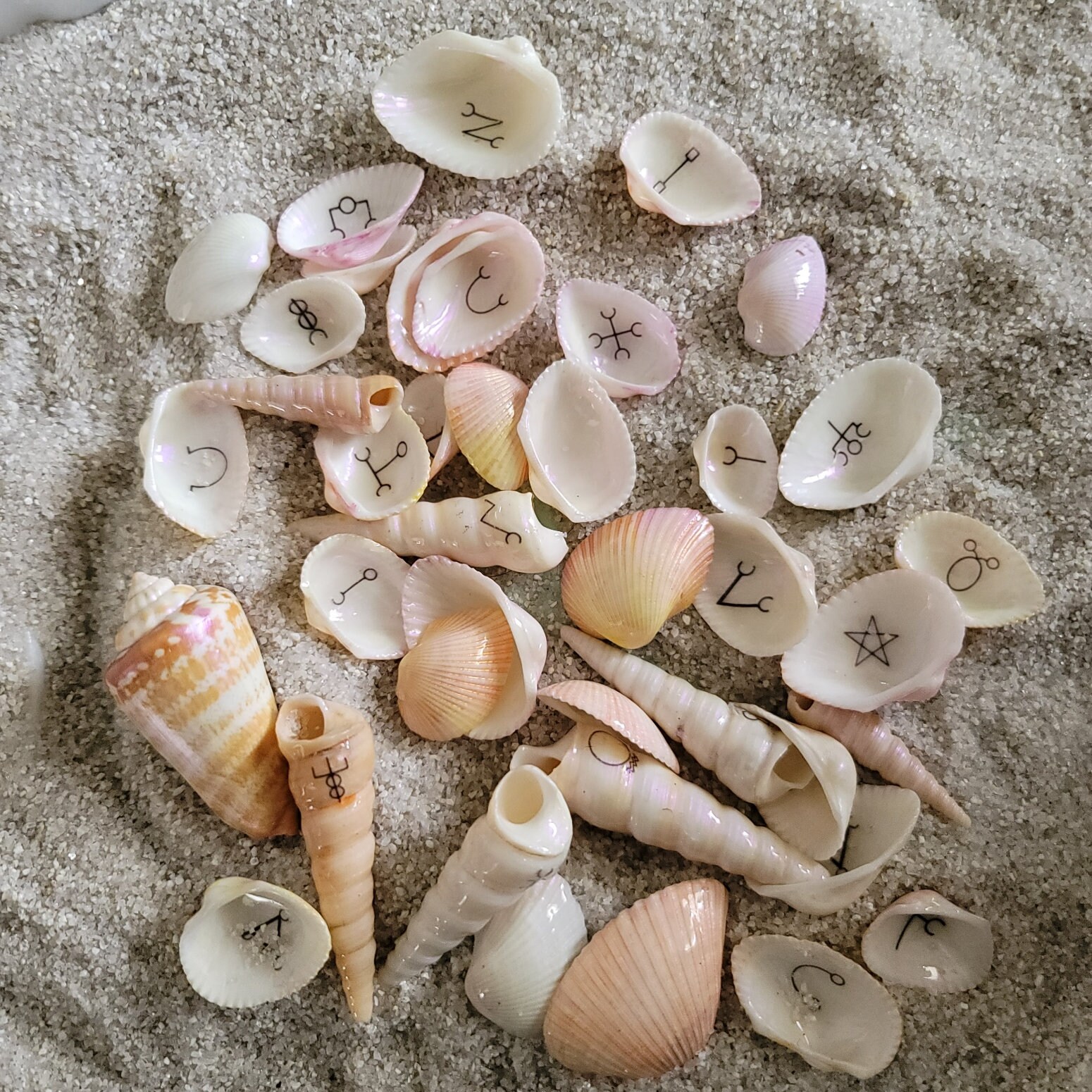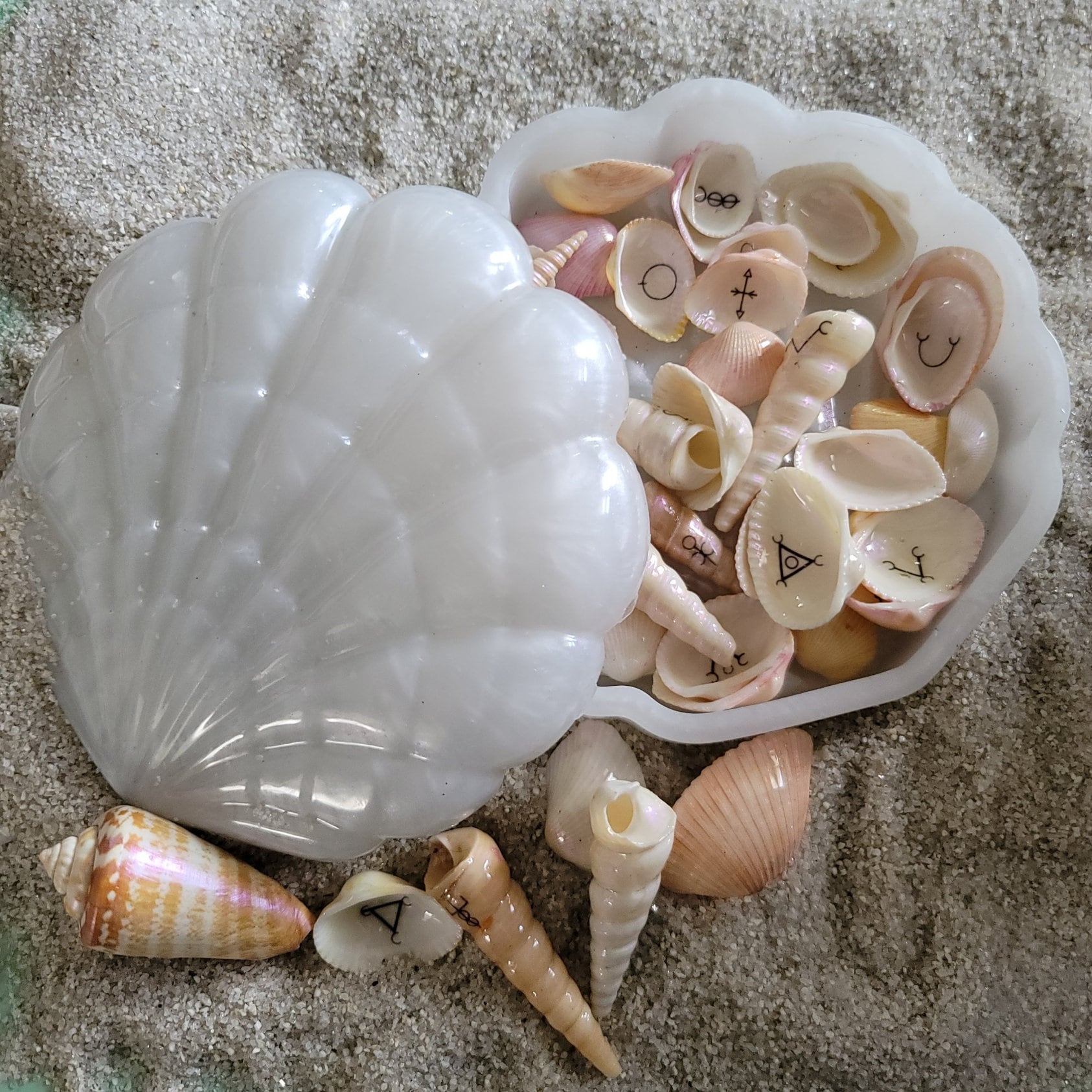 The Janarric runes, originating from coastal Italy, are made with 36 sacred sea symbols for sea witchcraft. I have hand painted natural seashells with a pearled glaze and sealed each with UV resin to strengthen, and beautify each with a high gloss. It helps keep the finer shells from chipping. It is very labor intensive and I had a lot of fun making these! These are perfect for any witch that's drawn to the sea. They feel great in the hand and cast beautifully! very very light weight but may break if toted in your purse unless you have a sturdy container. The set also includes a resin sea shell container. I have also included a guide sheet with the definition of each symbol. I hope you love these as much as i do.