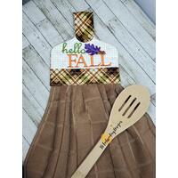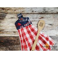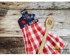Towel band made in the hoop of your embroidery machine. A great way to use your favorite fabrics and spruce up your kitchen. Perfect gift project! This embroidery design project is made with one hooping and a little sewing for one side of the elastic at the end. No need to sew the towel into the towel band. Very quick project! Perfect way for children to have their own towel hanging in the bath/shower to quickly wipe their eyes on. This is a great design pattern to make a simple and quick ITH project.
