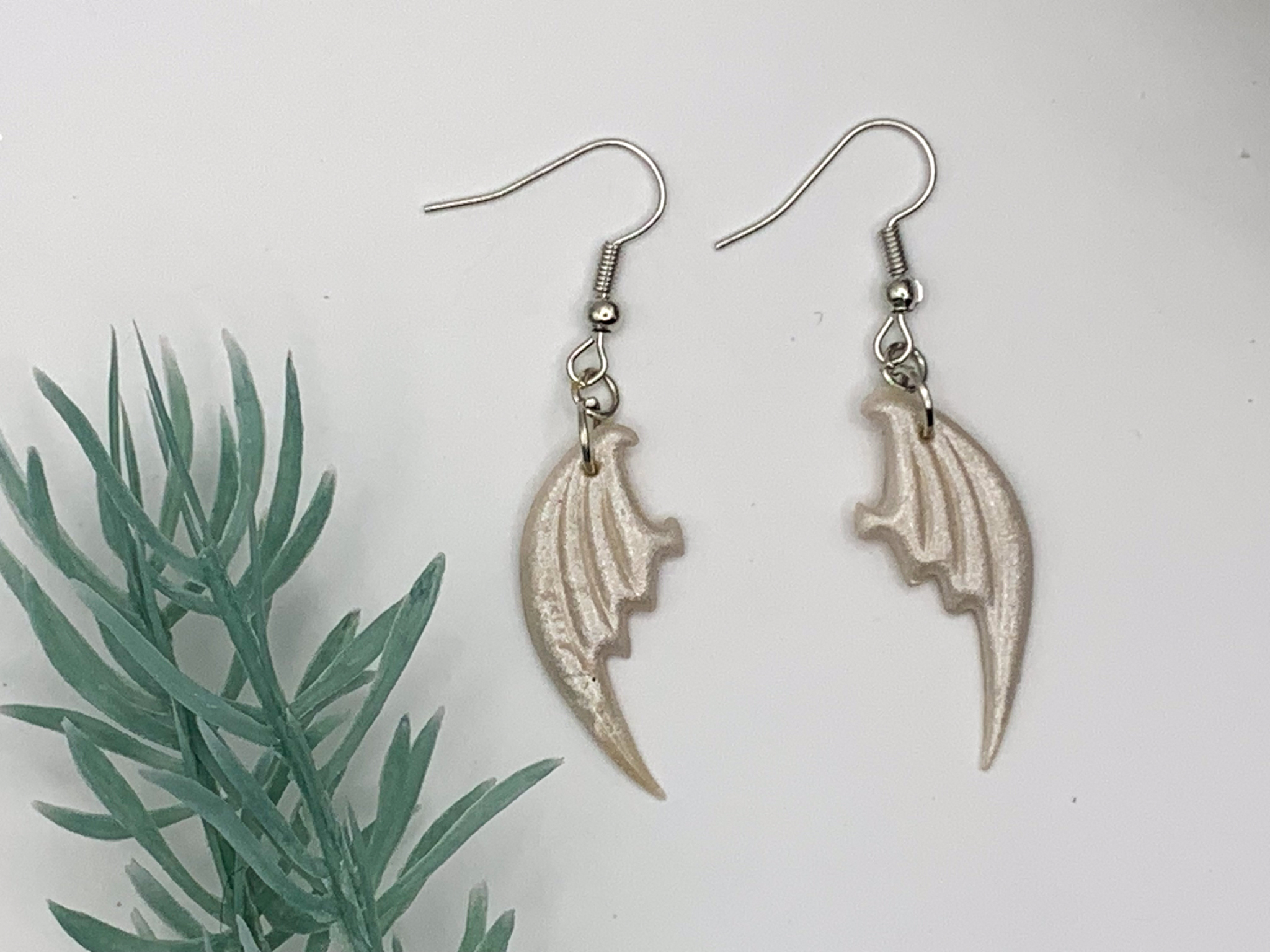 Elegant and ethereal! These ivory-toned dragon wing earrings shimmer softly, creating a delicate yet daring accessory for fantasy lovers.