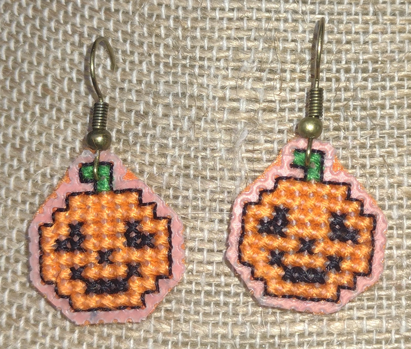 A pair of friendly Jacks to keep you company on a cool autumn day. These earrings are of small round pumpkins with smiling jack-o-lantern faces. They are hand-stitched on plastic canvas, so they are very light weight. The backing is orange felt.