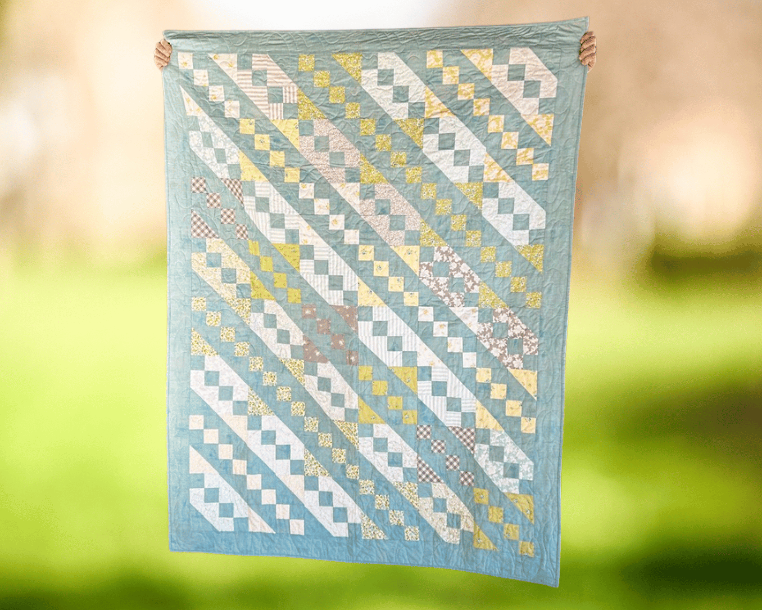 Wrap yourself in warmth and color with this stunning Jacob’s Ladder throw quilt — a timeless patchwork pattern brought to life in shades of teal, yellow, and crisp white. Each block is carefully pieced and quilted to create a bright, cheerful design that adds charm and comfort to any room.