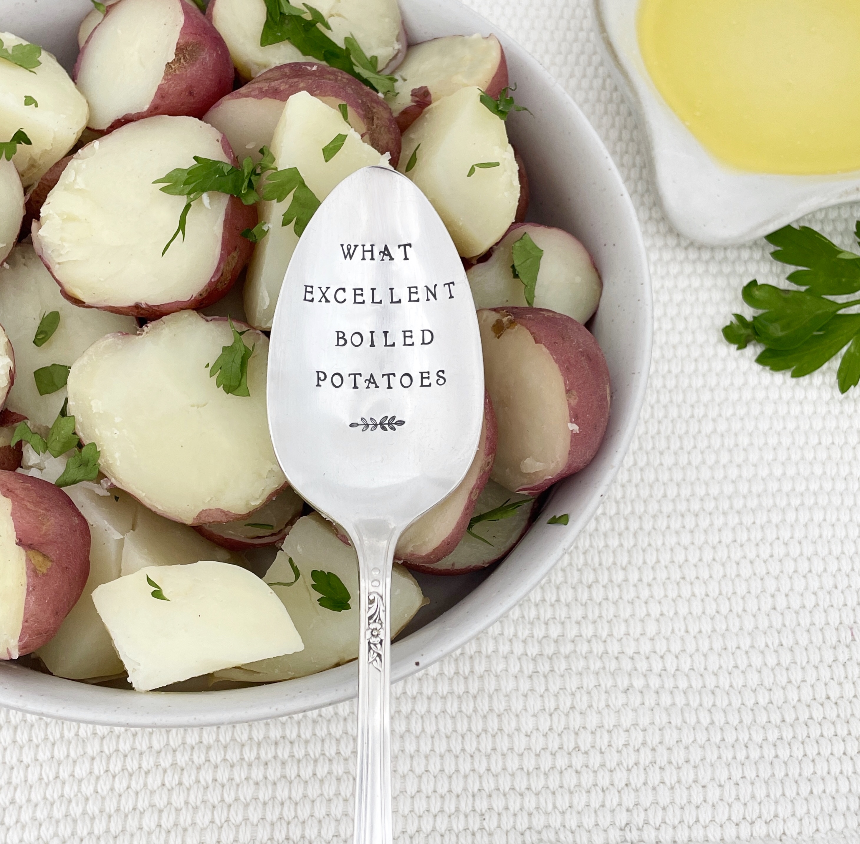 Prose & Polish offers upcycled and repurposed vintage silverplate flatware. Each piece created is truly vintage - carefully curated through estate sales, antique shops, and auctions. They aren’t perfect, they will show their age — but their age and history are part of what makes them beautiful. Once home, they are carefully cleaned and polished by hand. The sentiment is stamped letter by letter into the silver with a hammer and anvil.