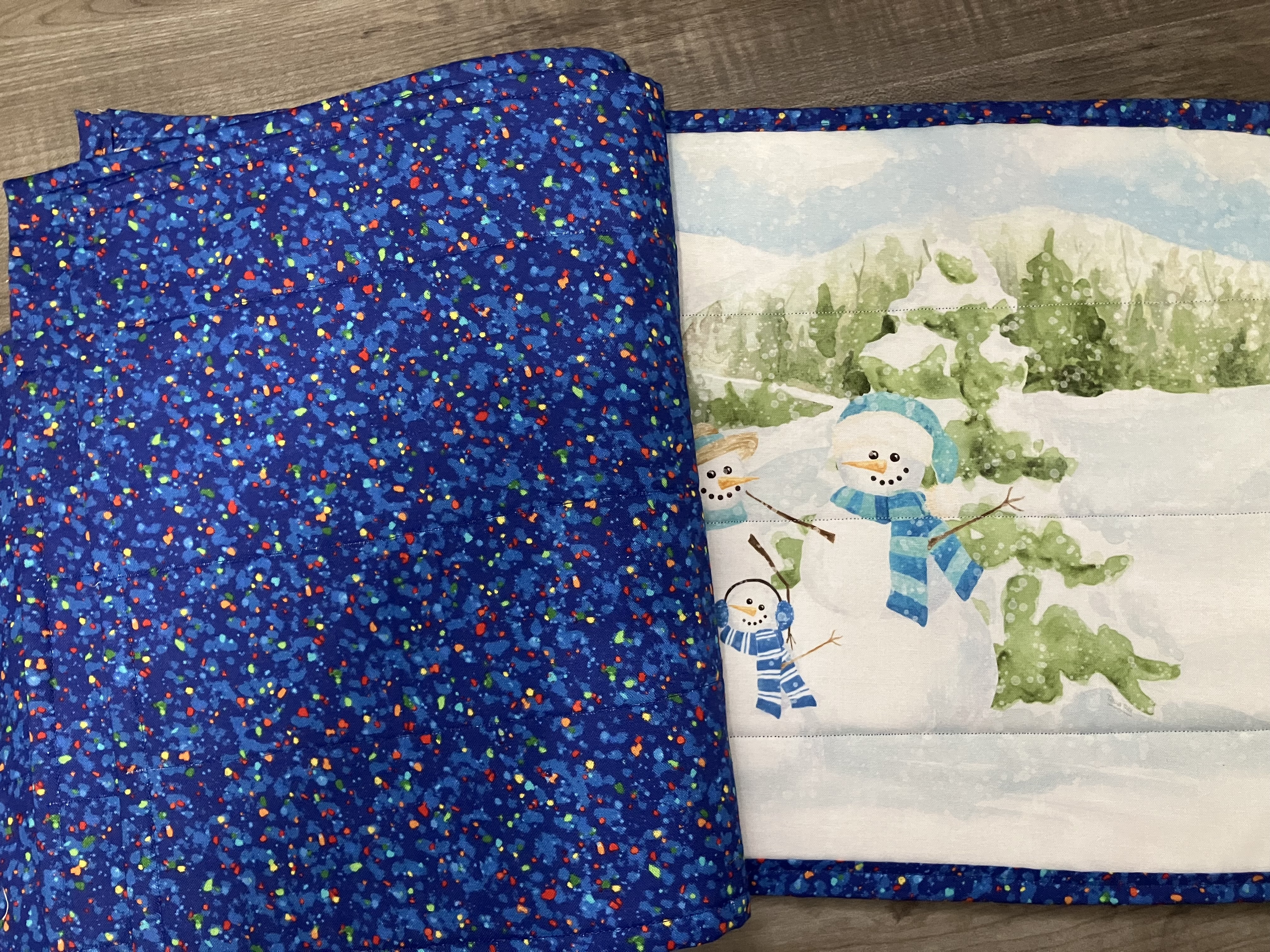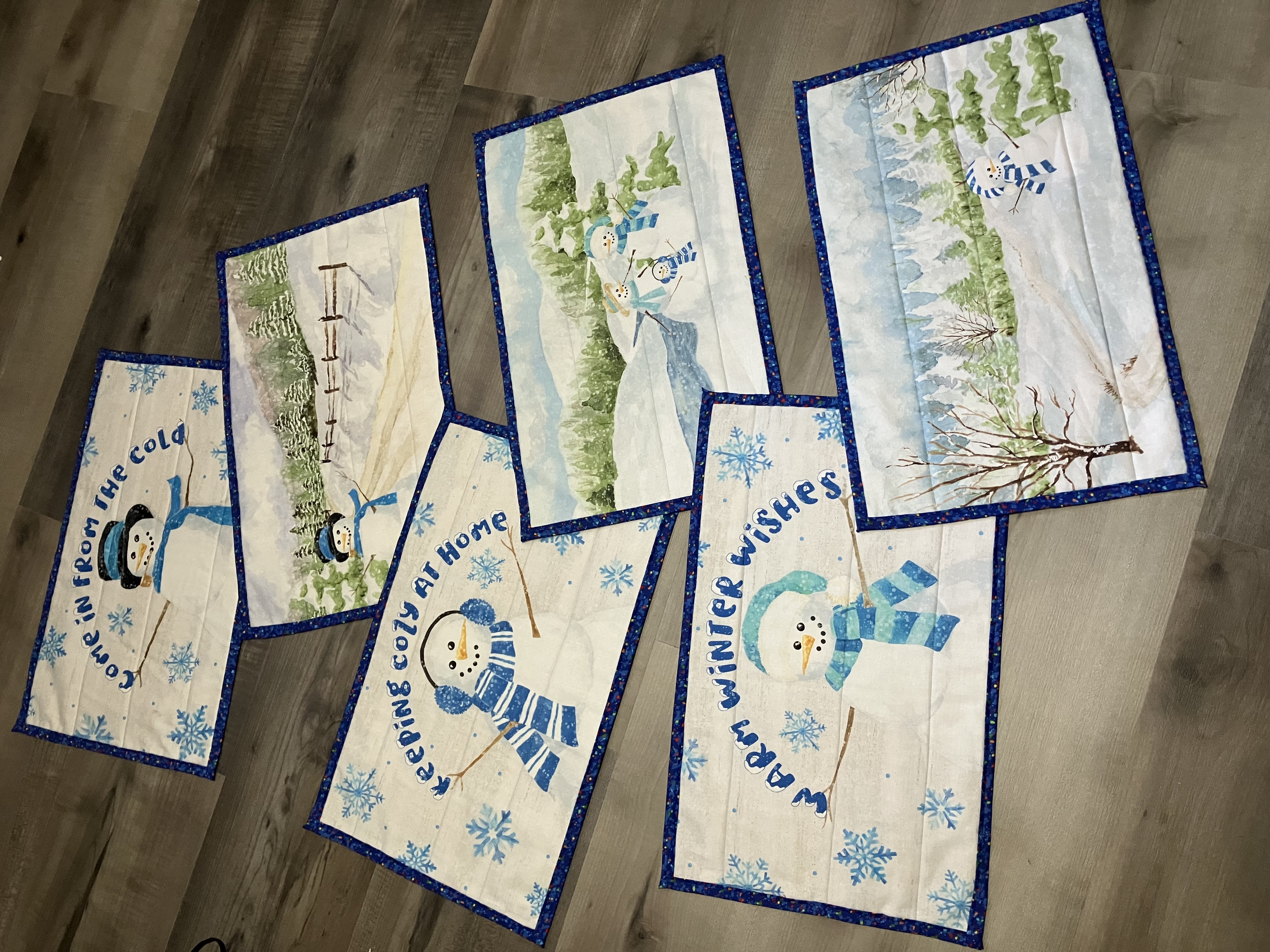 A set of 6 placemats with a differnet snowy scene on each; featuring snowmen, snow flakes and pine trees. Great for a winter table!