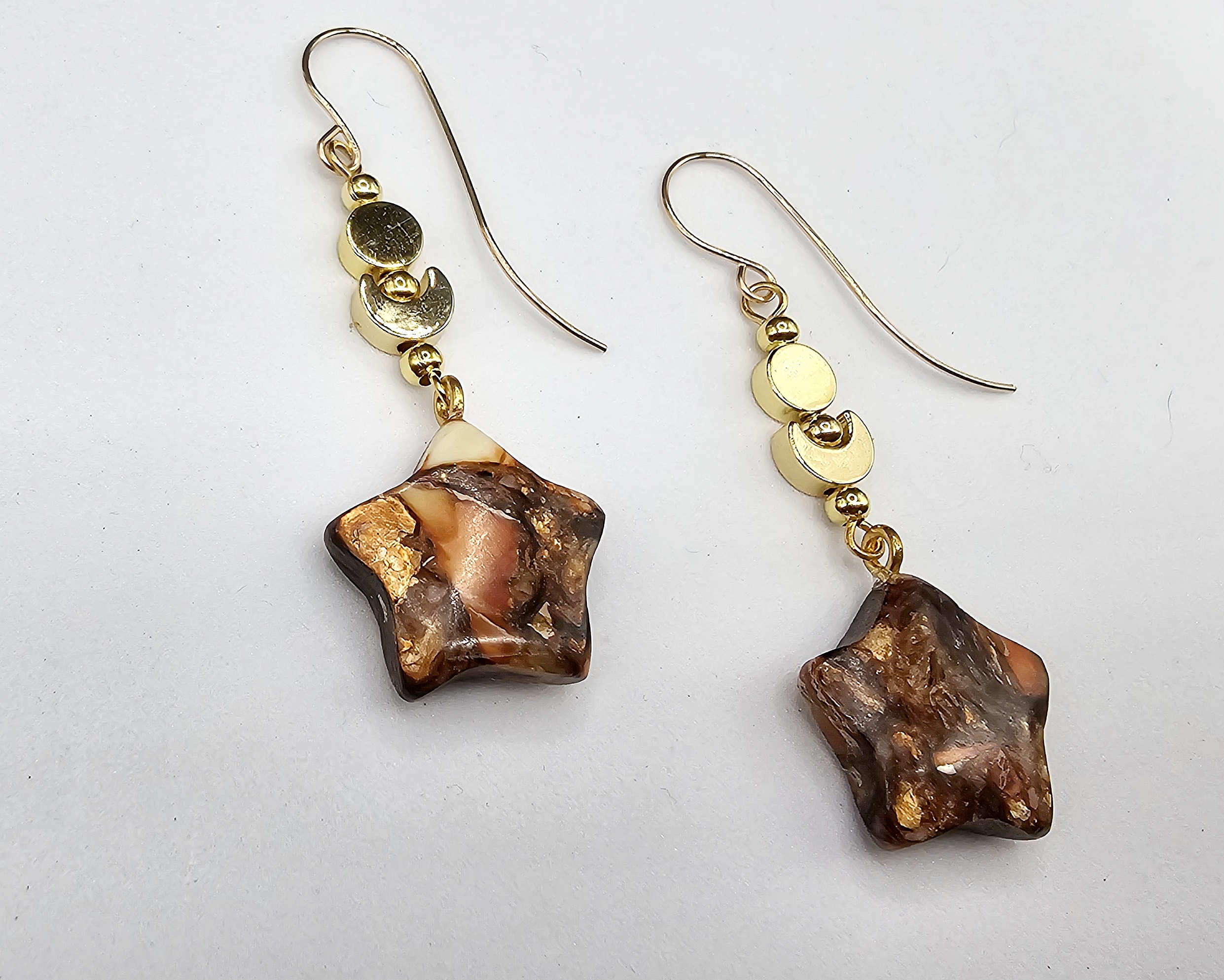 Add celestial sparkle and shine to your wardrobe with these handmade jasper star earrings. Each pair features earthy, richly patterned jasper stars that radiate warmth and strength, paired with gold-plated brass moon phase accents for a mystical, balanced design. At approximately 2 inches long, they hang from 14k gold-filled earring wires, combining durability with elegance.