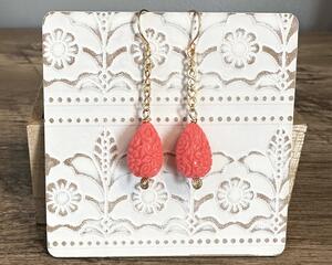 Floral Pink Carved Coral Teardrop Bead Earrings, 2.8 Inches Long
