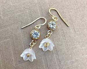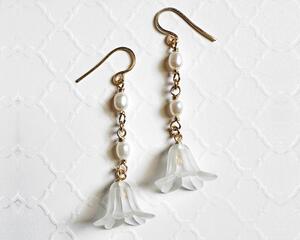 Wire Wrapped White Flower Pearl Drop Earrings, 2.3 Inches Long