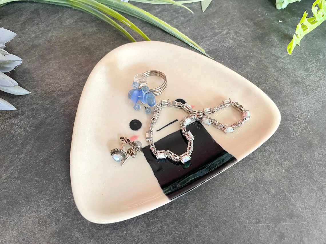 Ceramic Trinket dish that looks like a cute Japanese onigiri. Every piece is handmade with stoneware clay, hand painted underglaze with SpeedBall brand, and a 100% food safe lead free clear glaze by Mayco. Final kiln temp is cone 6 so its microwave and dishwasher safe.