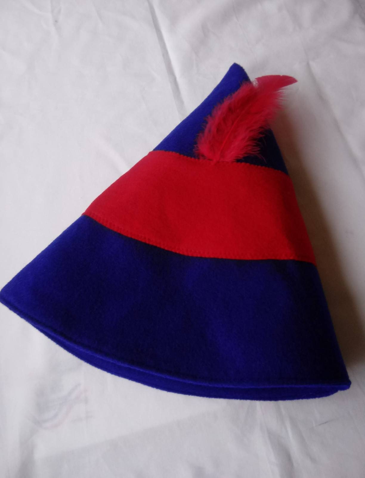 The pink one shown is made from thick wool blend felt with a polyester felt red stripe that is stitched in place and a real red feather! Fully lined and stiffened to hold its shape!