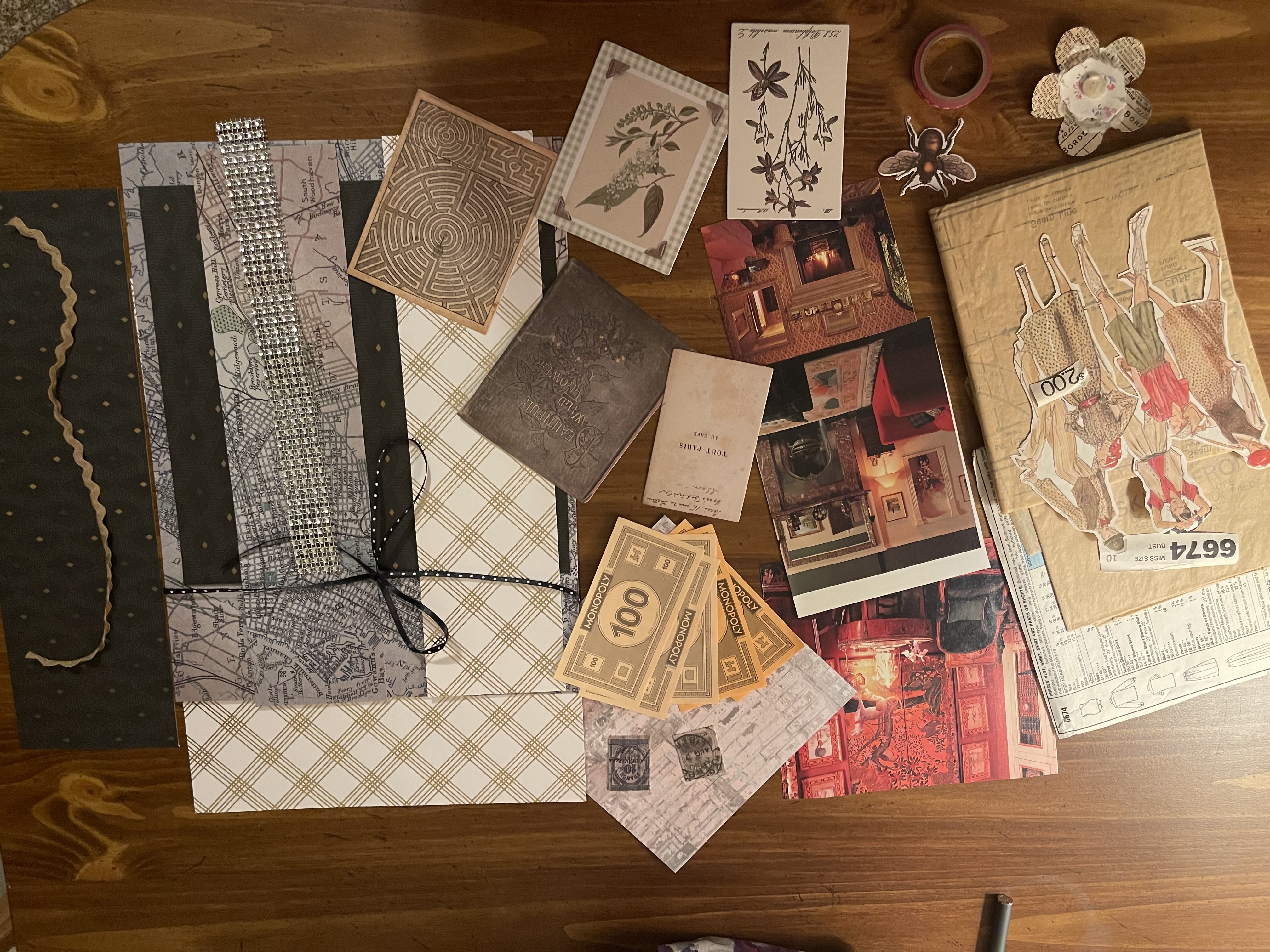 This is a collection of paper, embellishments, vintage sewing pattern cut-outs, washi tape and other interesting items to make creative junk journal or scrapbooking pages.