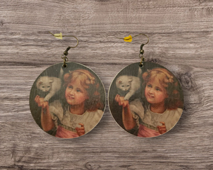 Vintage-Inspired Girl & Kitten Wooden Decoupage Earrings – Cl...