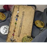 Chain necklace with an intricate key pendant, red glass heart charm, and red crystal-cut circle. Chain measures 33 inches. No clasp.