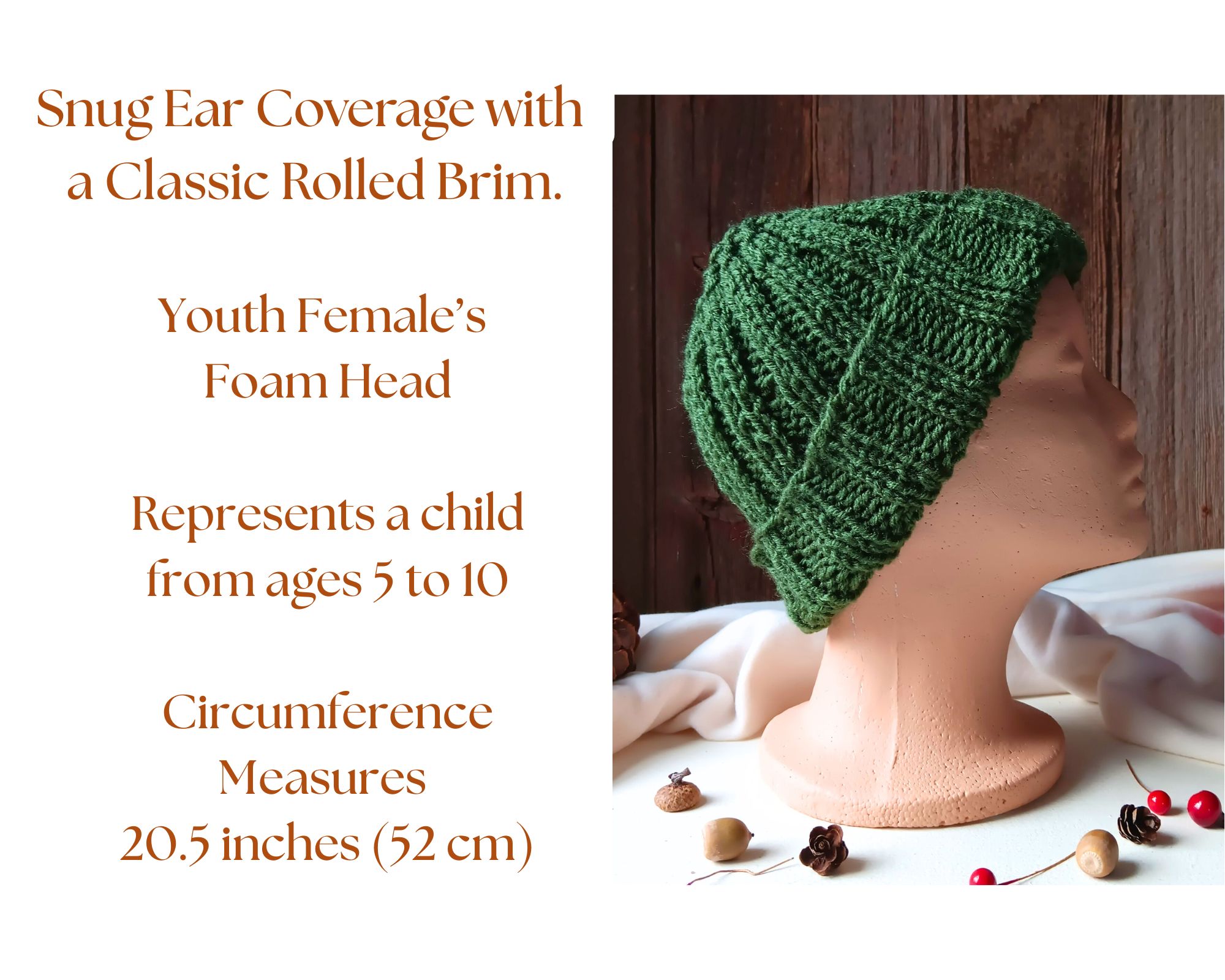 Soft, cozy, and handmade for younger kids, this rustic green acrylic hat brings cheerful warmth to chilly days — without any wool.