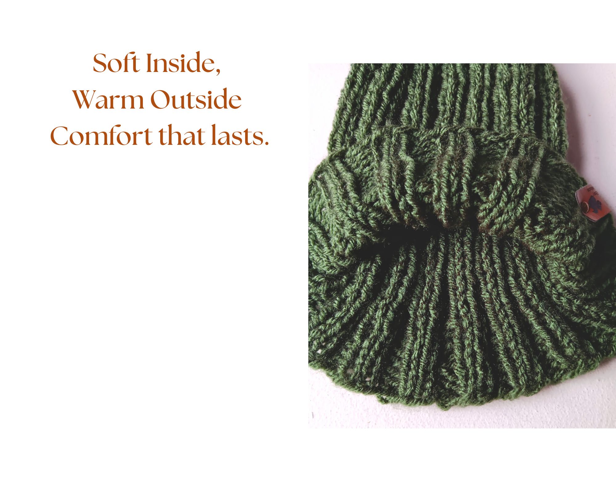 Each stitch is thoughtfully knit with a green acrylic yarn that’s warm without being itchy, soft to the touch, and flexible enough for growing kids.