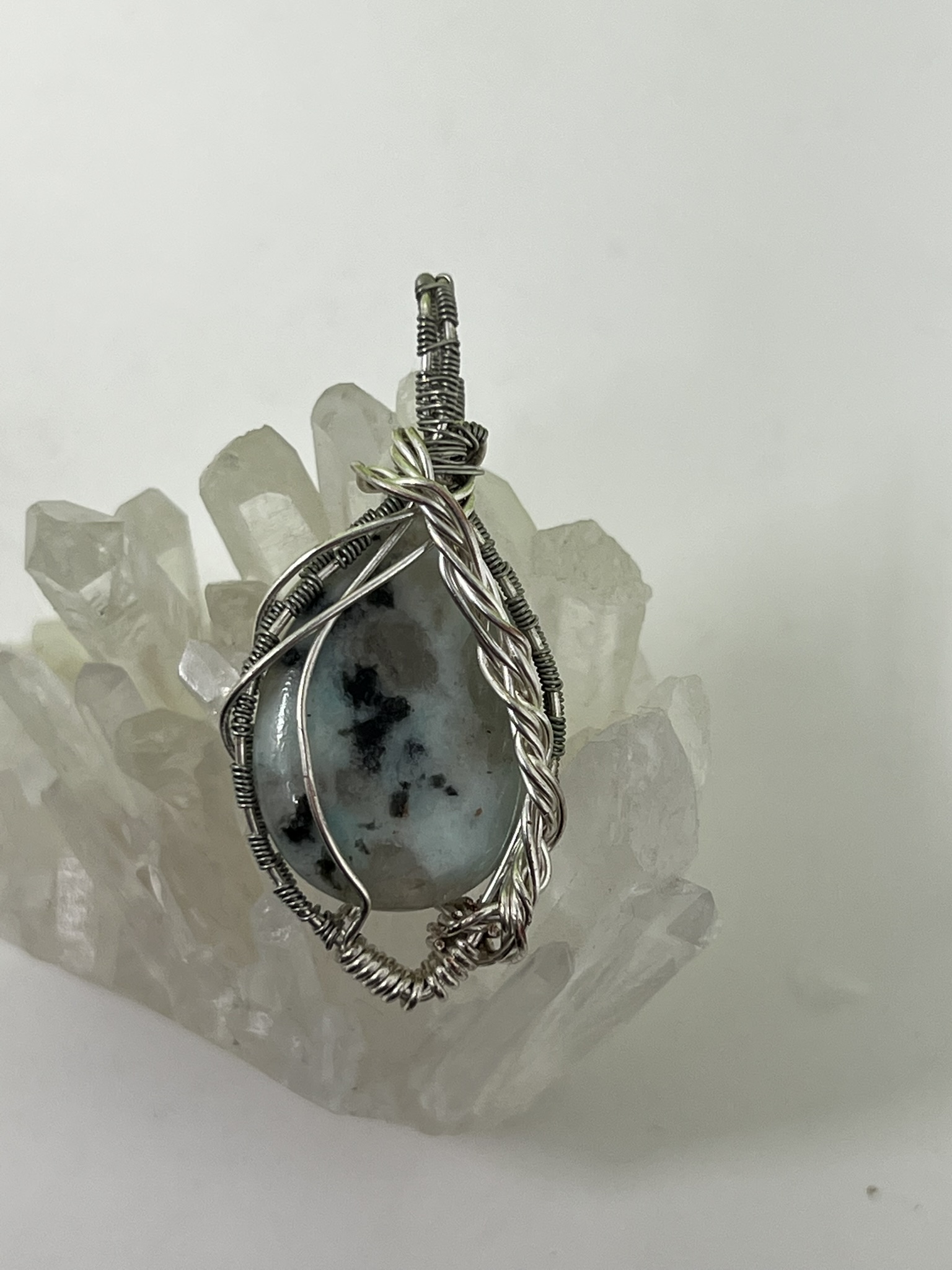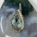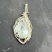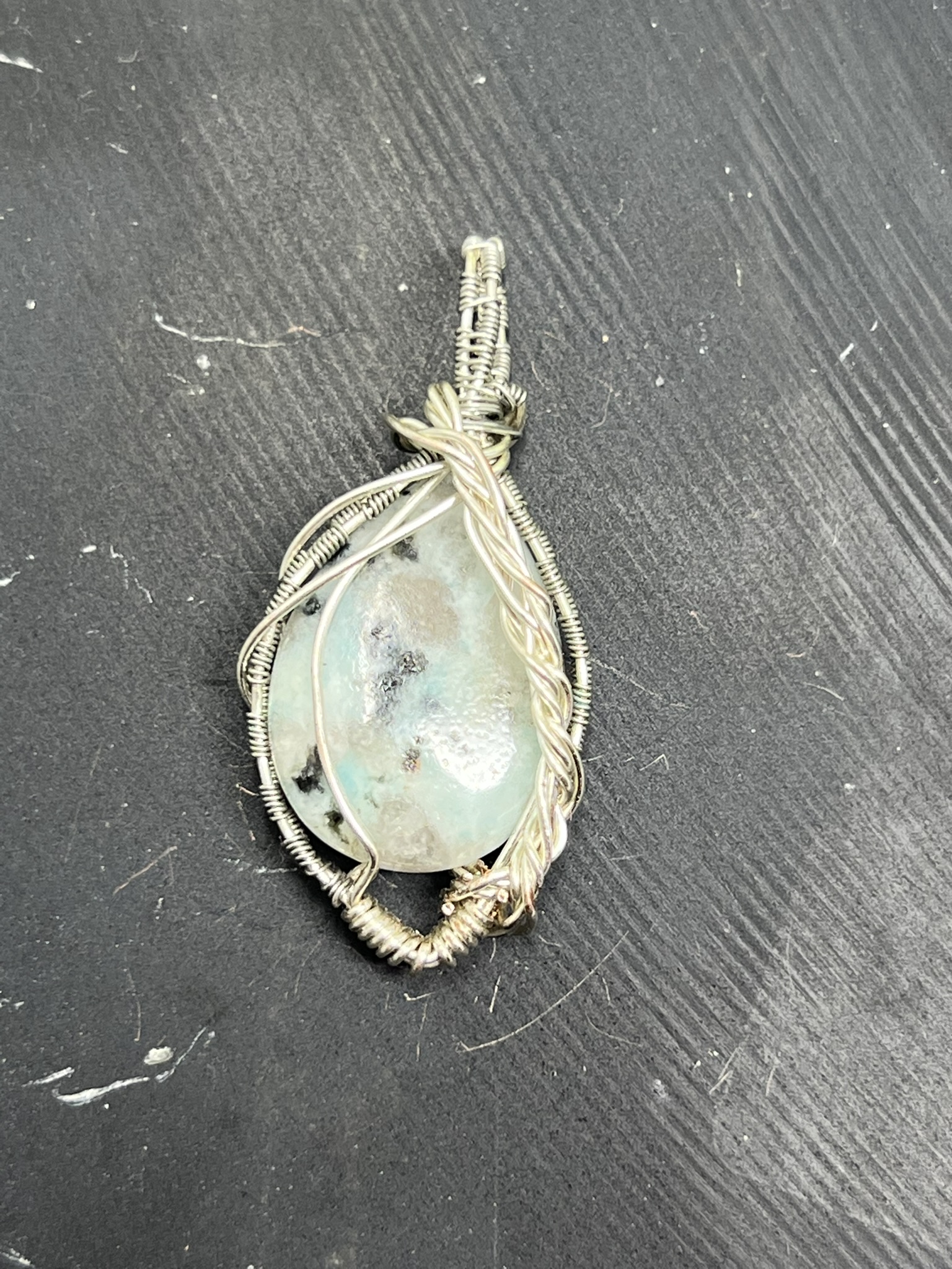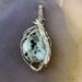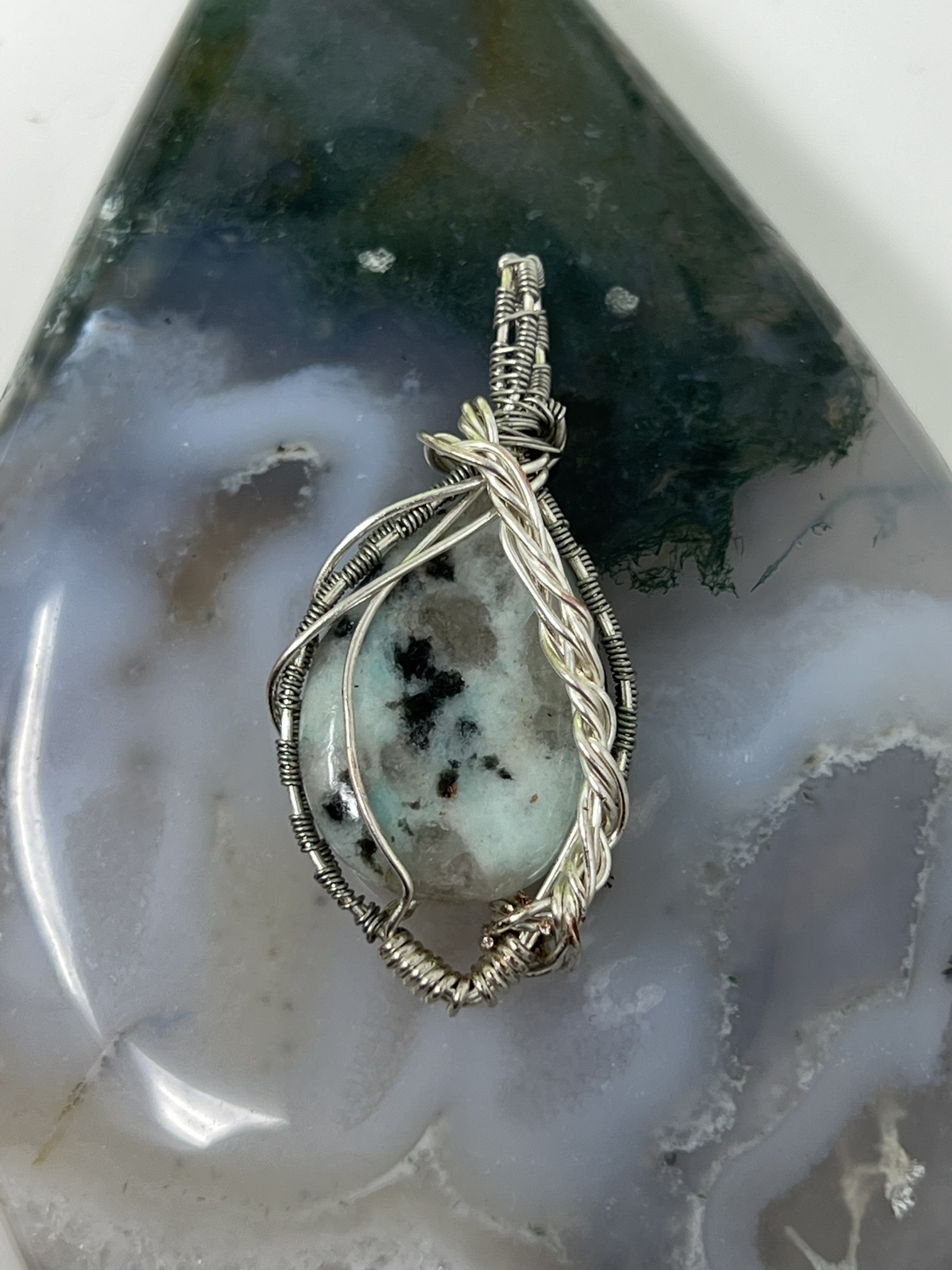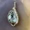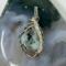 This fun pendant features a kiwi jasper cabochon that has been wrapped in silver colored copper wire. This piece is created by taking 4 pieces of 20 gauge silver colored, copper wire and connecting them together at the bottom with 22 gauge silver colored, copper wire. The edge framing is done by weaving 26 gauge silver colored copper wire around 2 pieces of the 20 gauge silver colored, copper wire on each side of the stone. The bail is made by weaving the 26 gauge wire around 2 pieces of the 20 gauge wire. It has a unique twisted braid that goes down one side of the pendant. This piece is handmade in Minnesota.