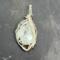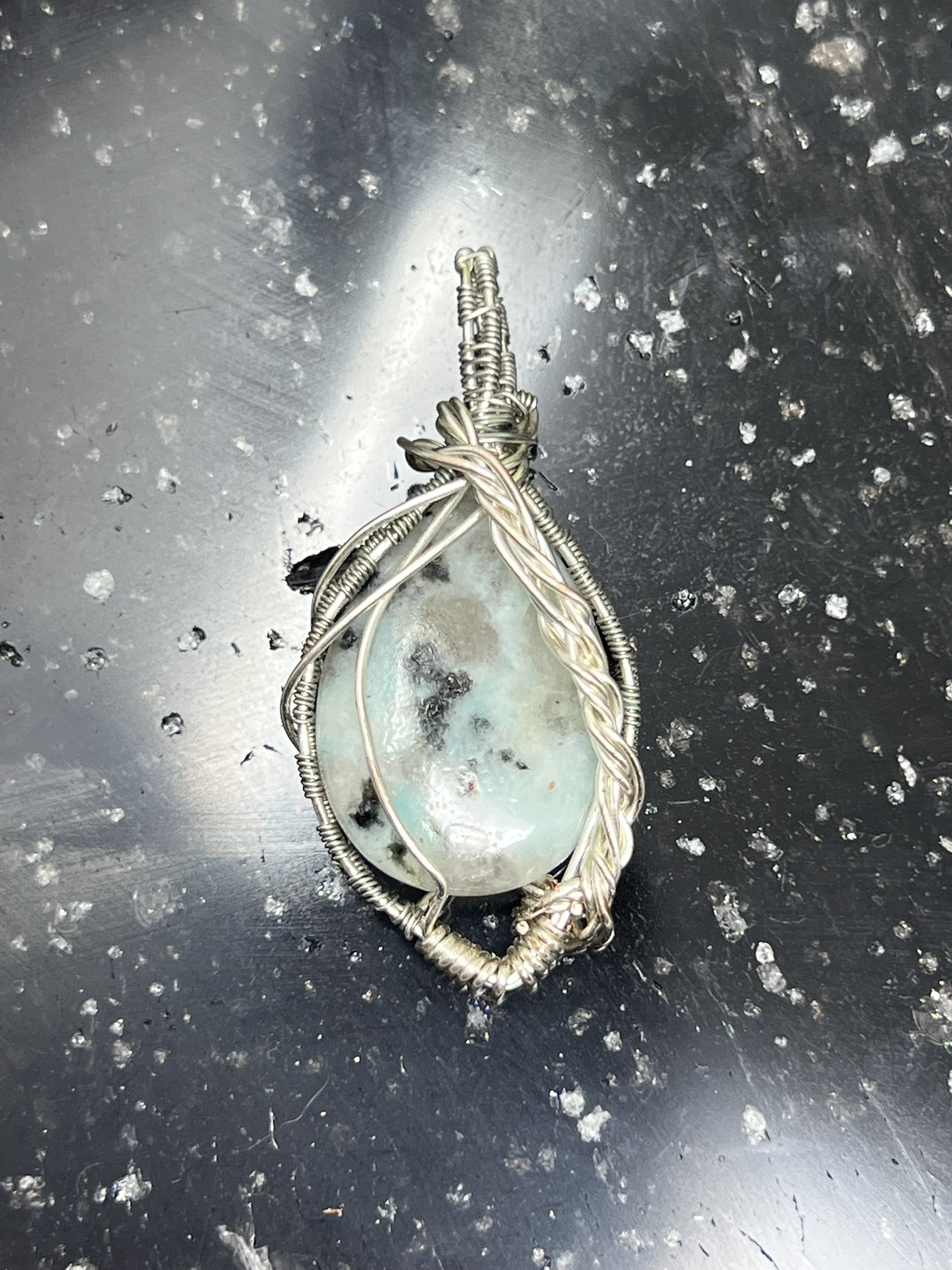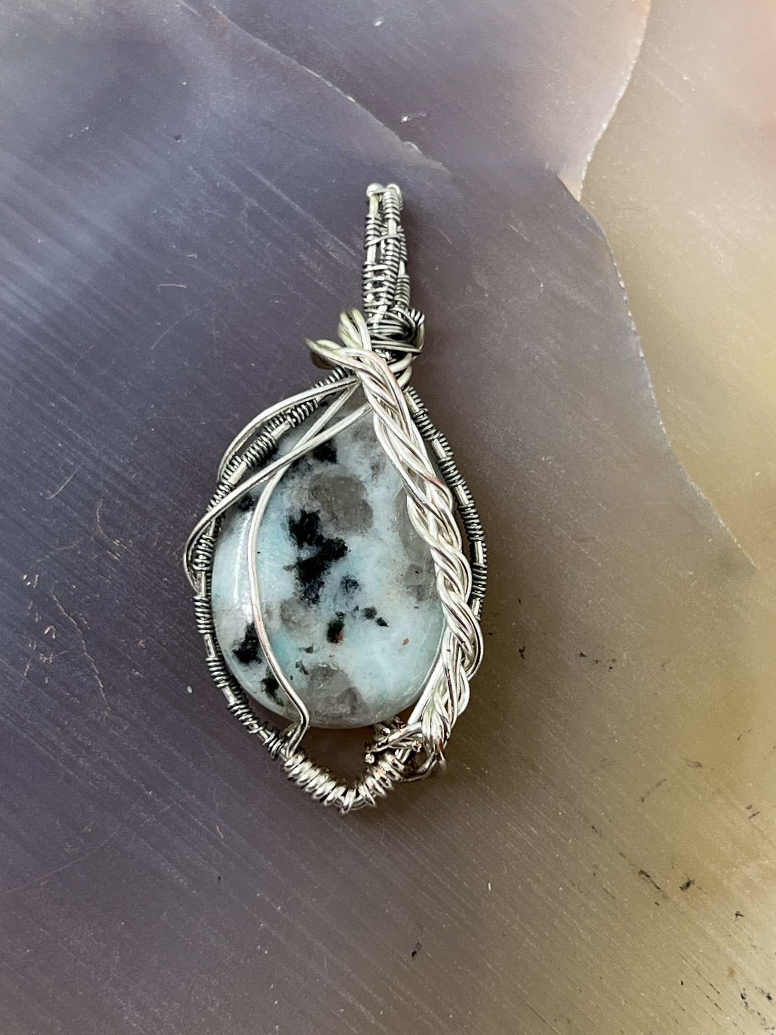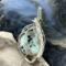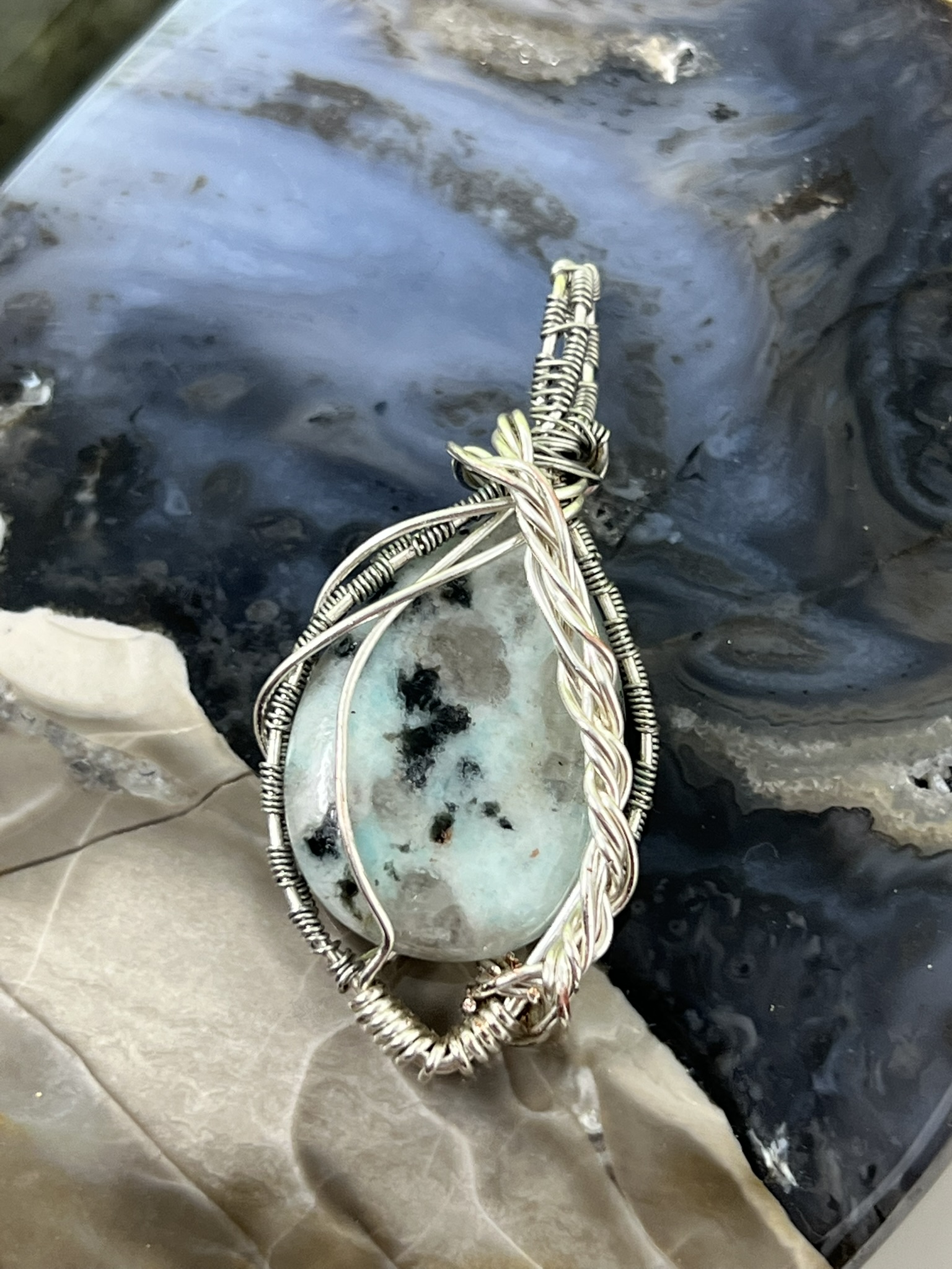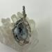 This fun pendant features a kiwi jasper cabochon that has been wrapped in silver colored copper wire. This piece is created by taking 4 pieces of 20 gauge silver colored, copper wire and connecting them together at the bottom with 22 gauge silver colored, copper wire. The edge framing is done by weaving 26 gauge silver colored copper wire around 2 pieces of the 20 gauge silver colored, copper wire on each side of the stone. The bail is made by weaving the 26 gauge wire around 2 pieces of the 20 gauge wire. It has a unique twisted braid that goes down one side of the pendant. This piece is handmade in Minnesota.