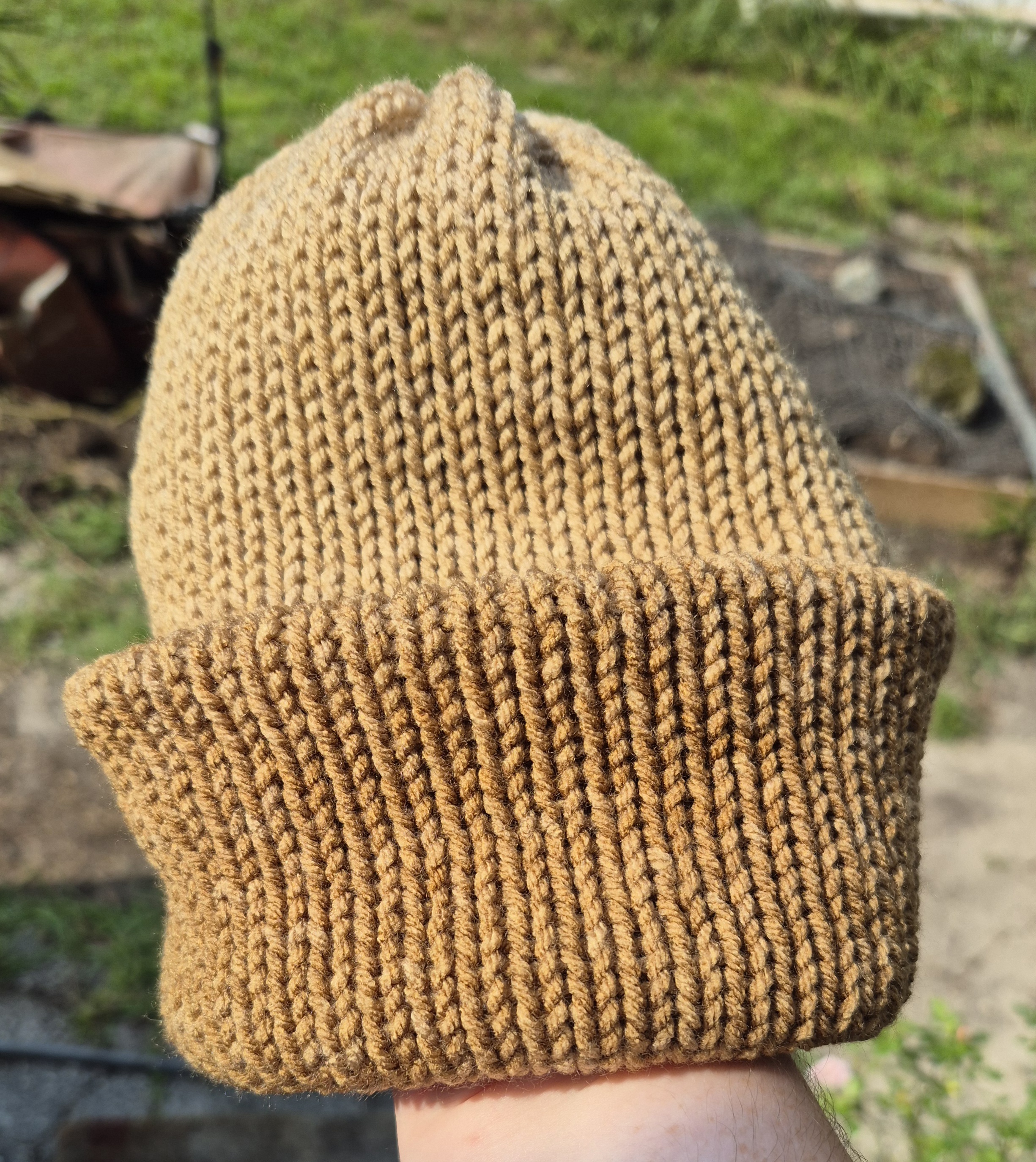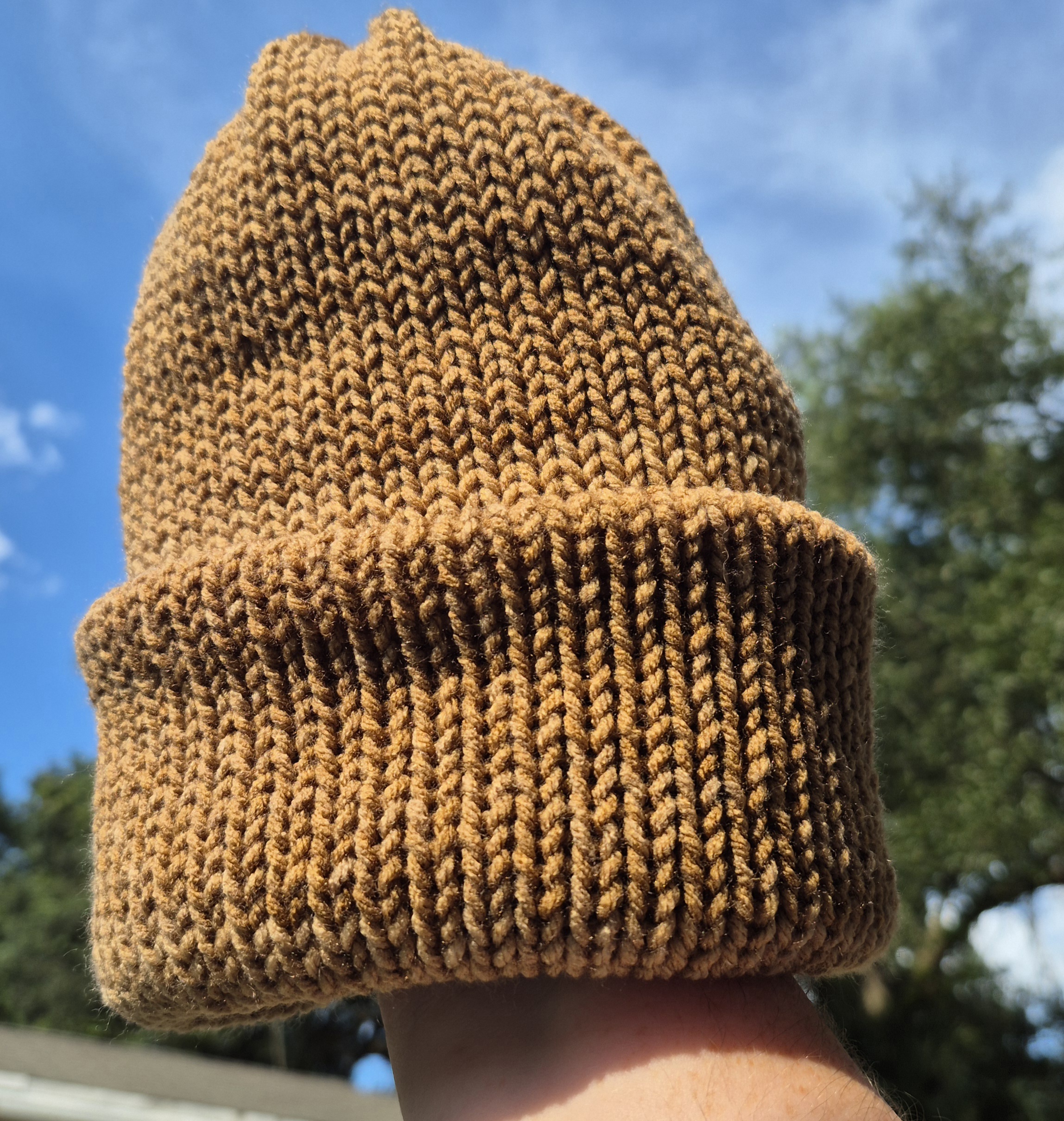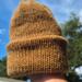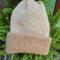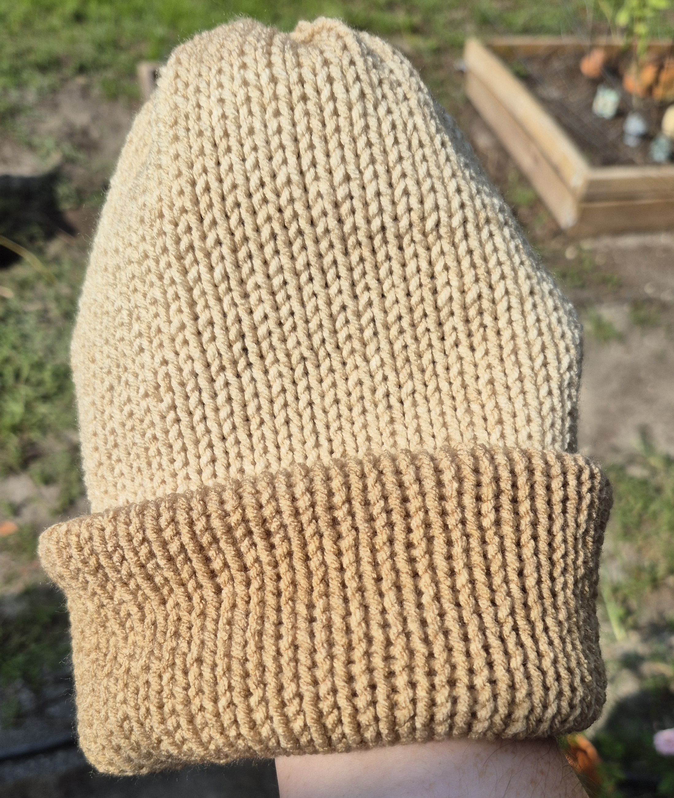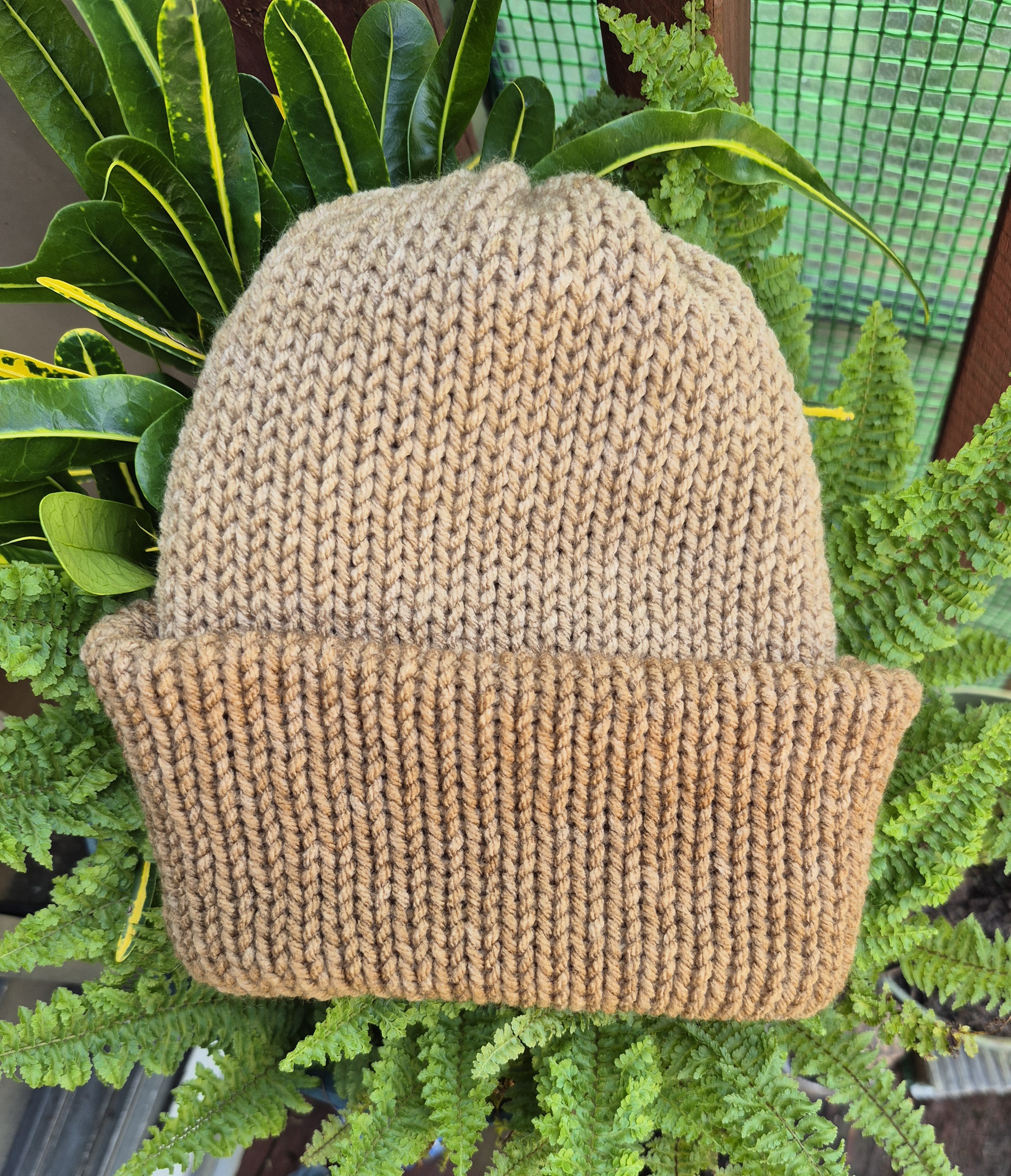 Butterscotch knit reversable beanie, fits a 22 - 24-inch head. Made with a soft acrylic yarn.