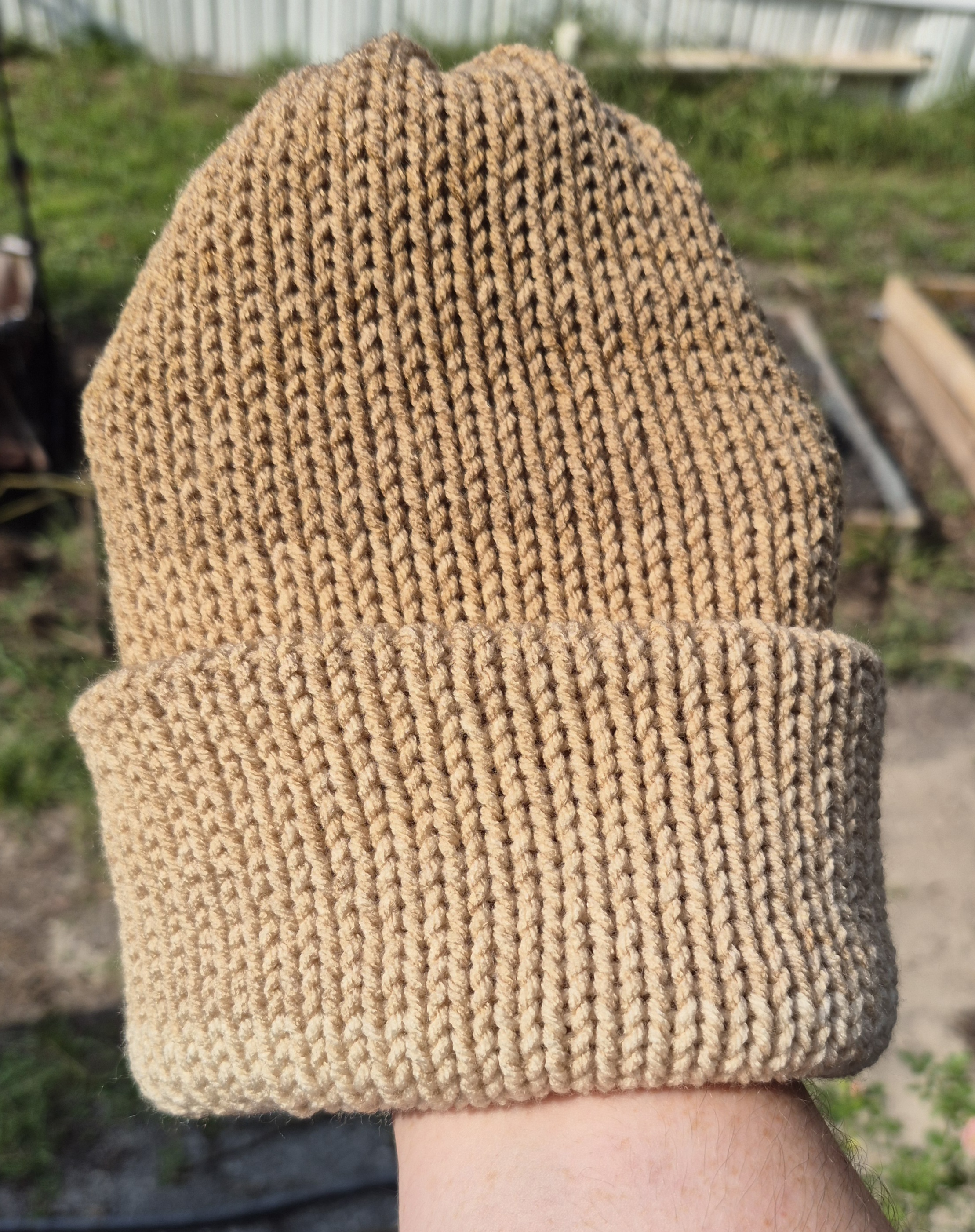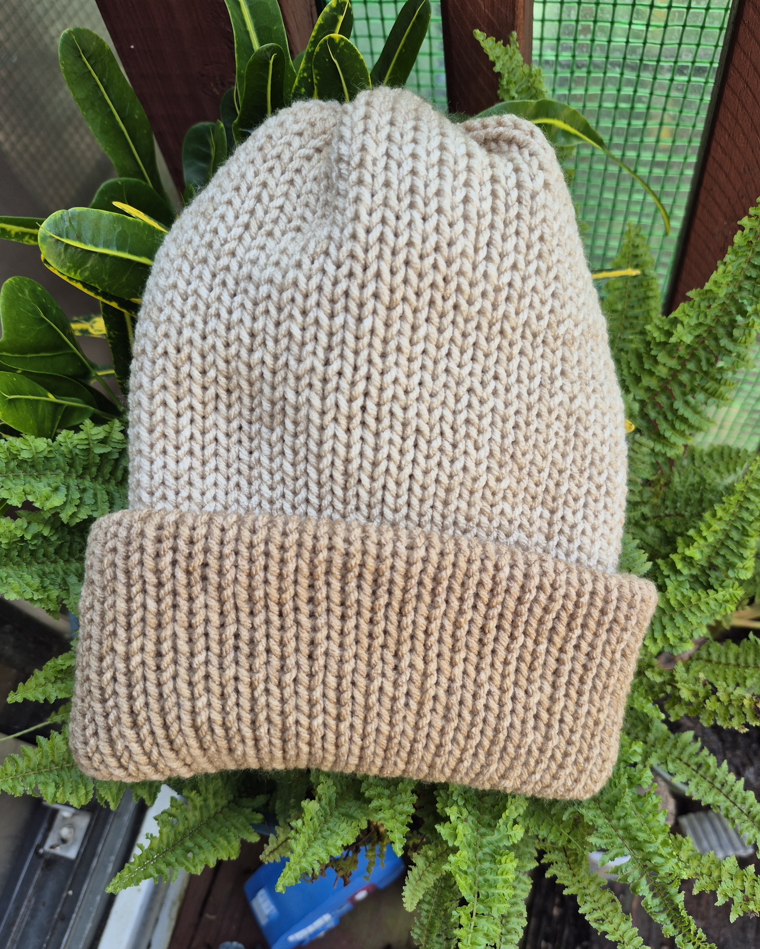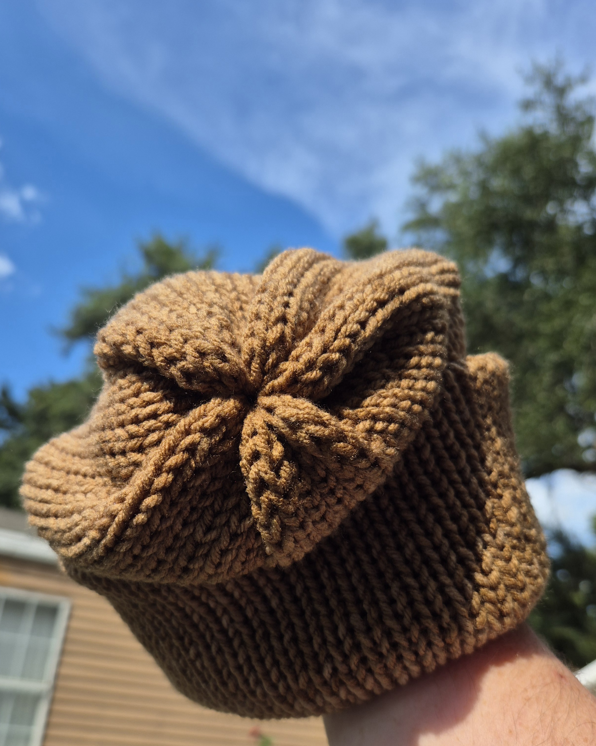 Butterscotch knit reversable beanie, fits a 22 - 24-inch head. Made with a soft acrylic yarn.
