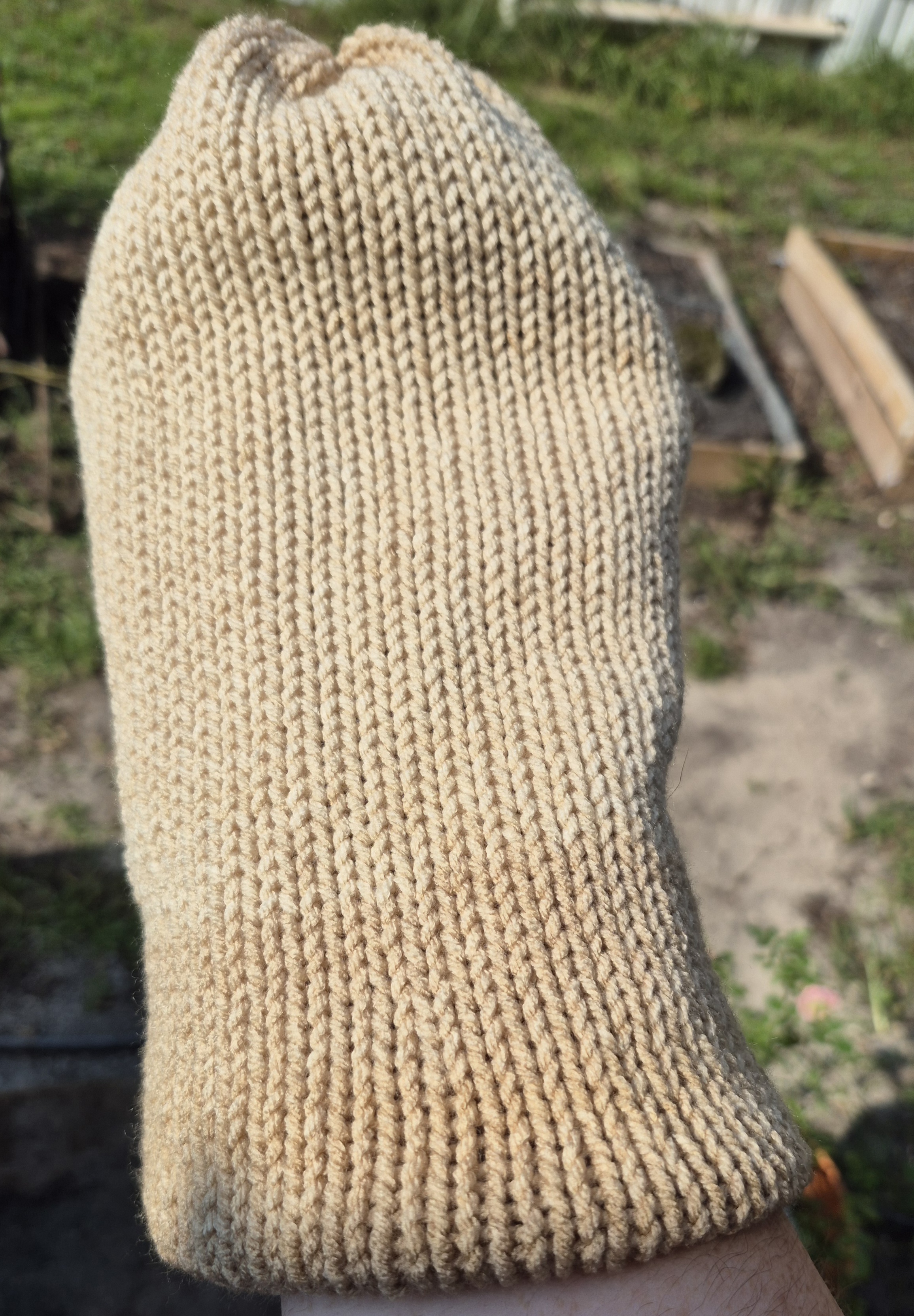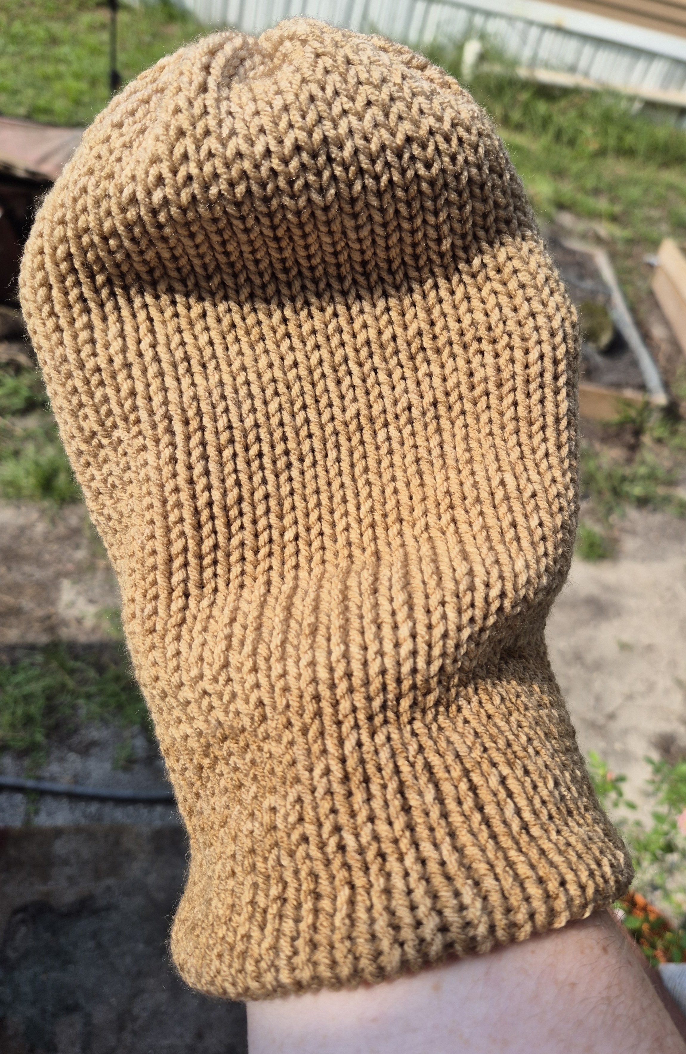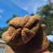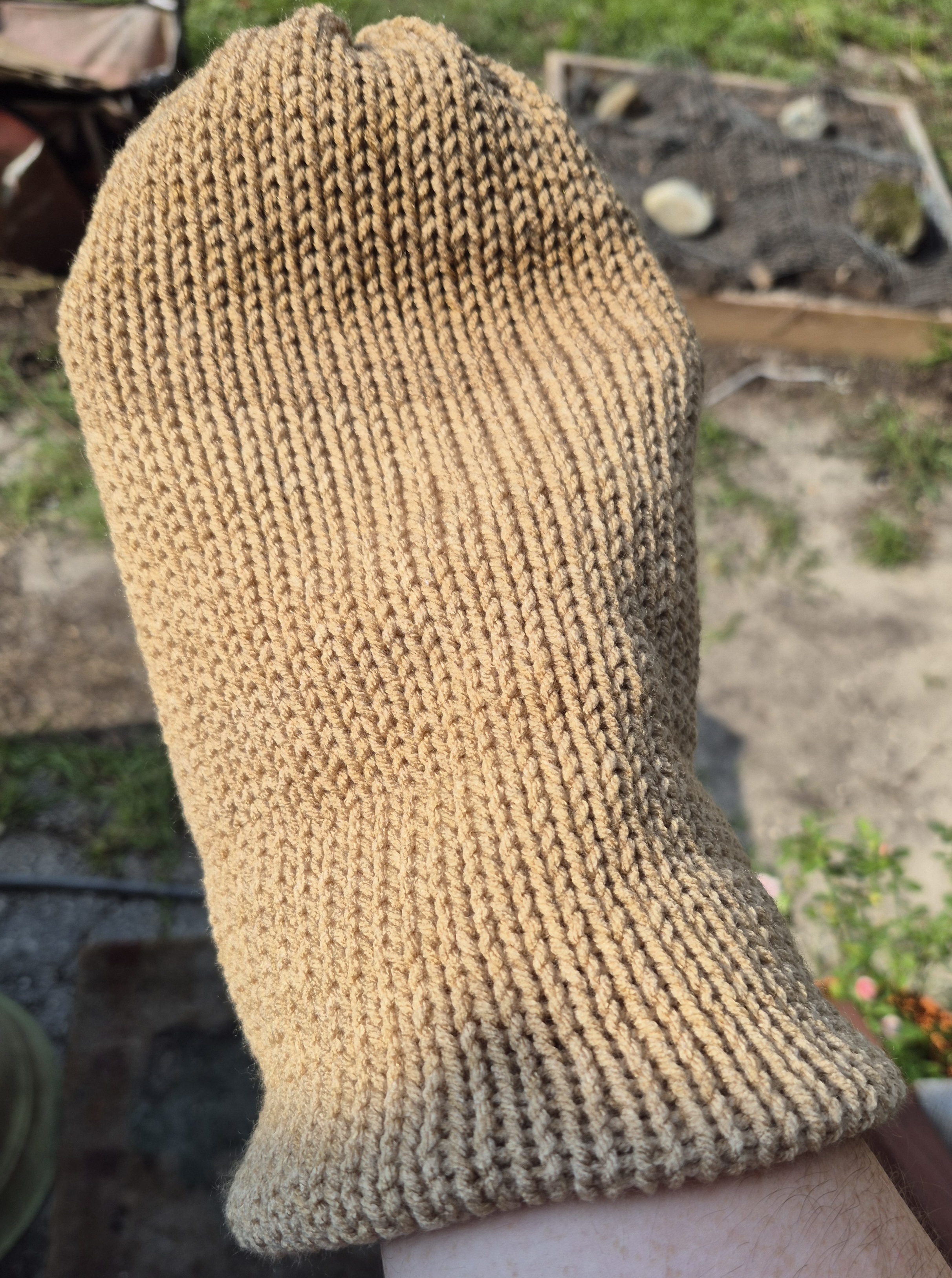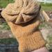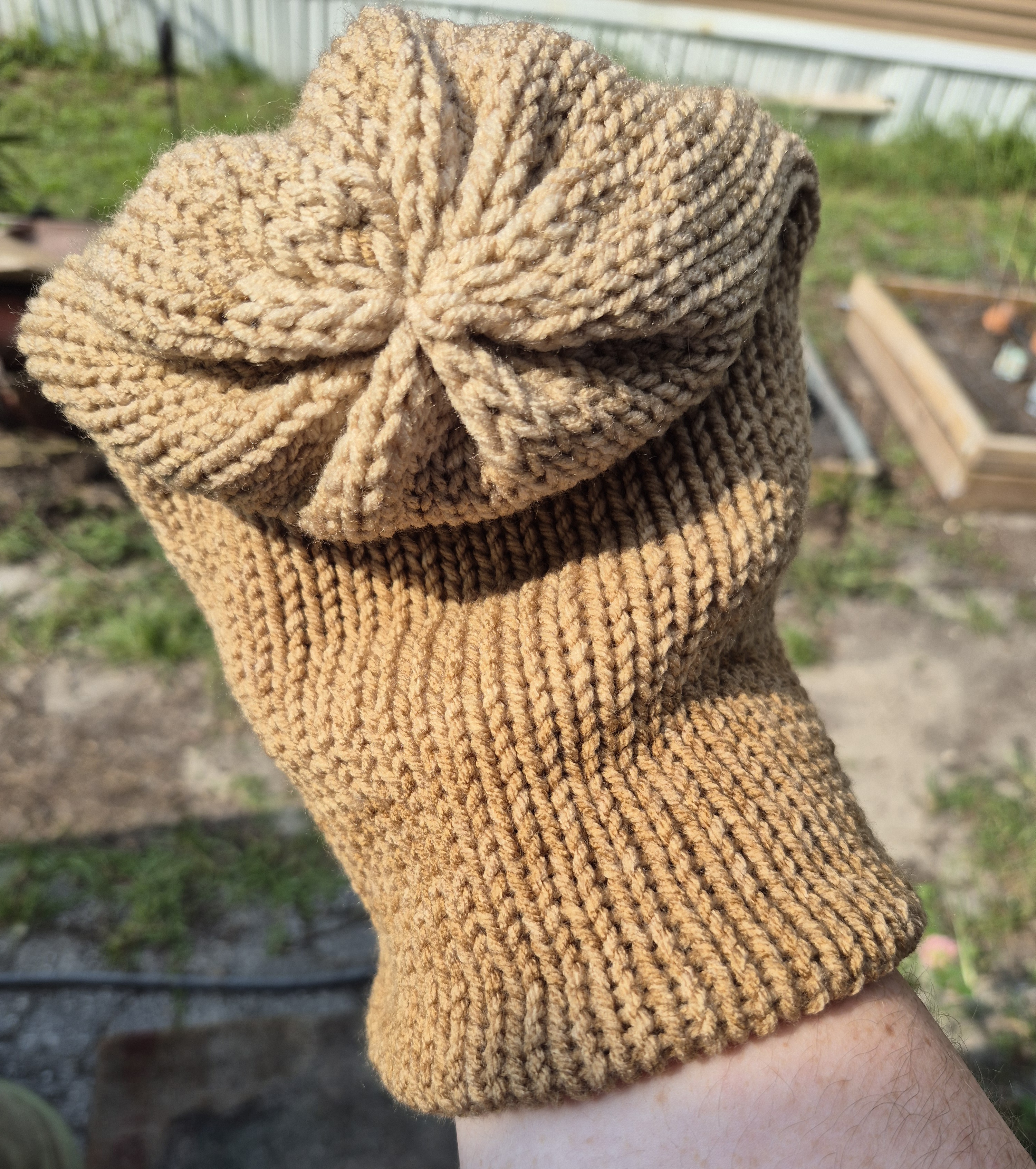 Butterscotch knit reversable beanie, fits a 22 - 24-inch head. Made with a soft acrylic yarn.