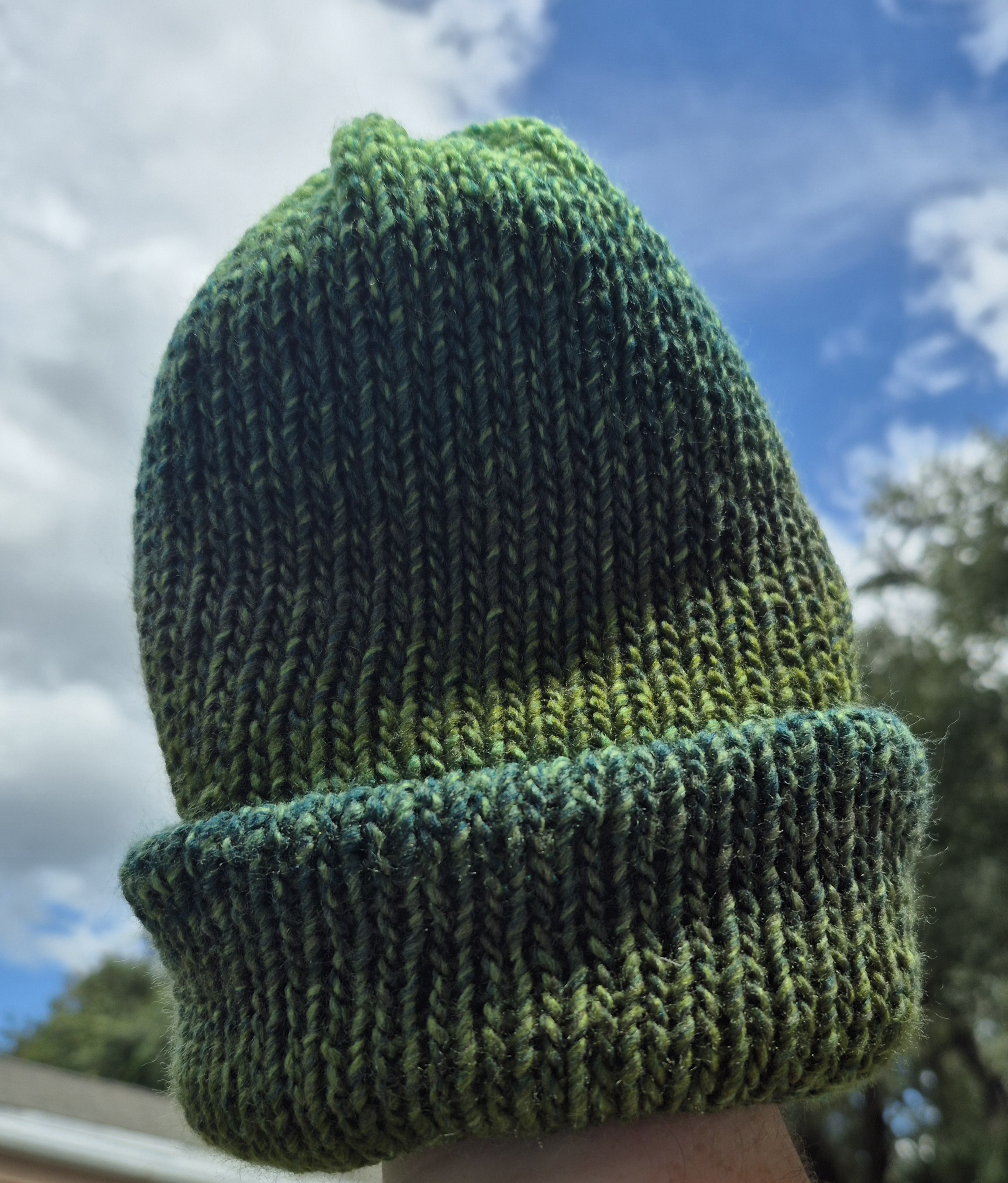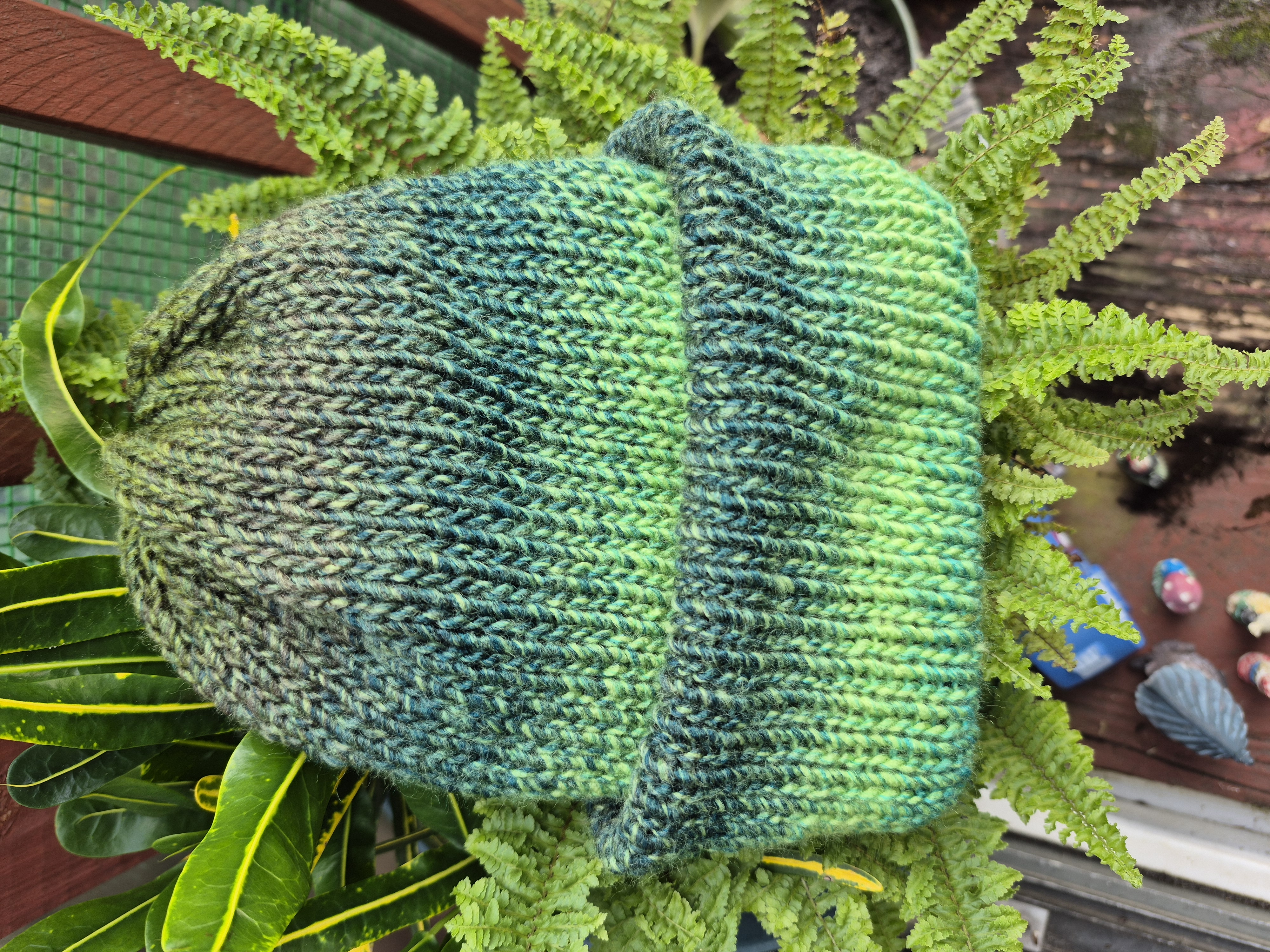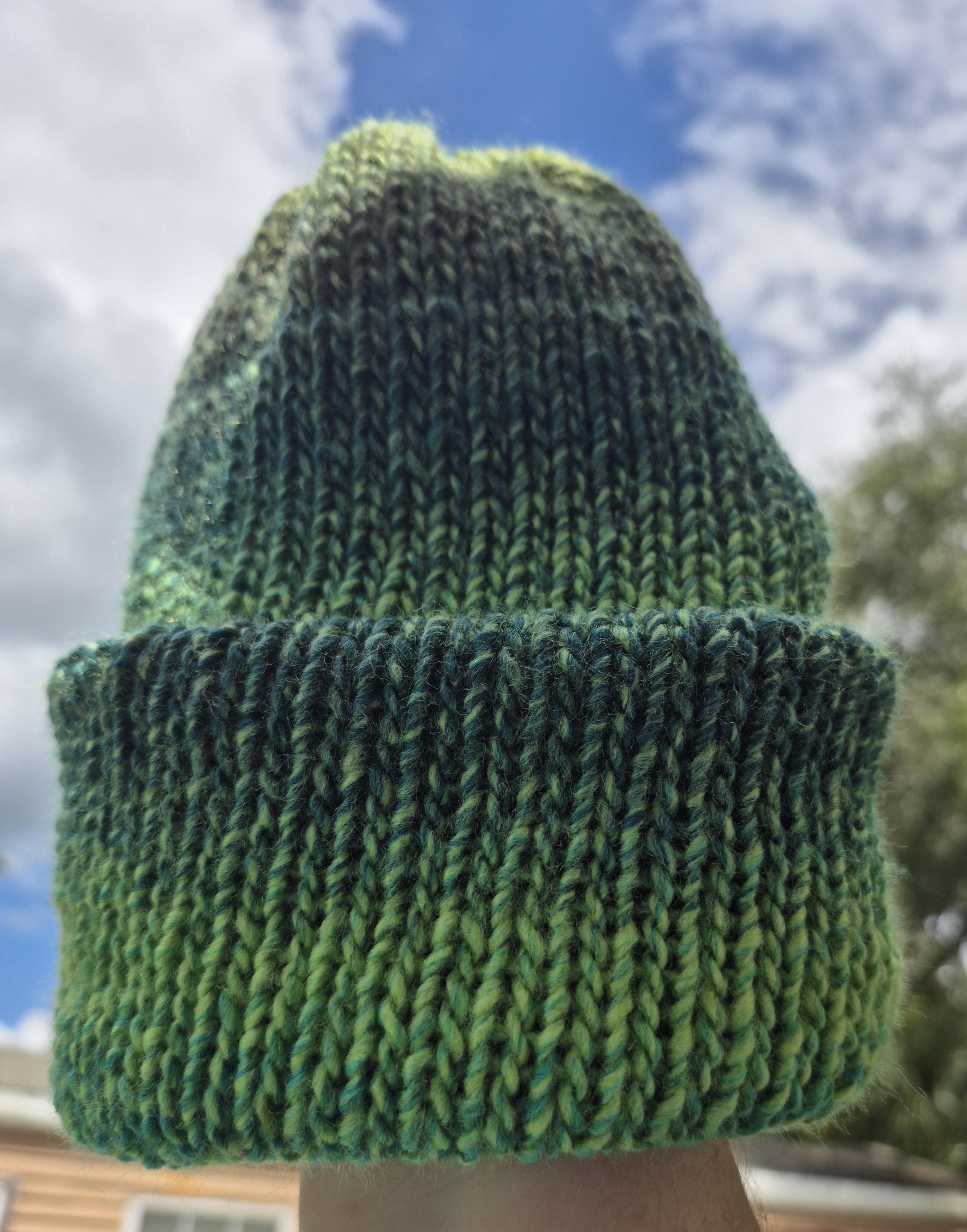 Knit evergreen reversable beanie, fits a 22 - 24-inch head. Made with a soft acrylic yarn.