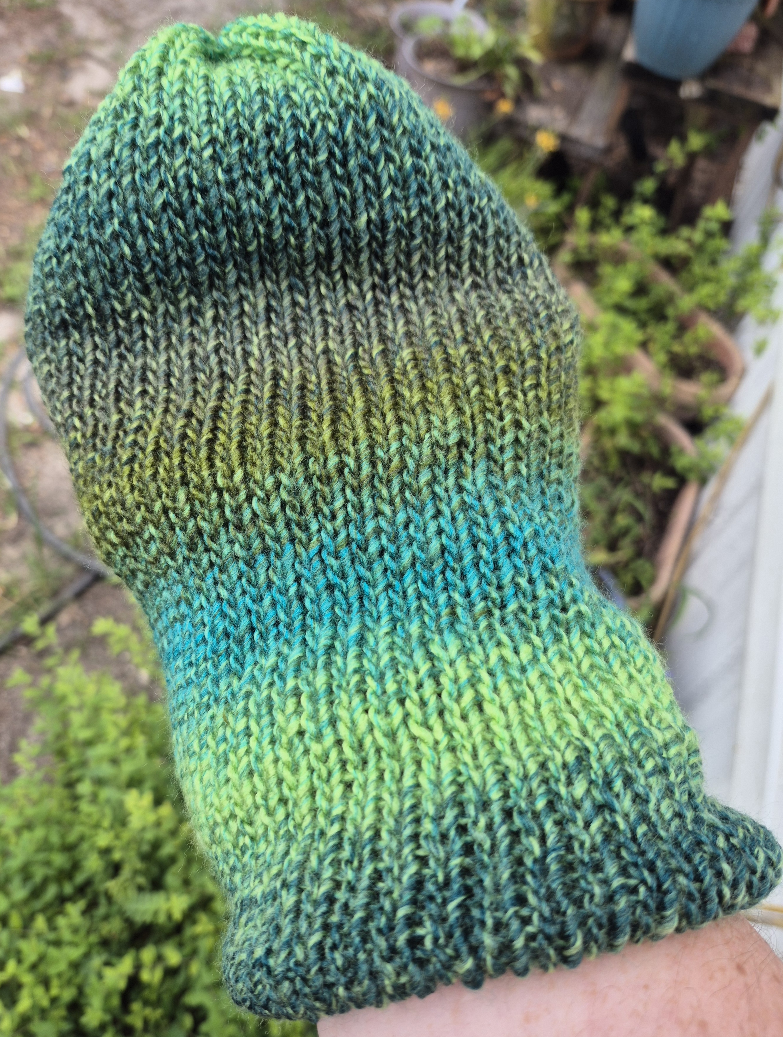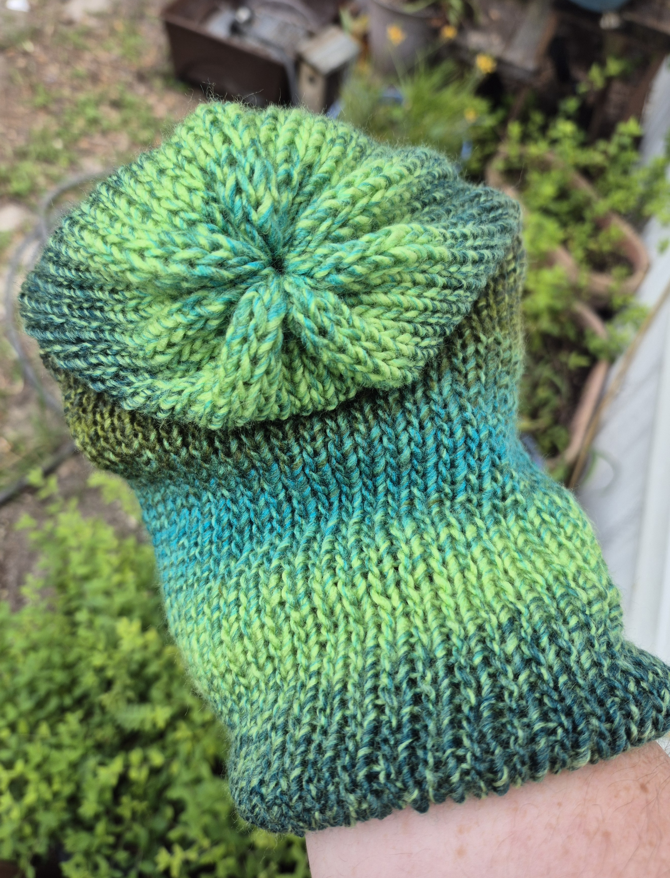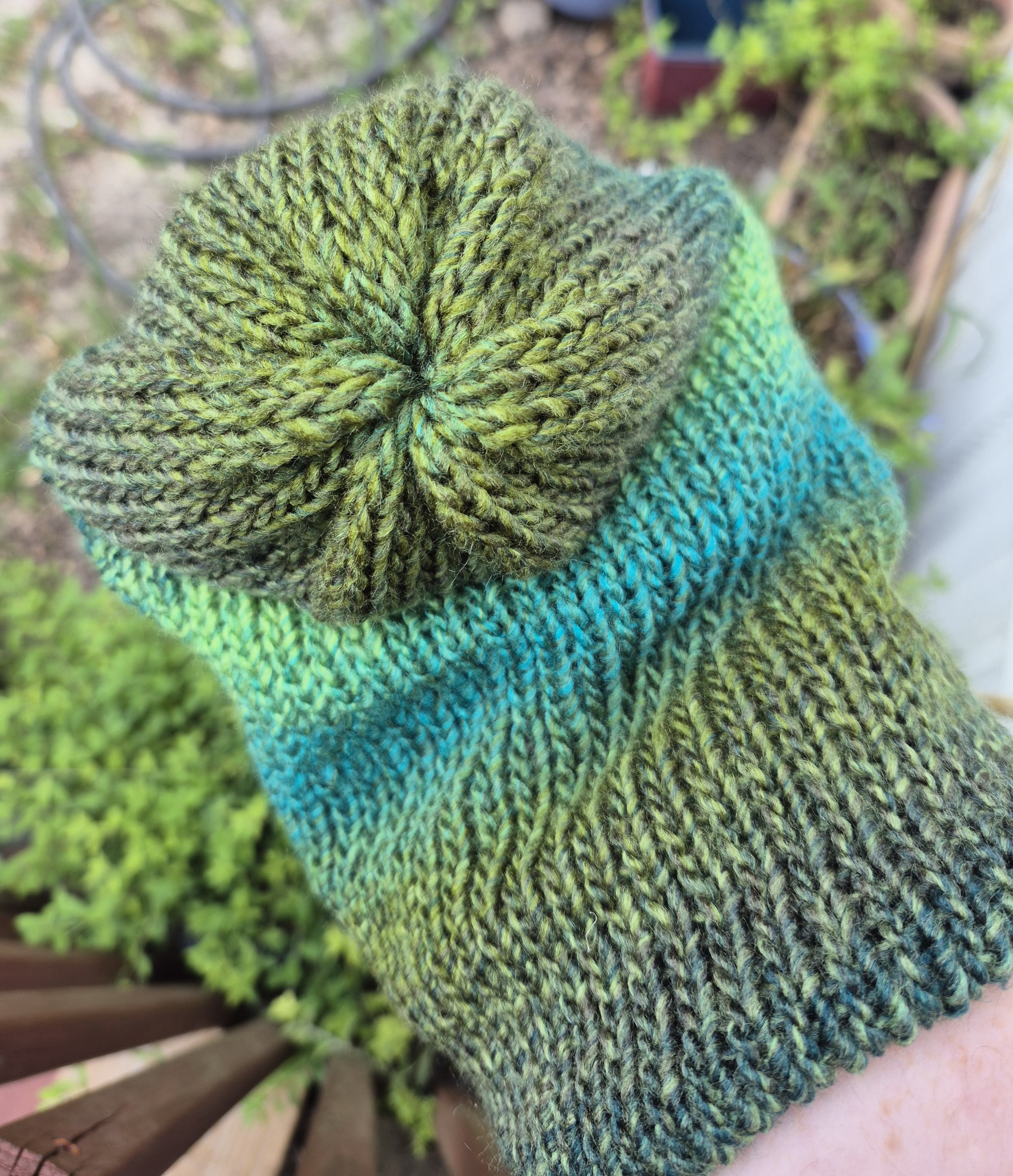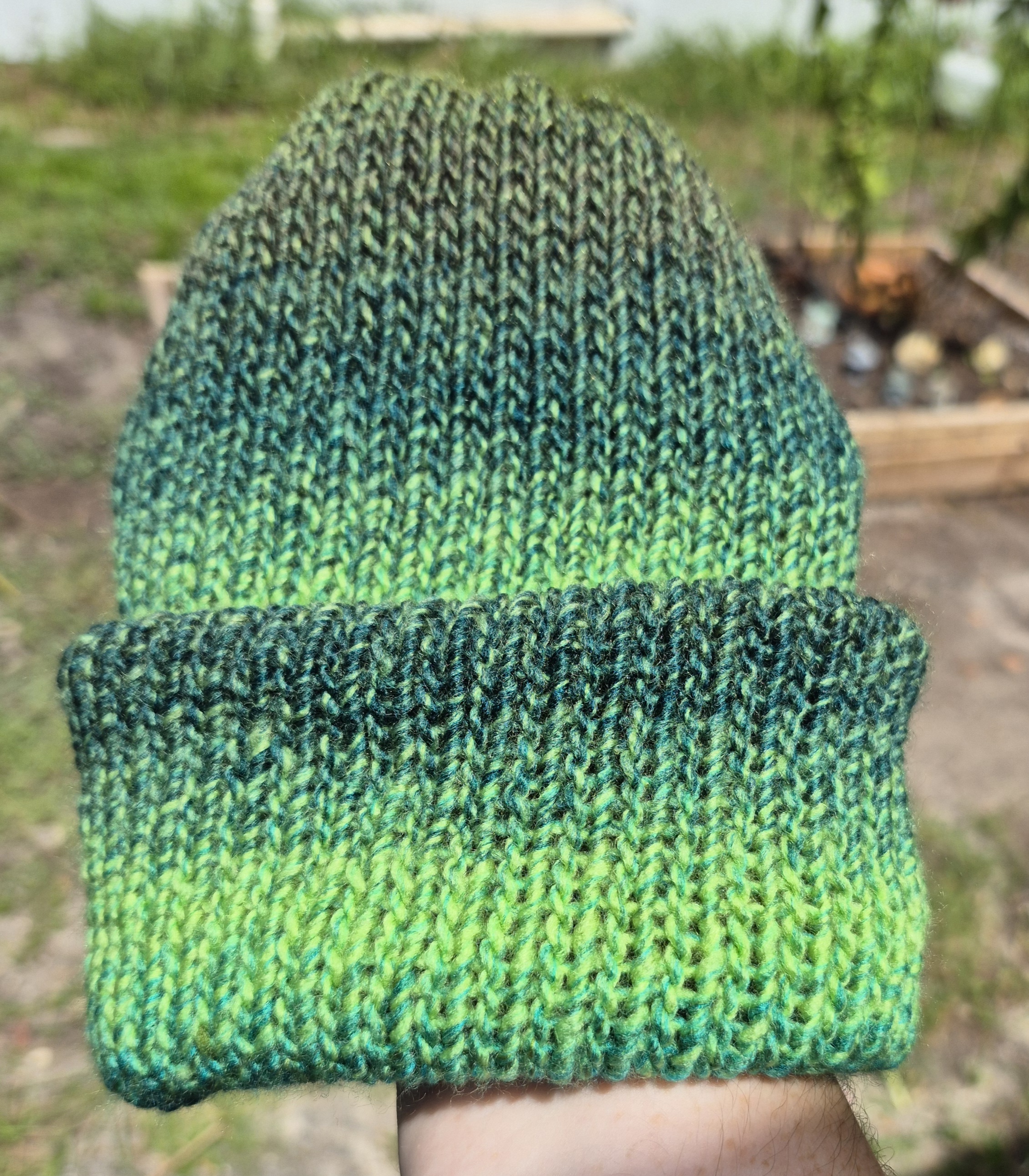Knit evergreen reversable beanie, fits a 22 - 24-inch head. Made with a soft acrylic yarn.