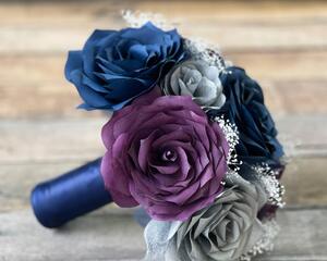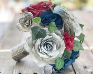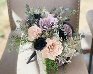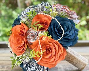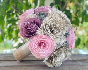 Wedding bouquets, boutonnieres, and corsages made from handcrafted paper flowers using book pages, coffee filters, sheet music, and crepe paper.