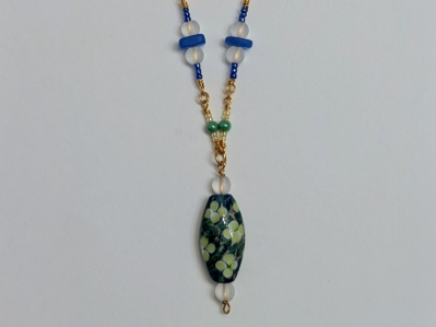 This unique piece was made with two Kumihimo braided sections with gold-plated findings, and multicolored beads complimenting the lampwork focal. The look is eye-catching while the feel is sort of "lacy", delicate, and feminine.