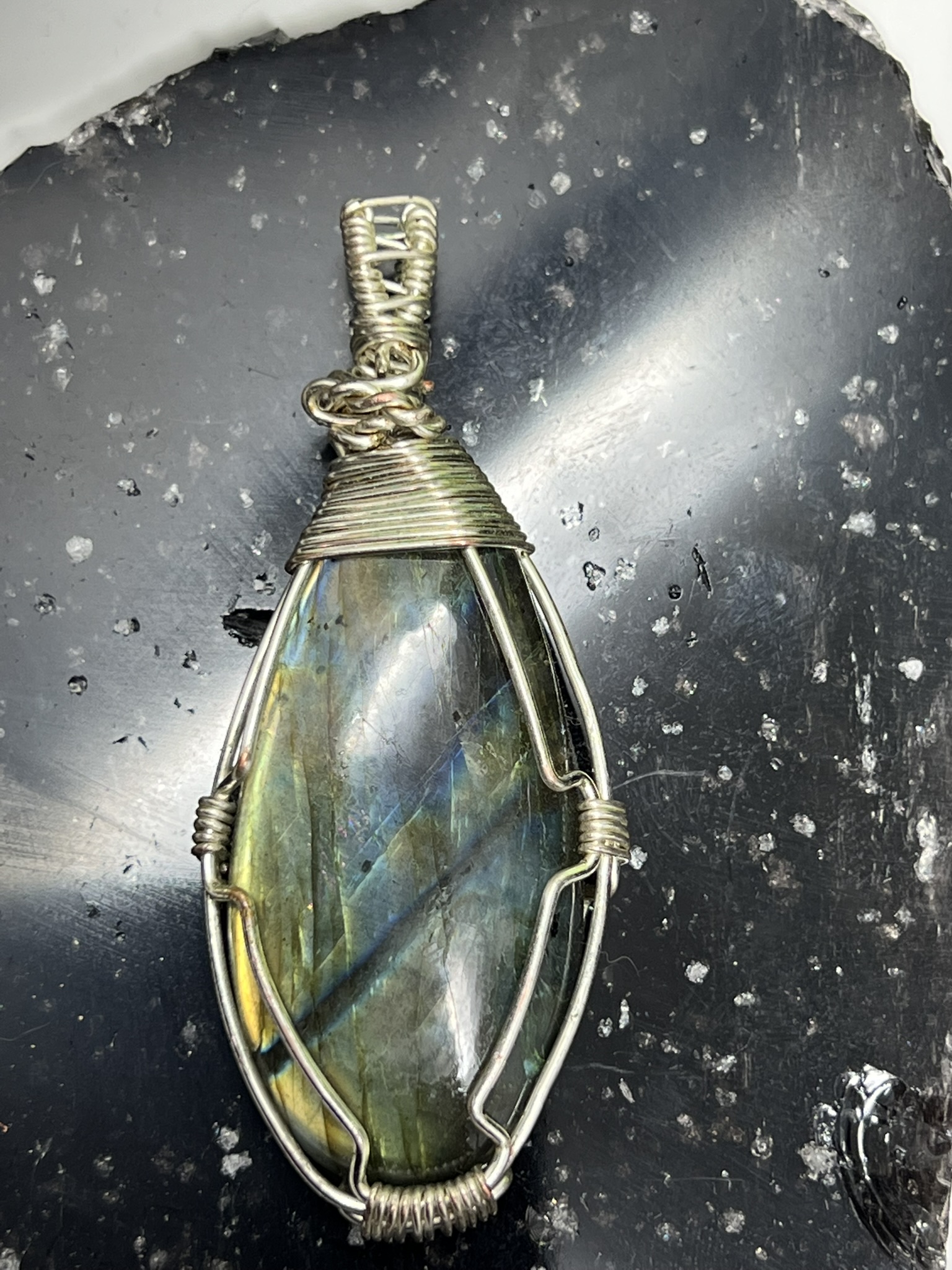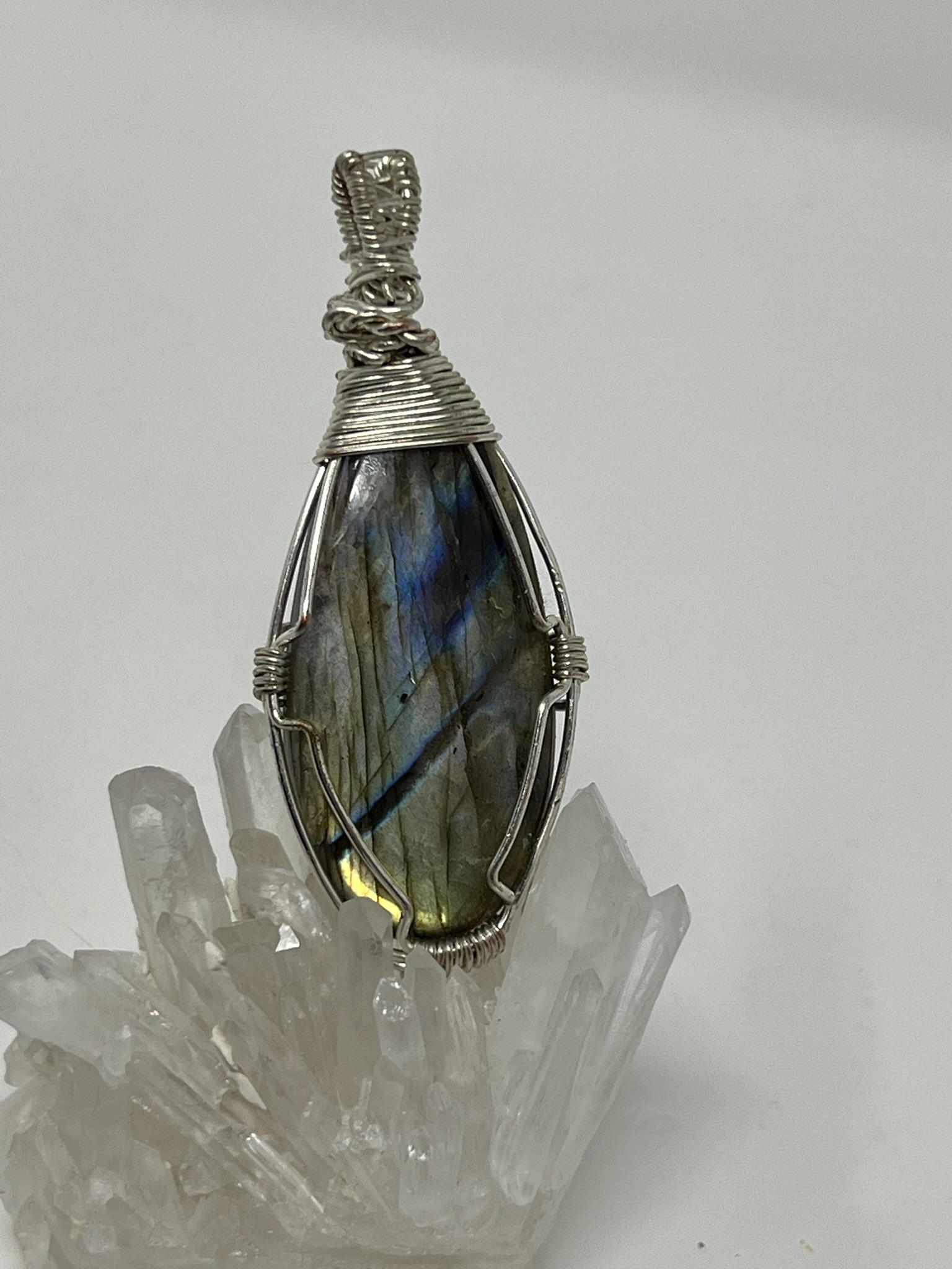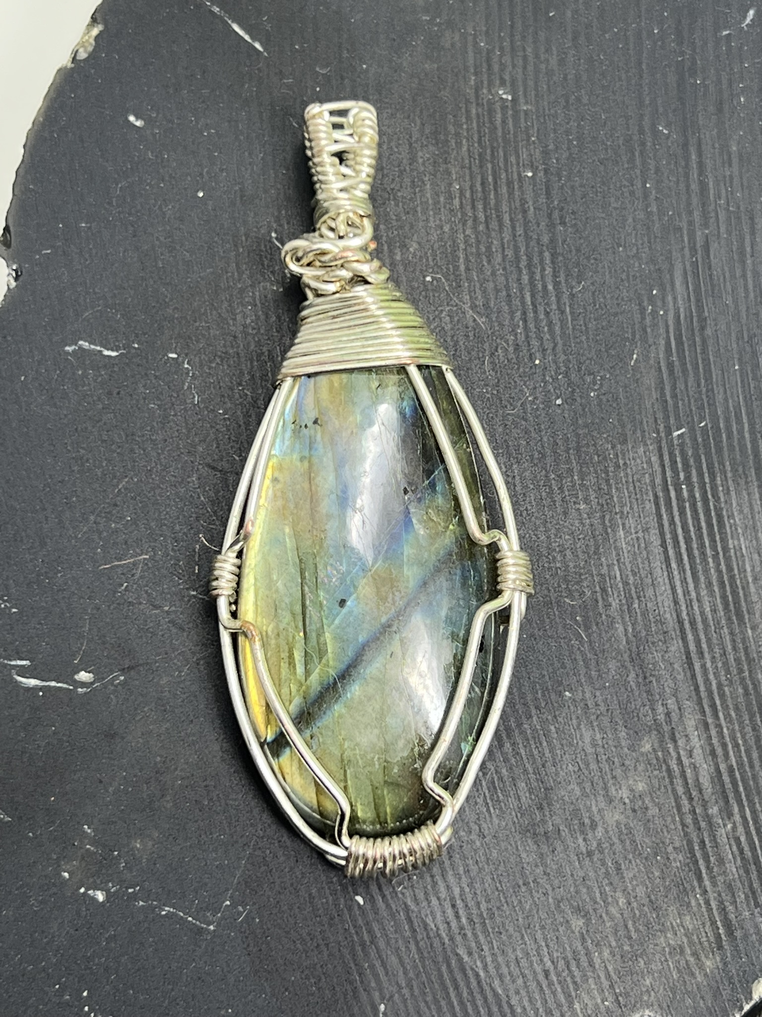 This stunning pendant features a labradorite cabochon that has been wrapped in silver colored copper wire. This piece is made by taking 3 pieces of 18 gauge silver colored, copper wire and connecting them on the bottom and sides with 22 gauge silver colored, copper wire. The bail is made by weaving the 22 gauge wire around 2 pieces of the 18 gauge wire. This piece is handmade in Minnesota.
