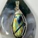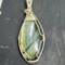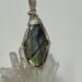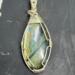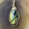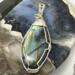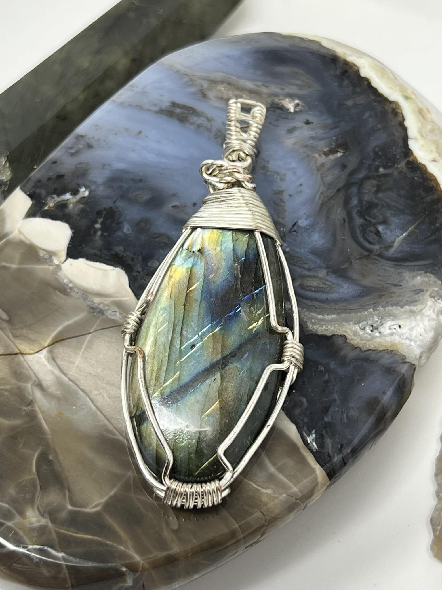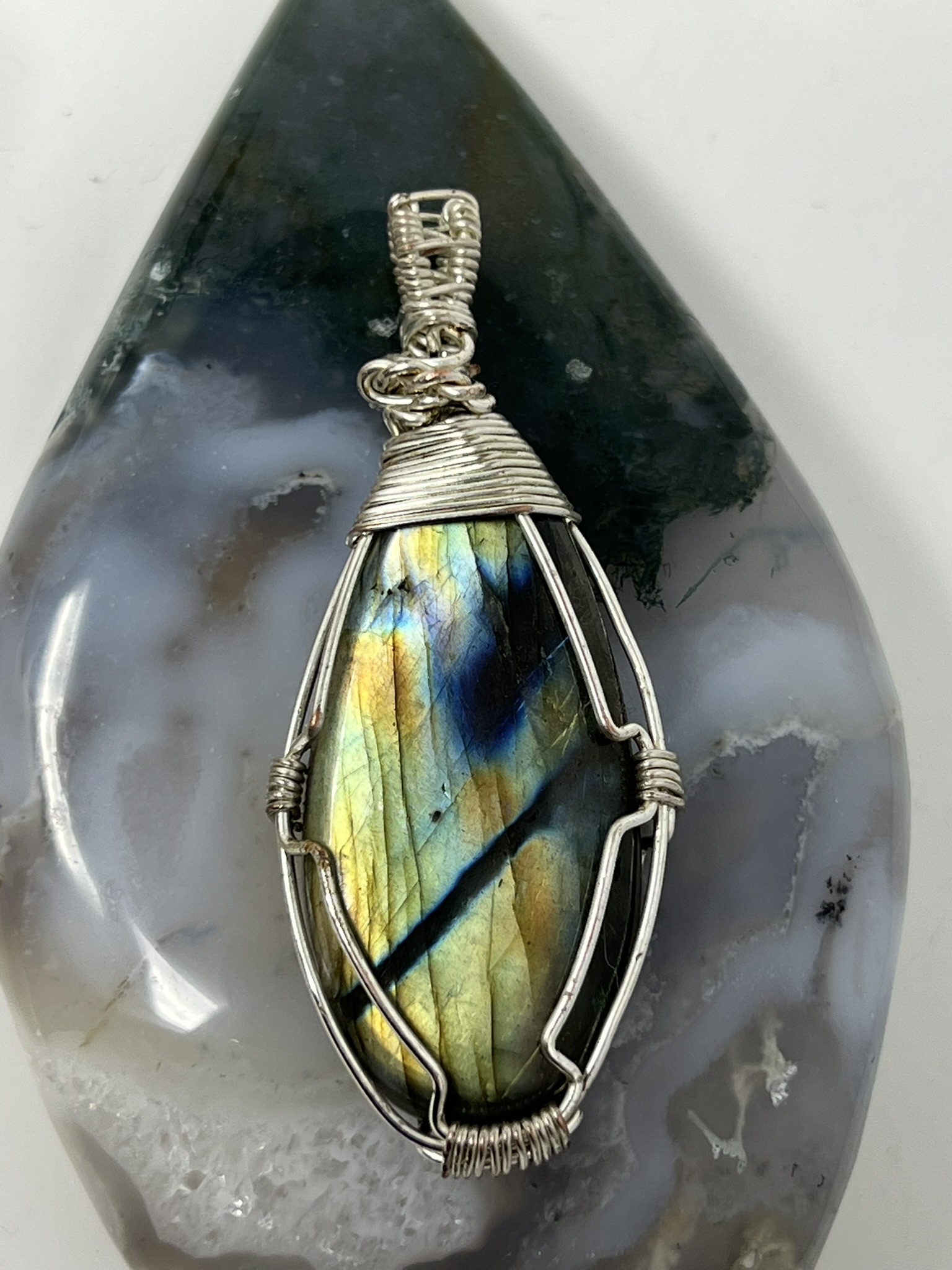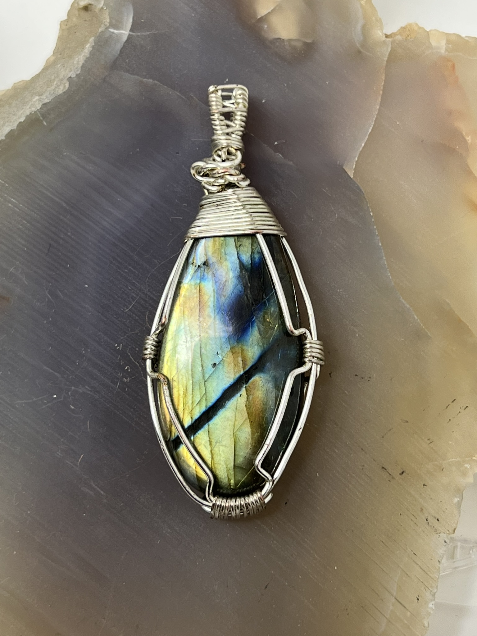 This stunning pendant features a labradorite cabochon that has been wrapped in silver colored copper wire. This piece is made by taking 3 pieces of 18 gauge silver colored, copper wire and connecting them on the bottom and sides with 22 gauge silver colored, copper wire. The bail is made by weaving the 22 gauge wire around 2 pieces of the 18 gauge wire. This piece is handmade in Minnesota.