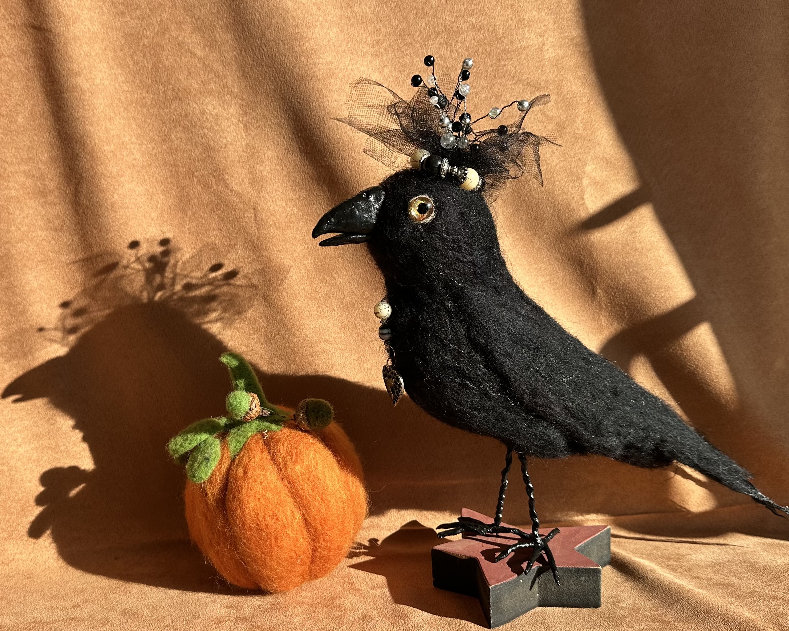 Magnificent large-scale needle felted Halloween crow sculpture mounted on rustic wooden star base. This commanding gothic art piece features an elaborate black tulle fascinator with cascading bead details and vintage-inspired heart charm necklace. Hand-felted with premium wool and adorned with theatrical embellishments, this one-of-a-kind collectible measures 11" wide and 13" tall. Dressed in feathers of 100% wool, her feet are wired, her beak is made of clay, her eyes are glass. Lady Ravenna makes a dramatic statement for Halloween displays, gothic home decor, or witchy altar spaces. Perfect for collectors of handmade dark fantasy art and occult-inspired decor.