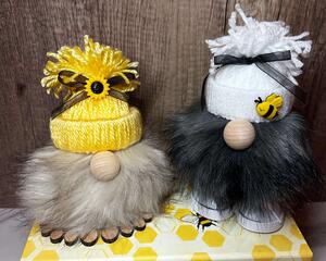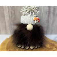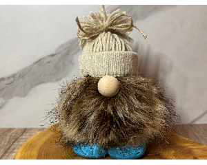 A faux fur body is decorated with shoes or feet. A hat is created with yarn and attached to the gnome. Finally a nose is added to bring each Gnome its special little character!