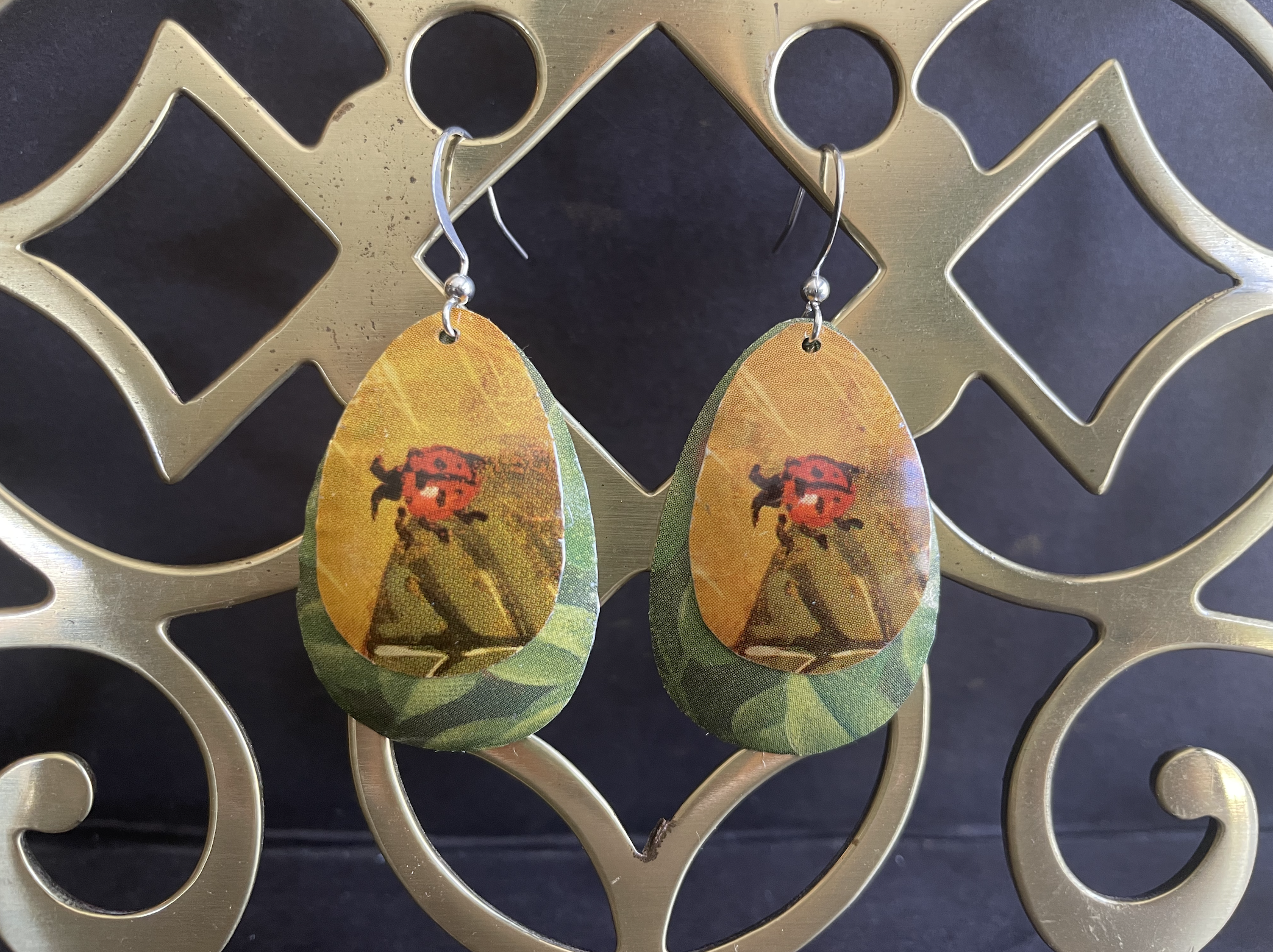 Care Instructions: As with any jewelry, the easier you treat it, the longer it will last. The double-sided pendants are not water proof. The tin earrings are water proof, although some of the older tins may rust as they have a higher iron content (I think this patina only adds to their charm).