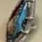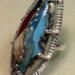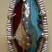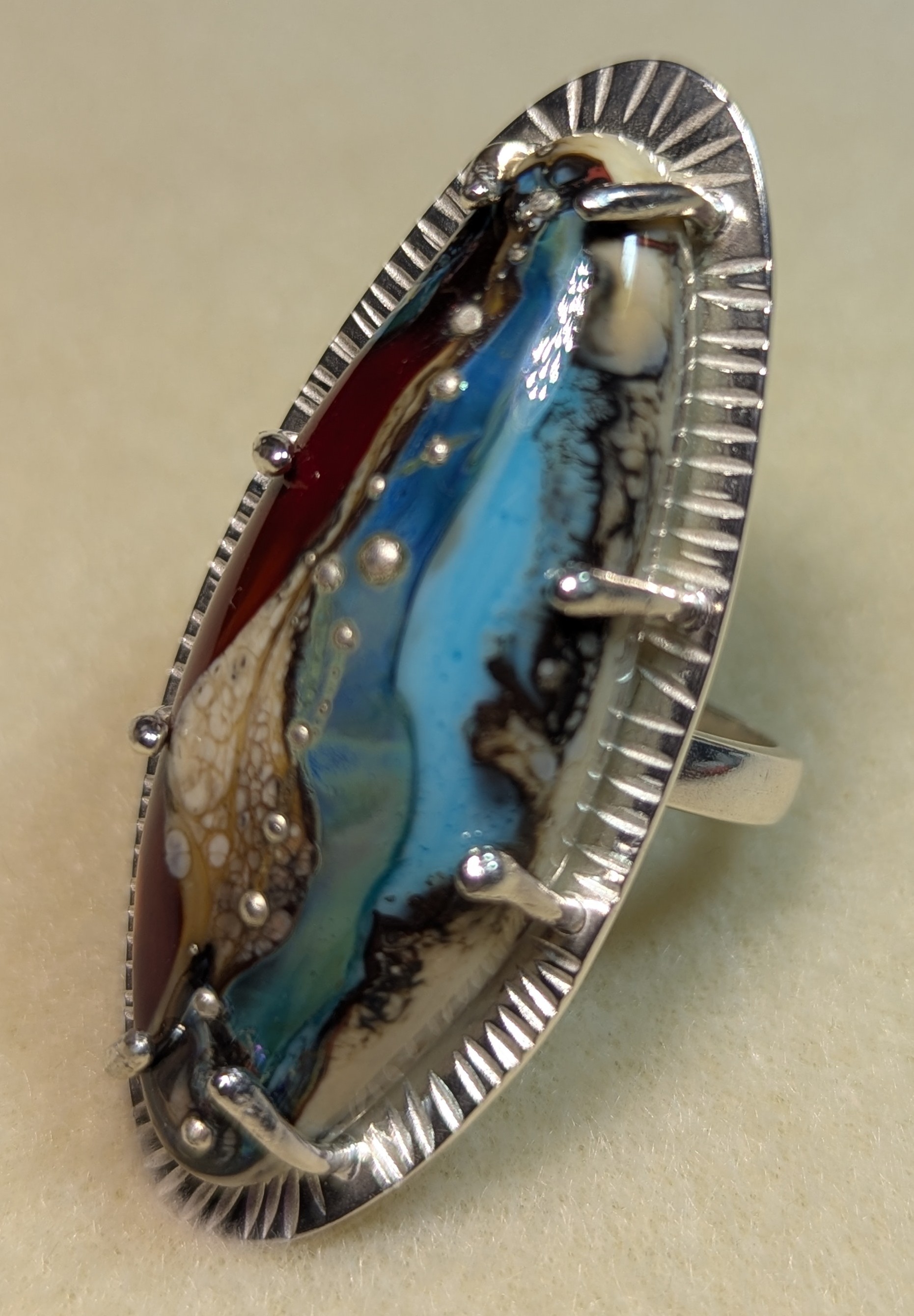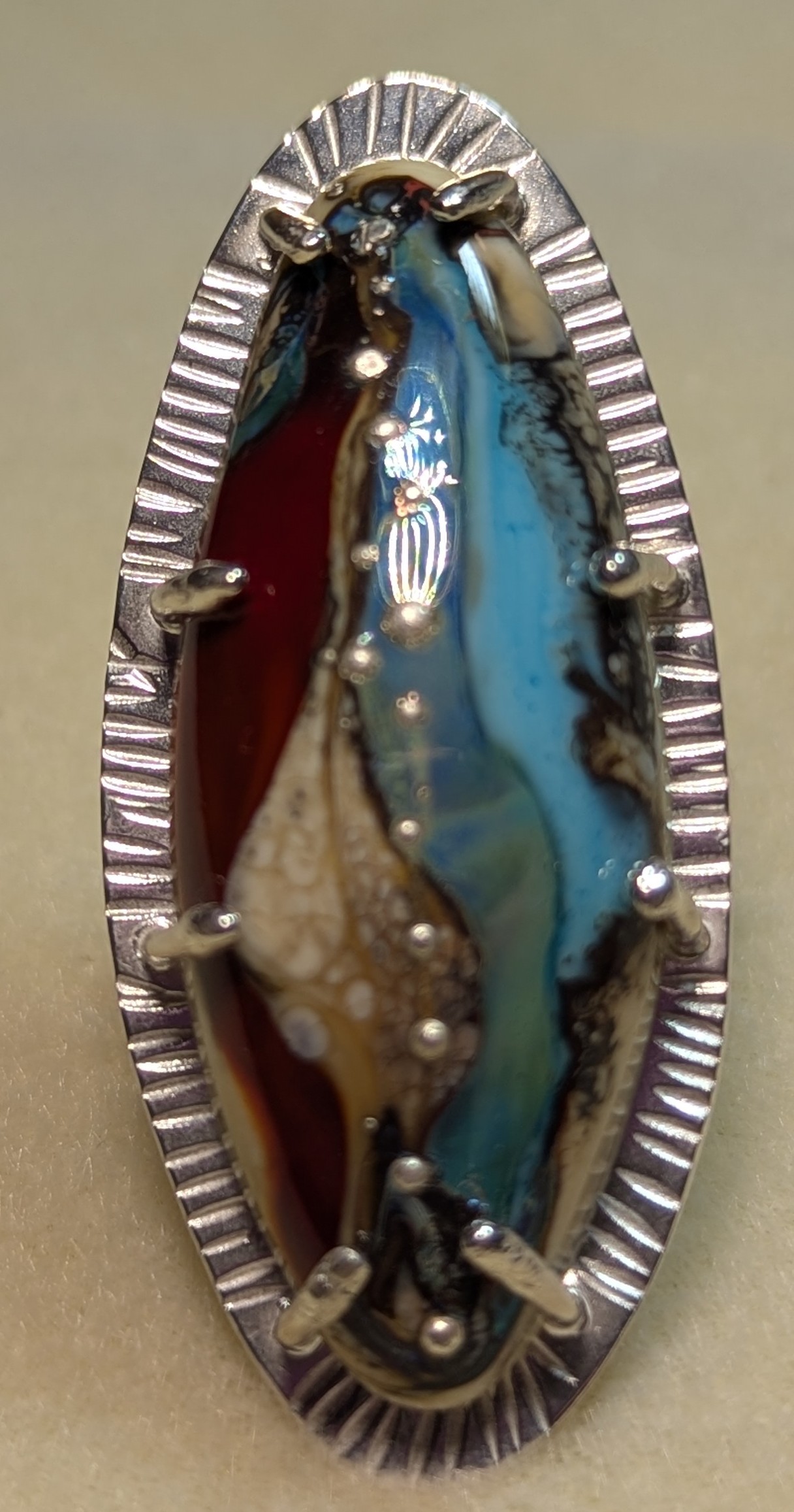 Artisan made Lampwork glass cabochon in shades of red, blue, silver, and cream, prong set in .925 Sterling silver. This is a substantial, one of a kind statement piece, that will be a great conversation starter and an excellent addition to your artisan jewelry collection. Appx. size 8.