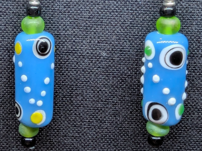 Lampwork glass starts with a stainless rod and a torch. Glass rods are melted in the flame and applied to the stainless rod in various patterns and layers. These beads are then annealed for strength against breakage, and I used this pair for earrings. The wires are sterling silver.