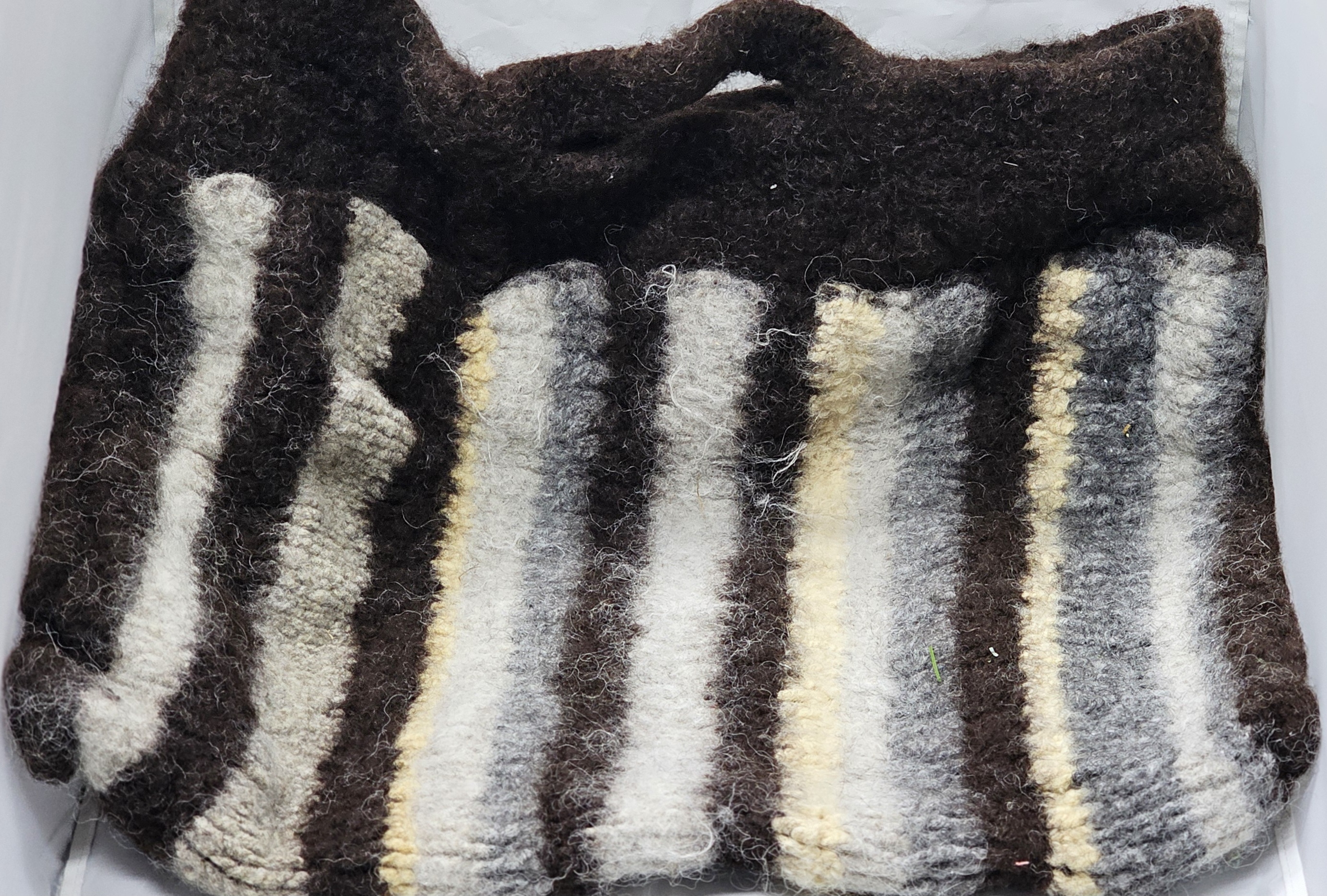 This bag is knitted and felted by hand. The inner lining was sewn on.