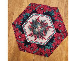 This large 36" hexagonal table topper features a charming sewing notion theme and is crafted from 100% cotton with 80/20 batting. It's machine washable on a cool, delicate cycle and should be laid flat to dry. A delightful addition to any sewing enthusiast's home, it is made in the U.S.A. in a smoke-free environment.