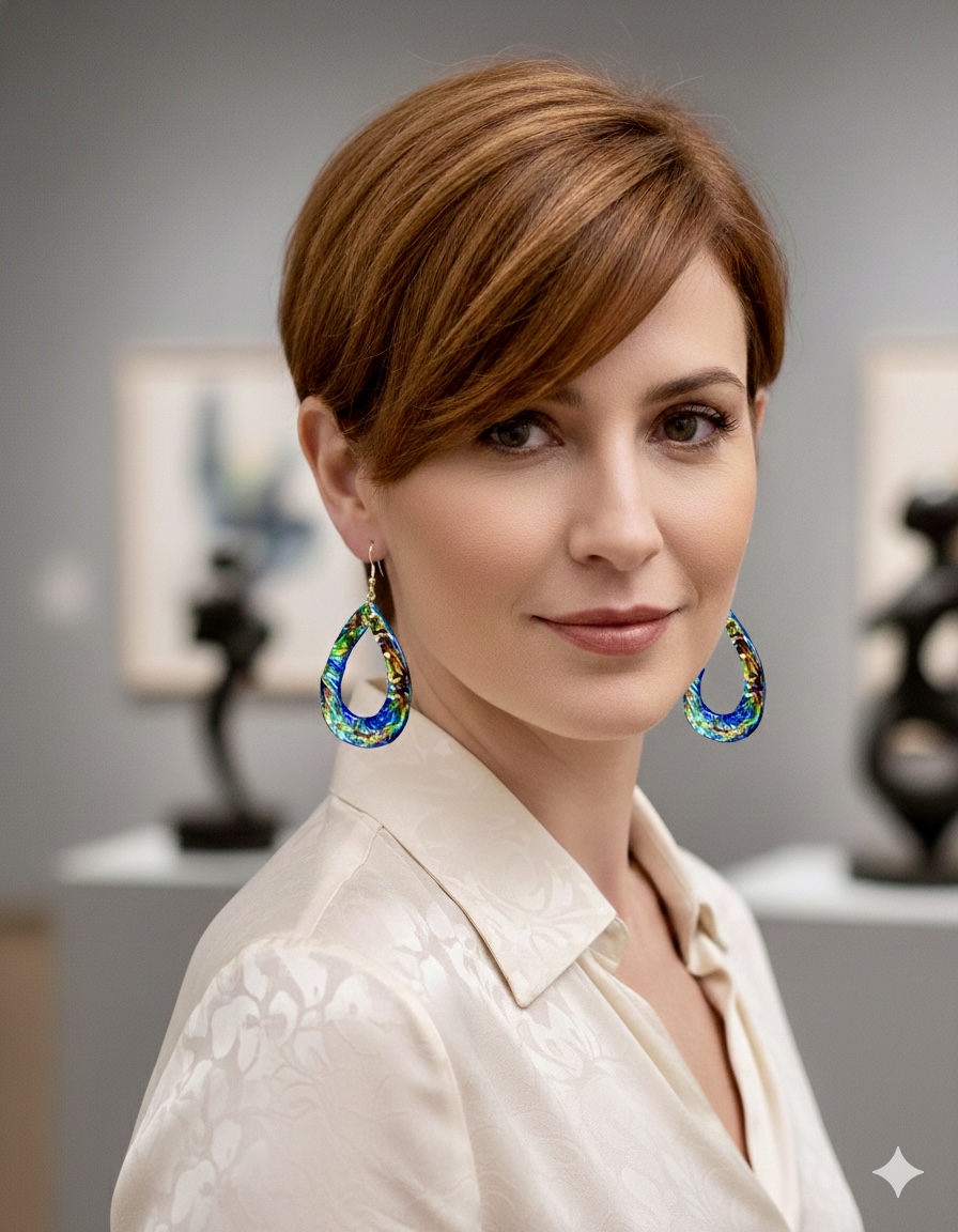 These large hollow teardrop earrings are ultra lightweight because they are made from wood, not metal — you’ll barely know you have them on! The dichroic film has incredible green, blue, yellow, and copper colors, and grabs attention with the slightest movement.
