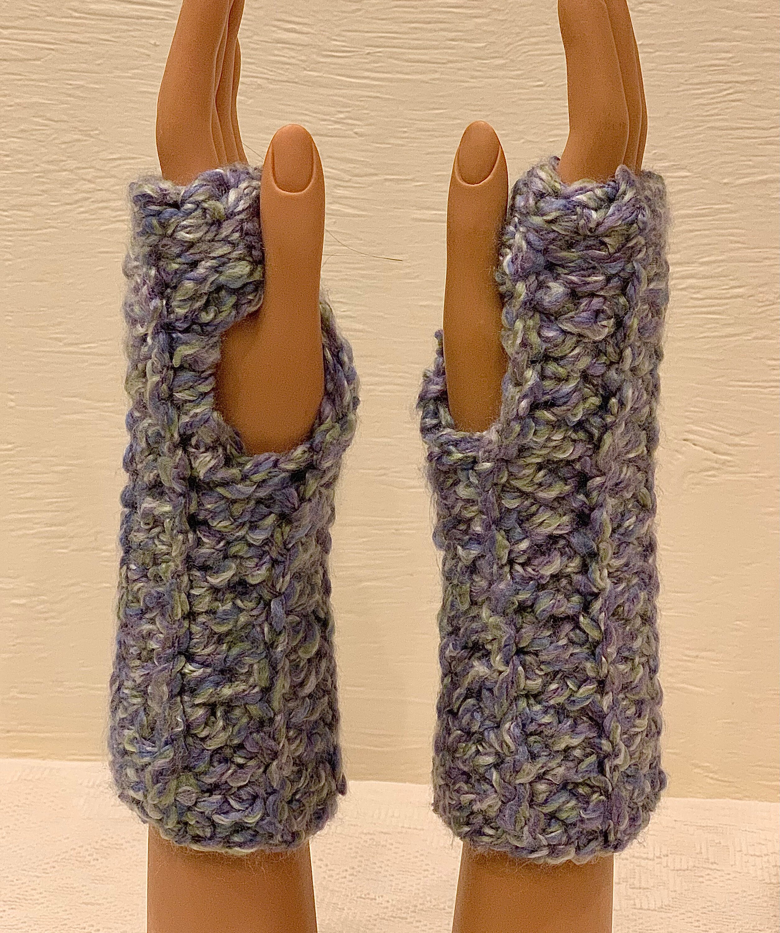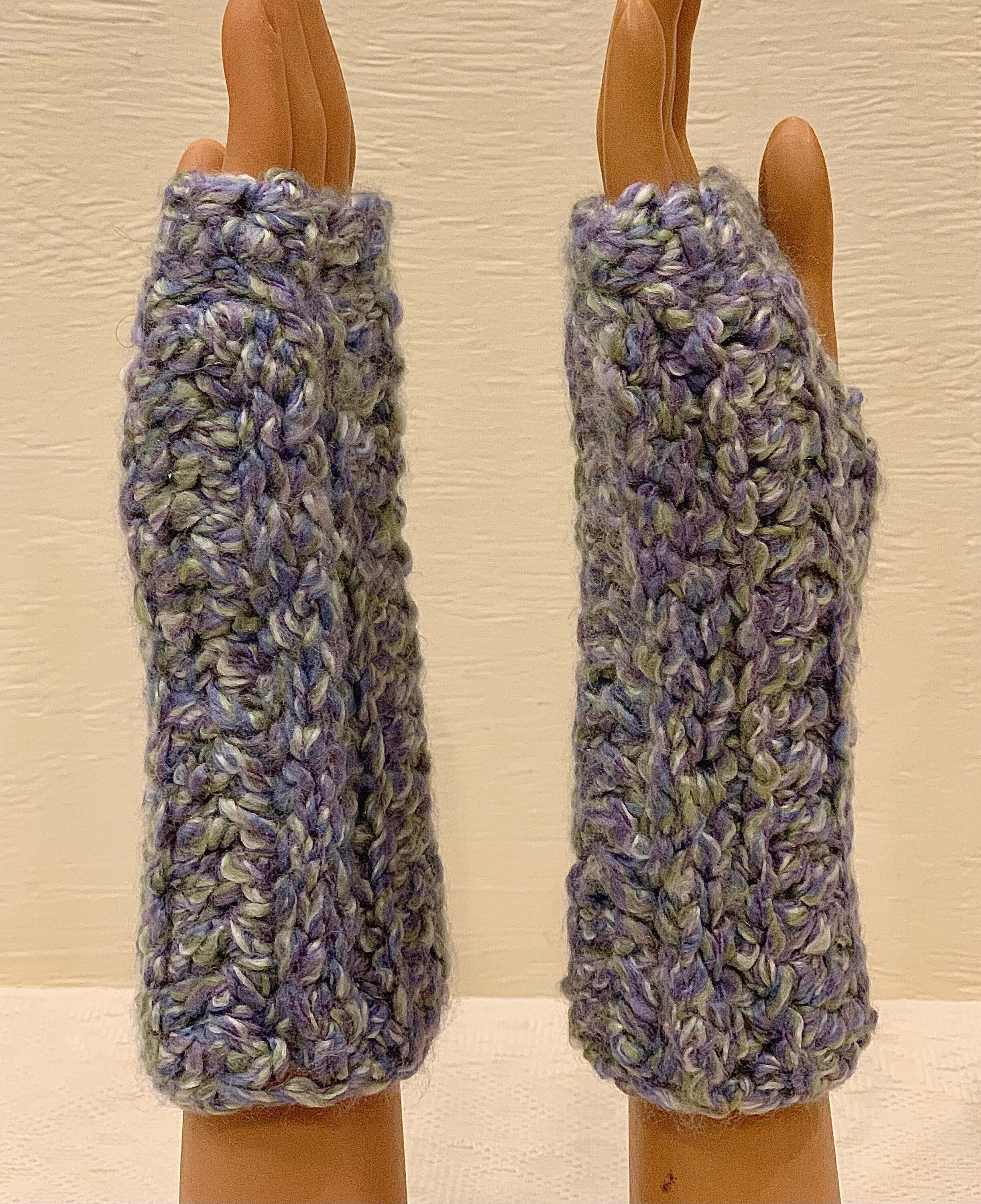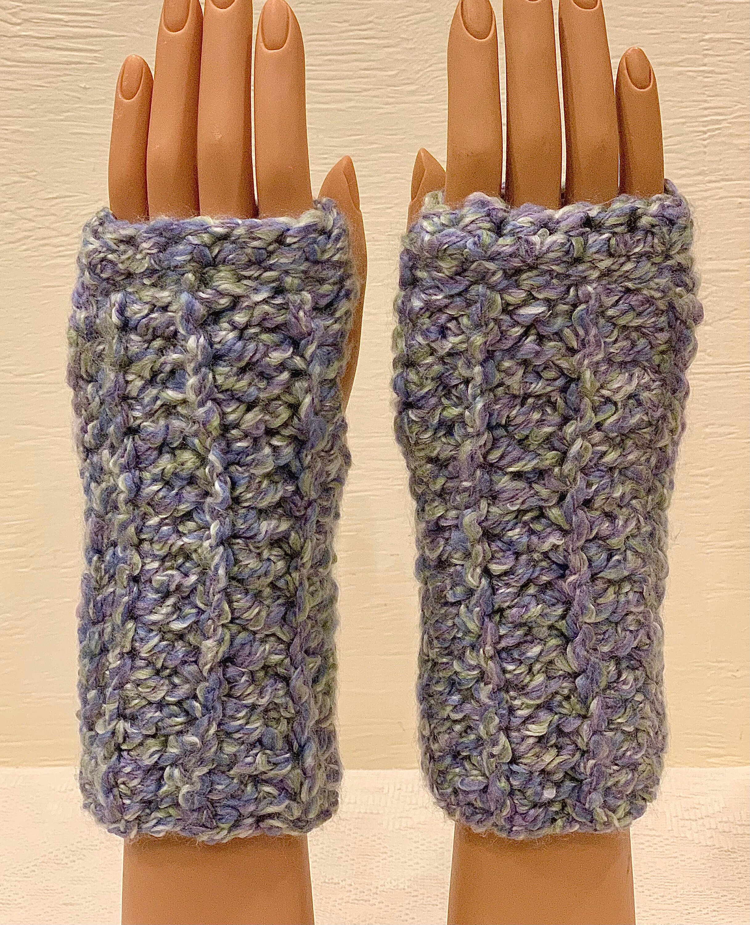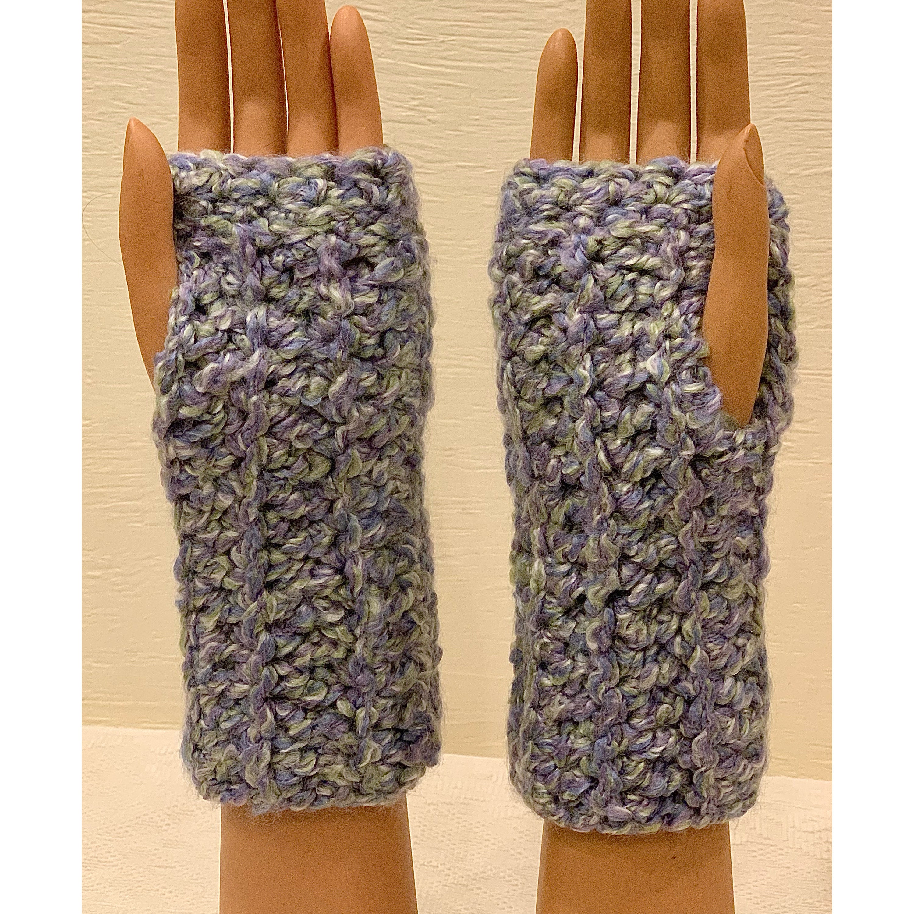 These fingerless mittens are suitable for both outdoor and indoor use. They are stylish and cozy, coordinating beautifully with my eternity scarves and other crocheted creations (hats, headbands, clip-on flowers, and more).