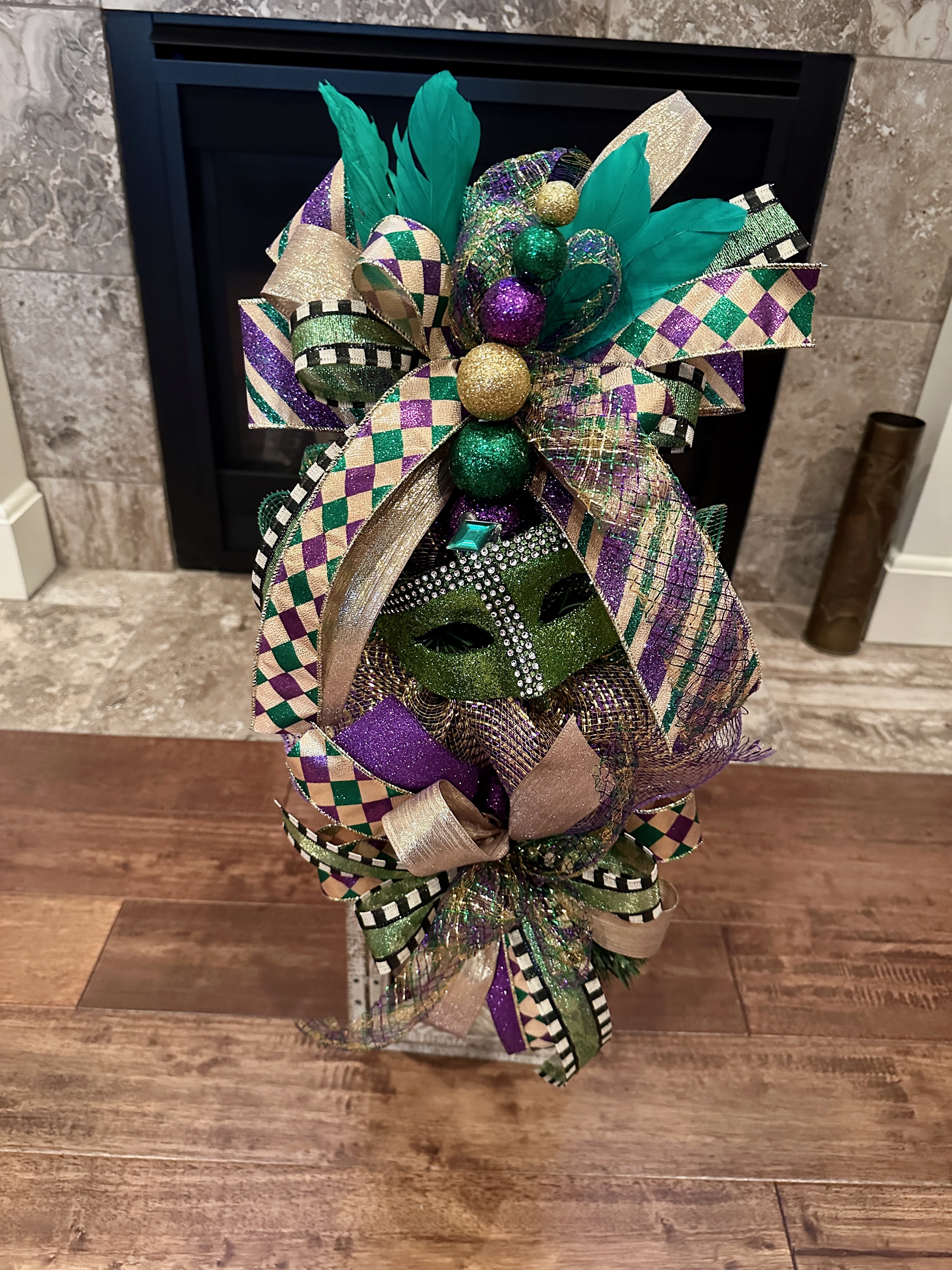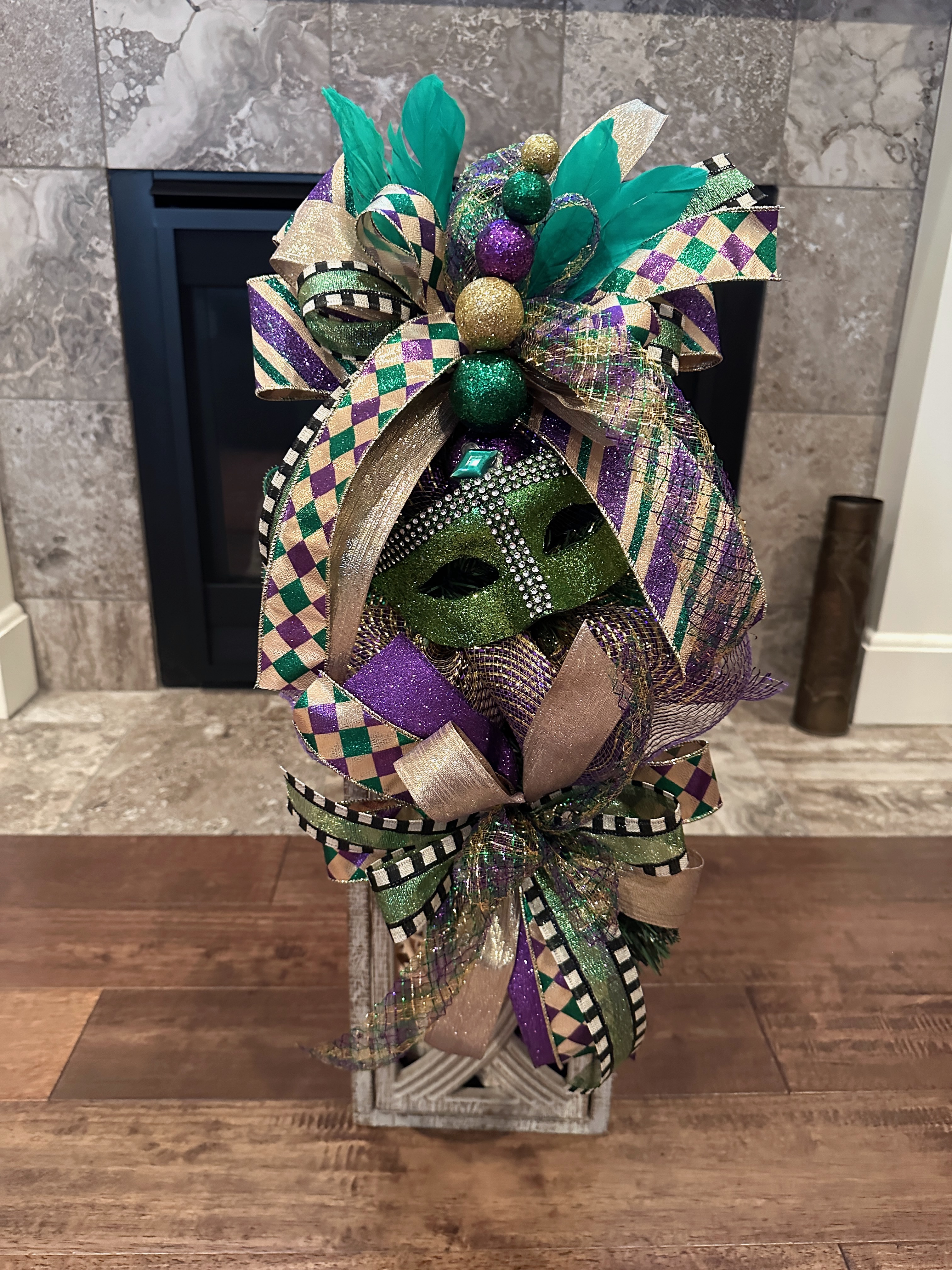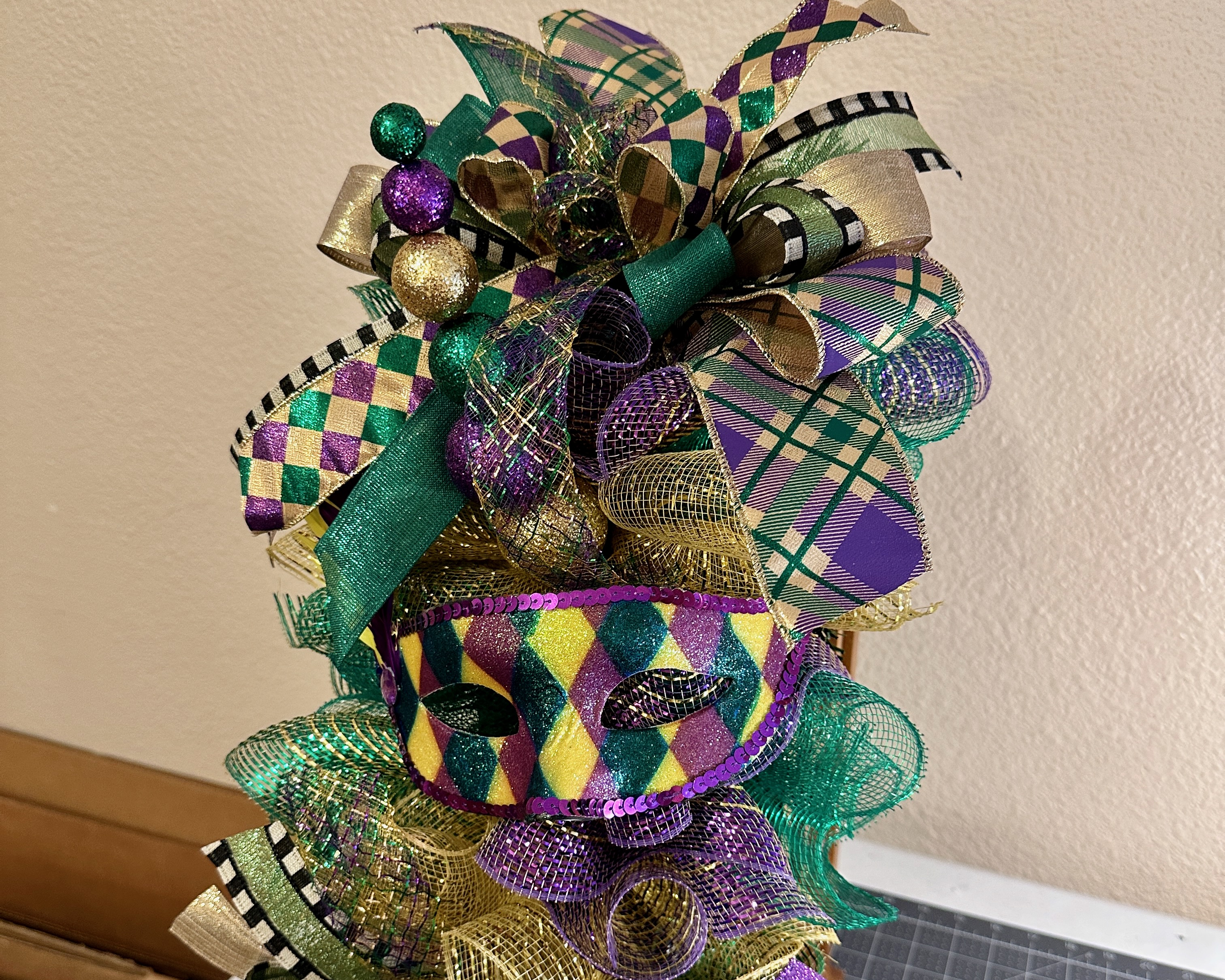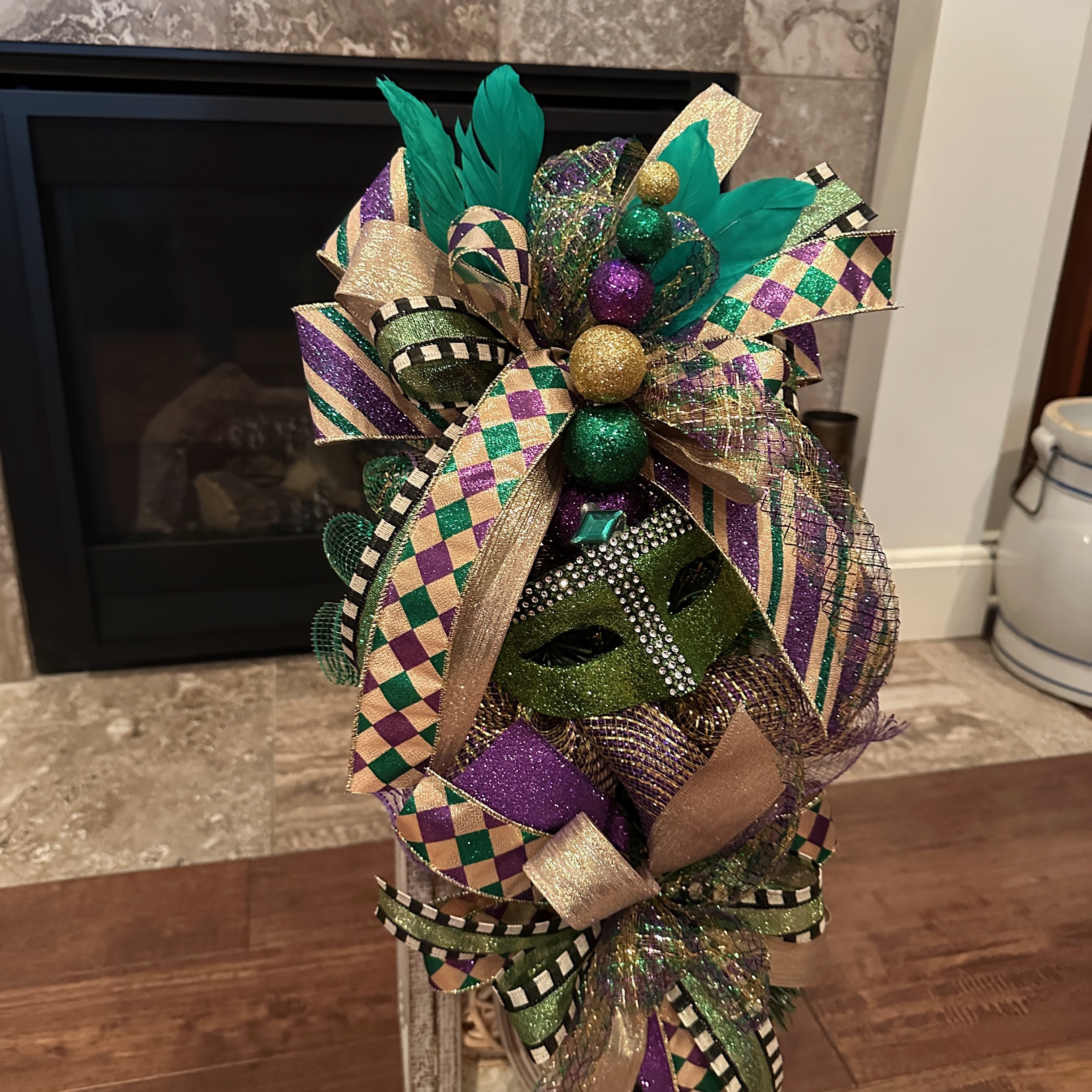 High quality, wired ribbons in Mardi Gras colors and patterns are used to make a large glam and glitter bow at the top with a complementary bow at the bottom. A total of 6 different ribbons are used in this design.