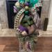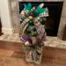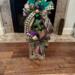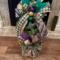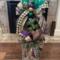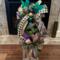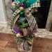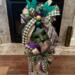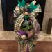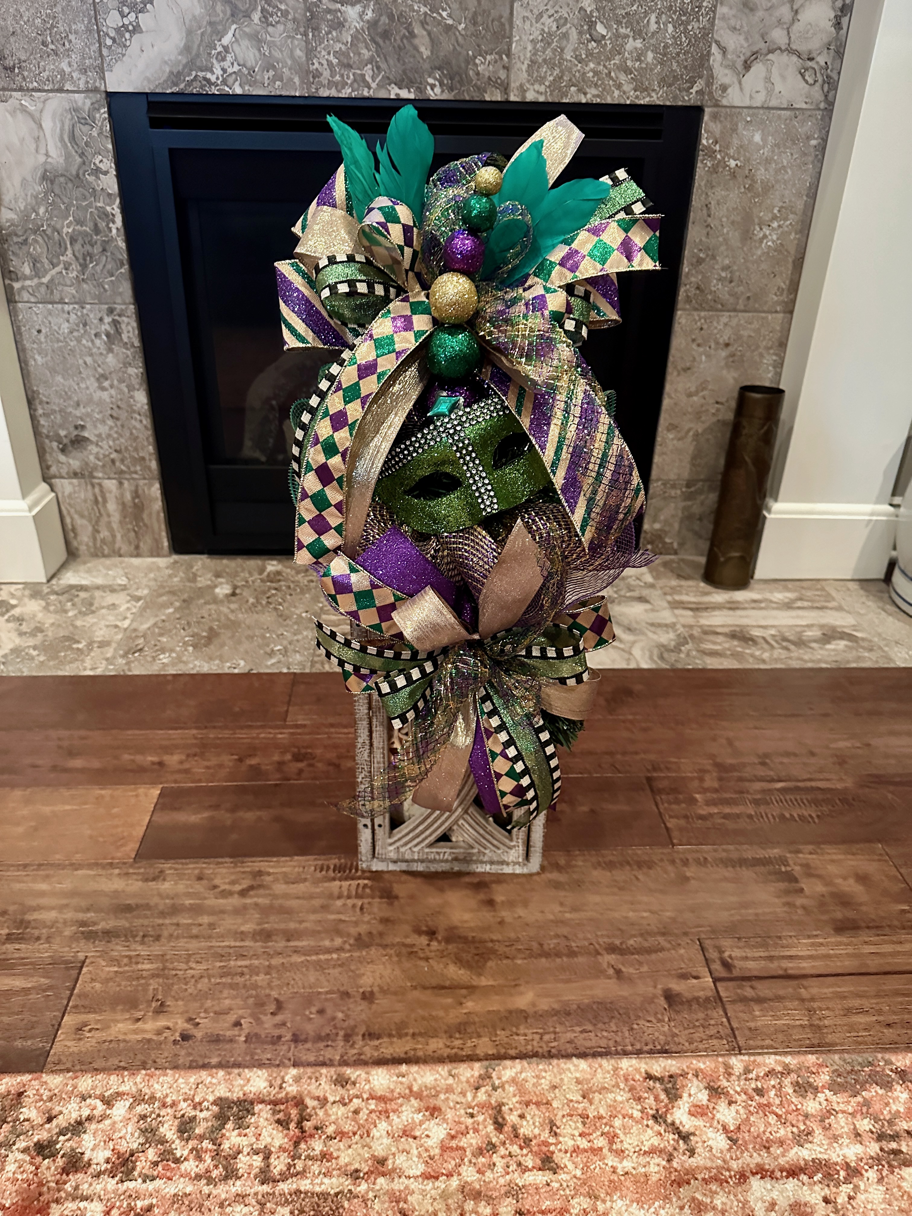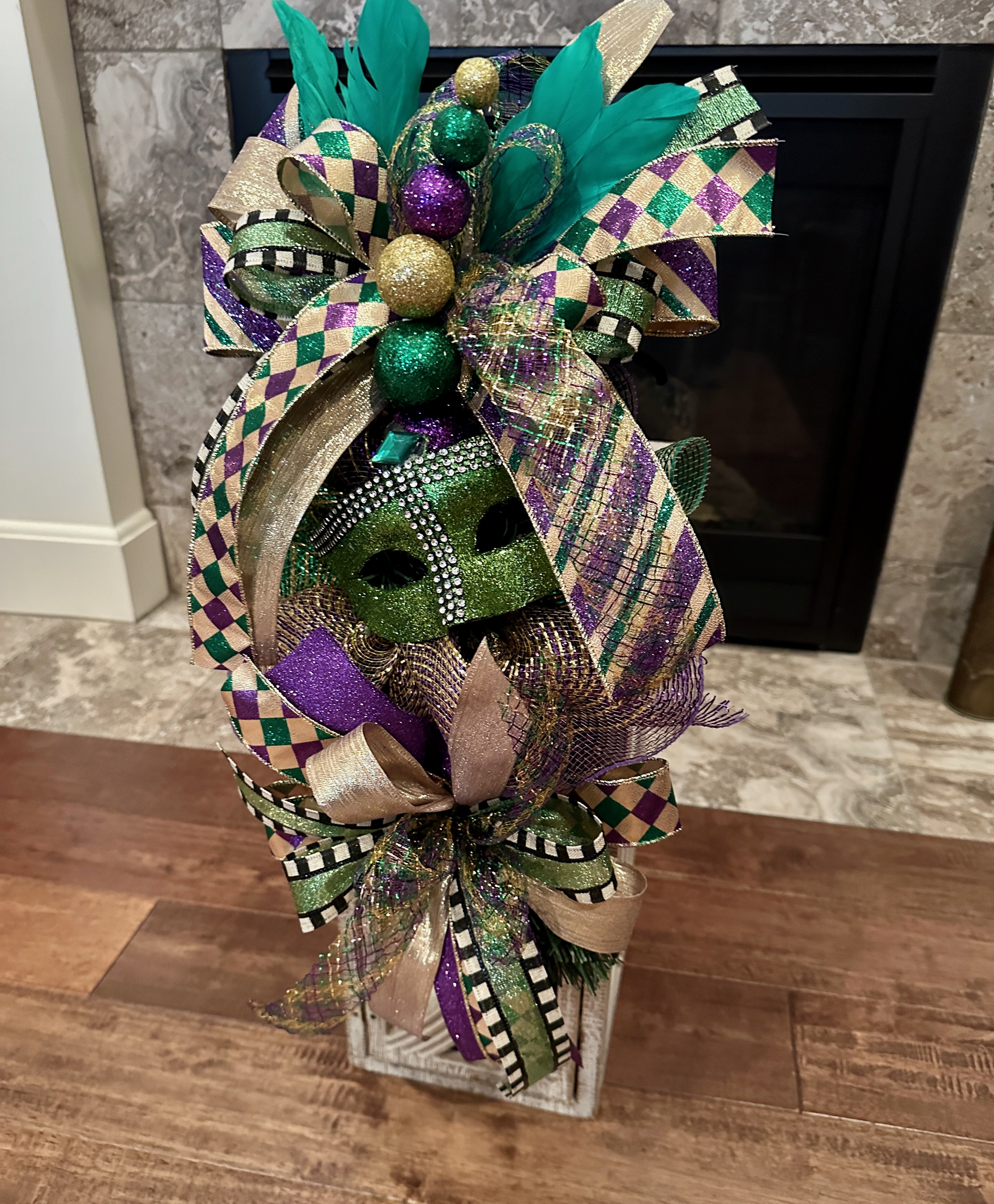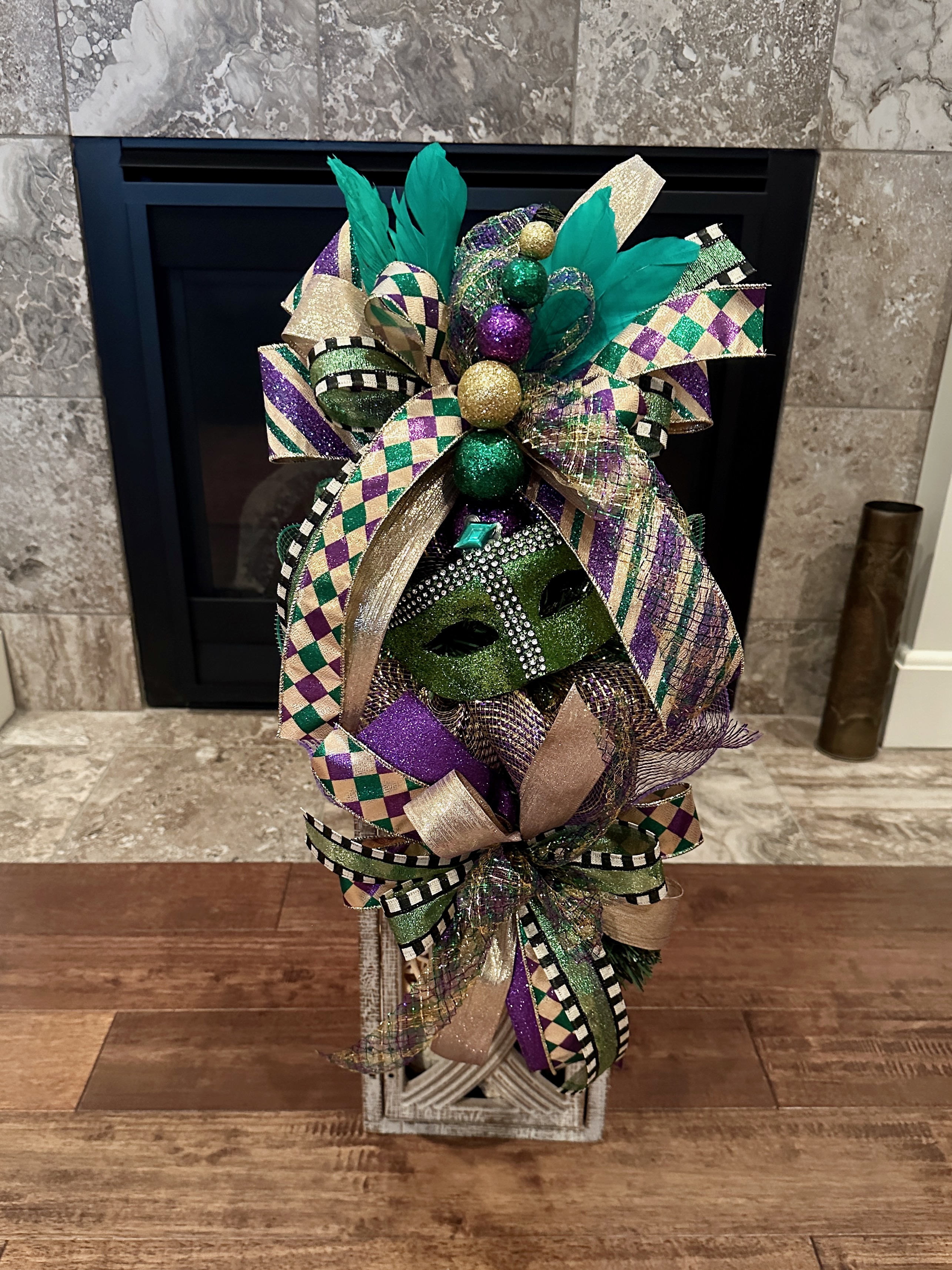 High quality, wired ribbons in Mardi Gras colors and patterns are used to make a large glam and glitter bow at the top with a complementary bow at the bottom. A total of 6 different ribbons are used in this design.