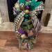Perfect for celebrating the Carnival season, this colorful large lantern swag features a variety of rich purple, gold, and green ribbons accented with glittering ornaments and a decorative mask.