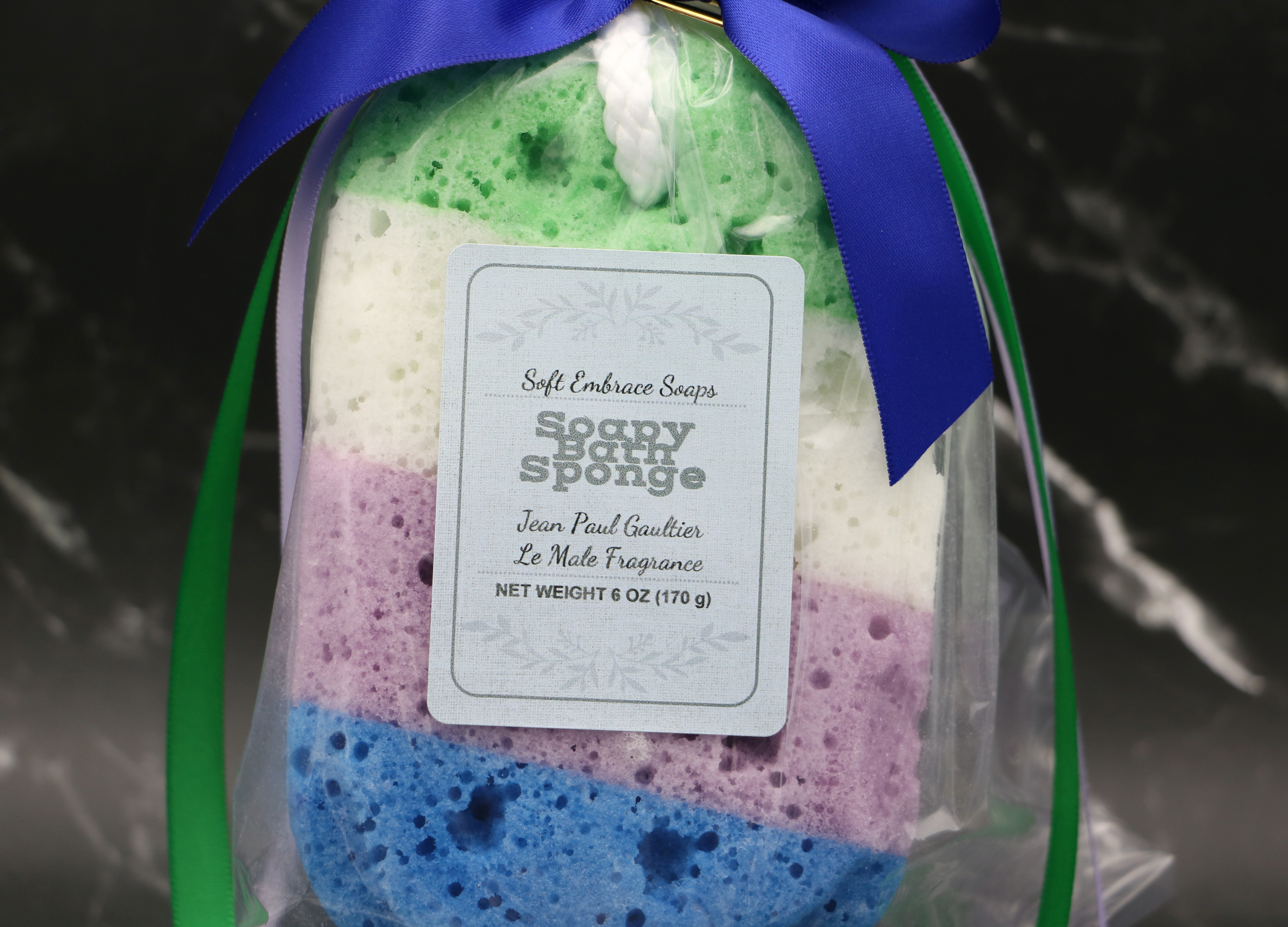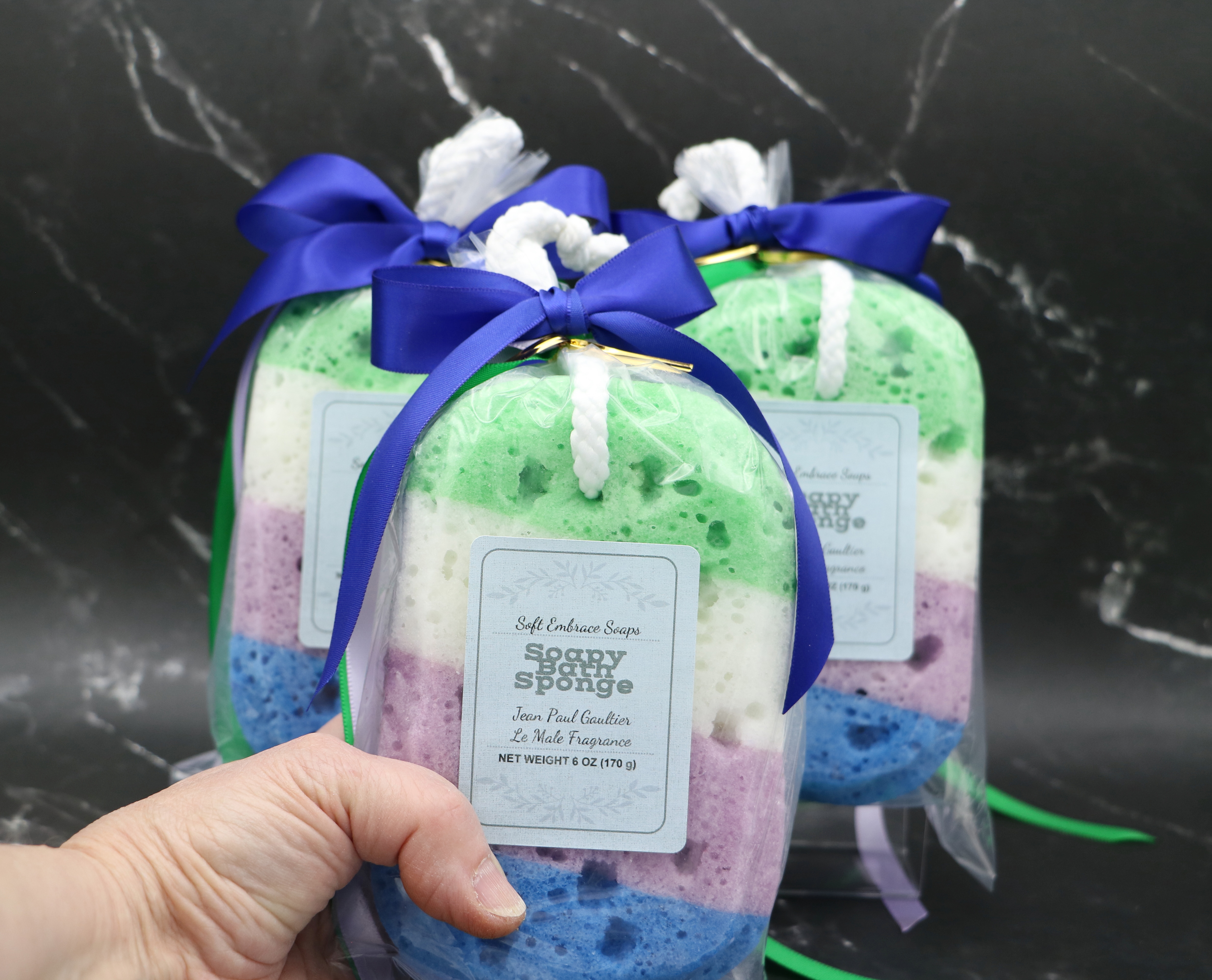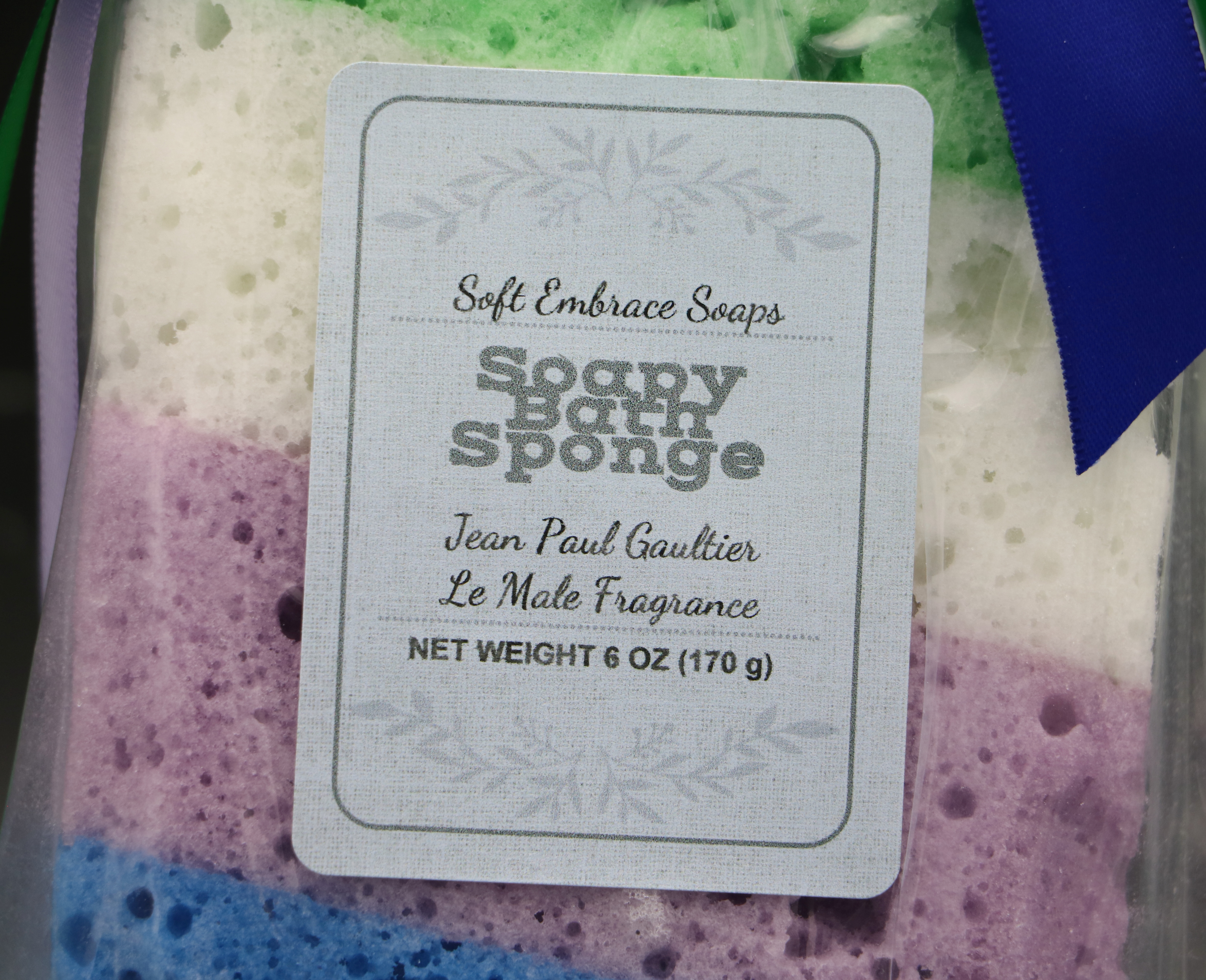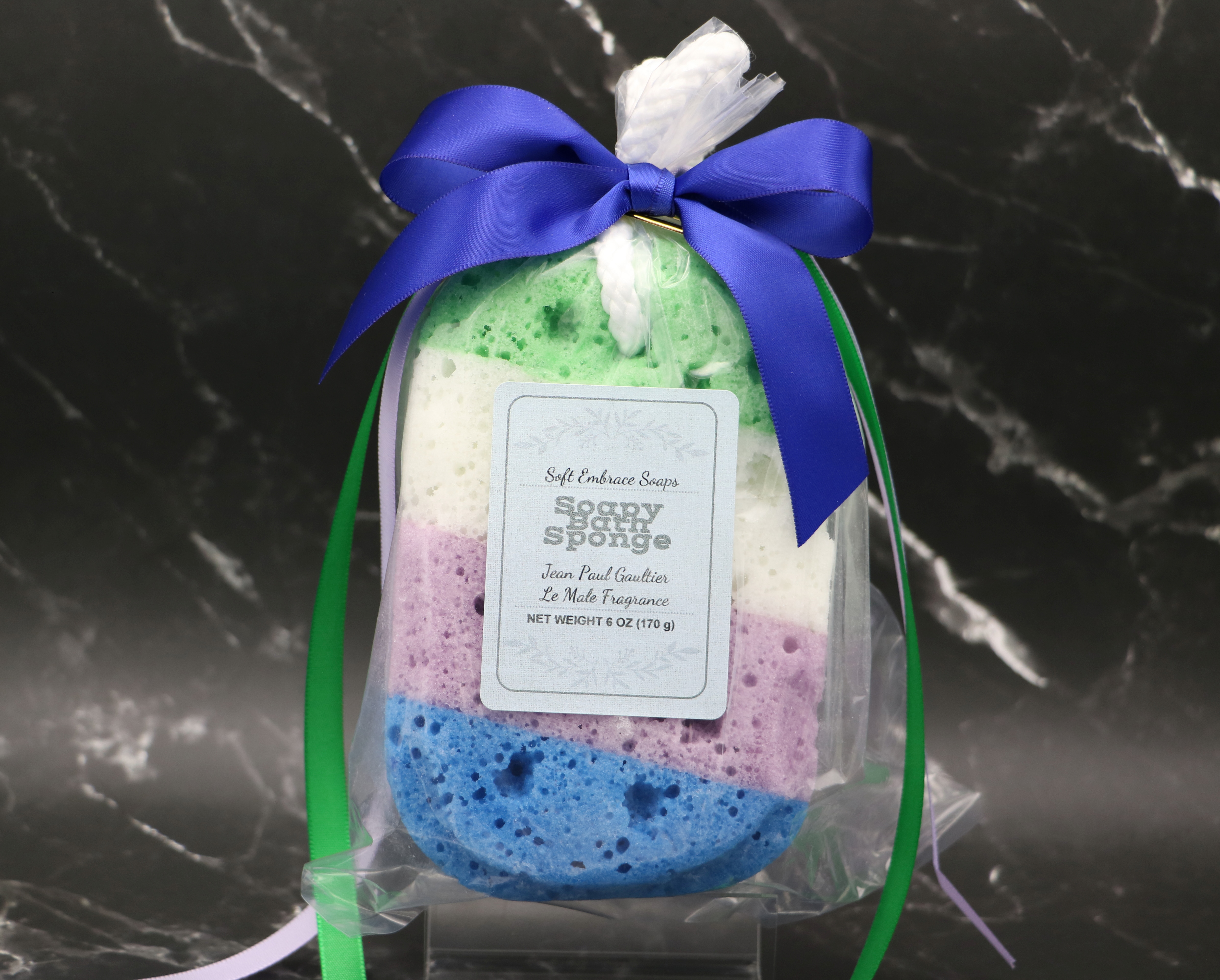 This plush bath sponge is scented with a fragrance that is a version of Jean Paul Gaultier Le Male. It is warm & masculine, slightly woody. Perfect gift for that special guy! Soapy Bath Sponges envelop your skin in a rich, foam filled lather that feels silky smooth & luxuriously soft, while the aromatic notes of the fragrance oils awaken your senses & elevate your bathing ritual.