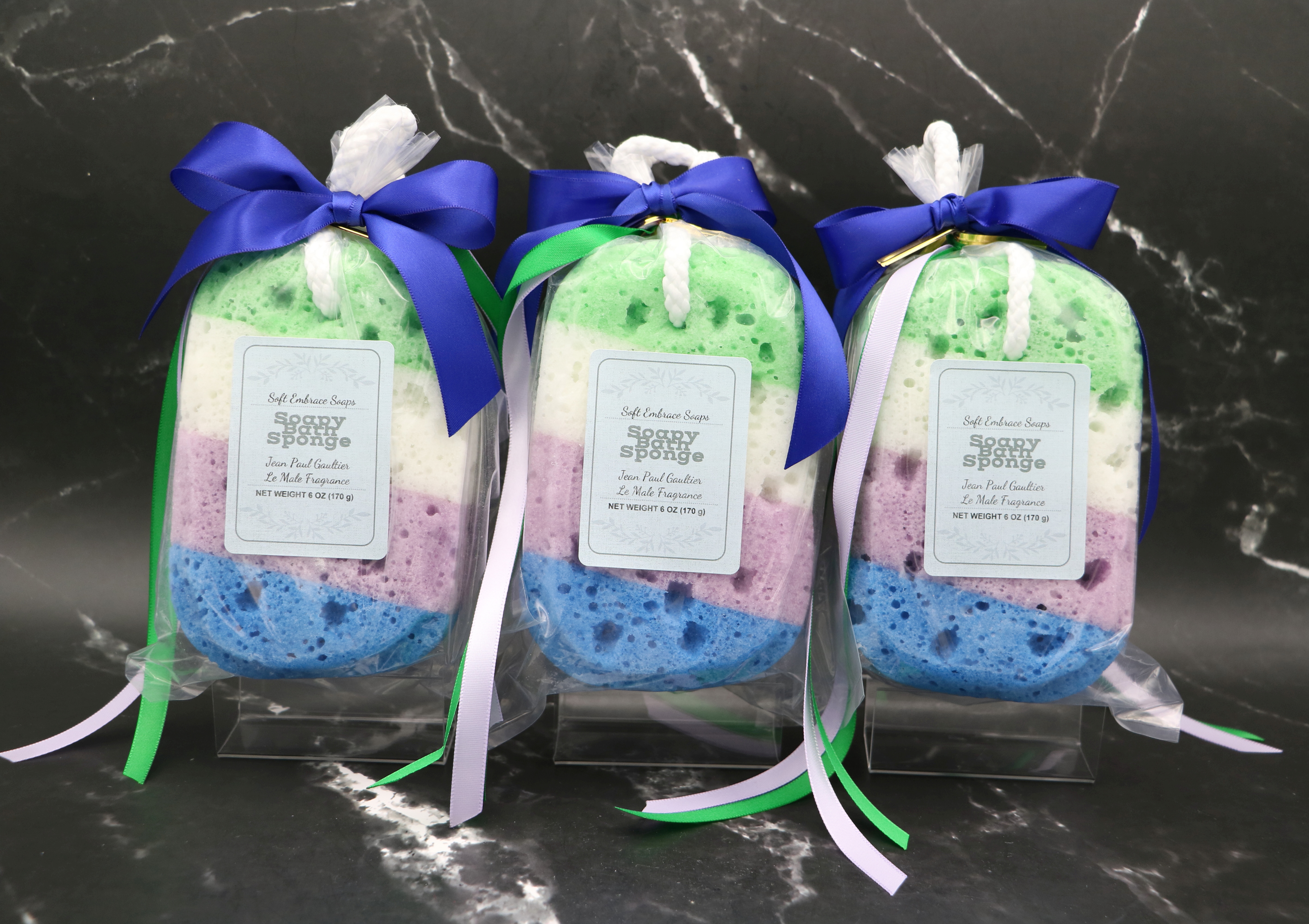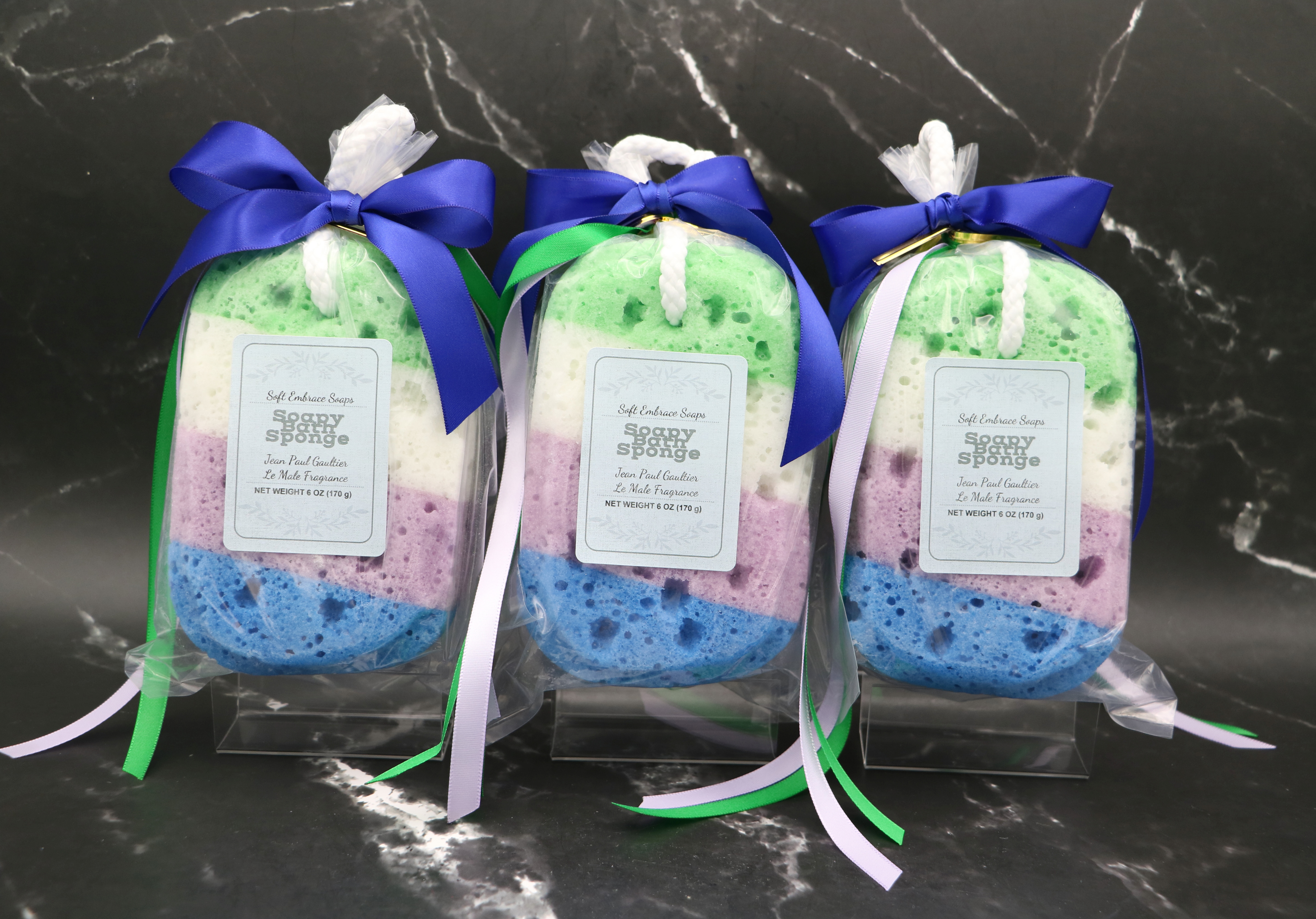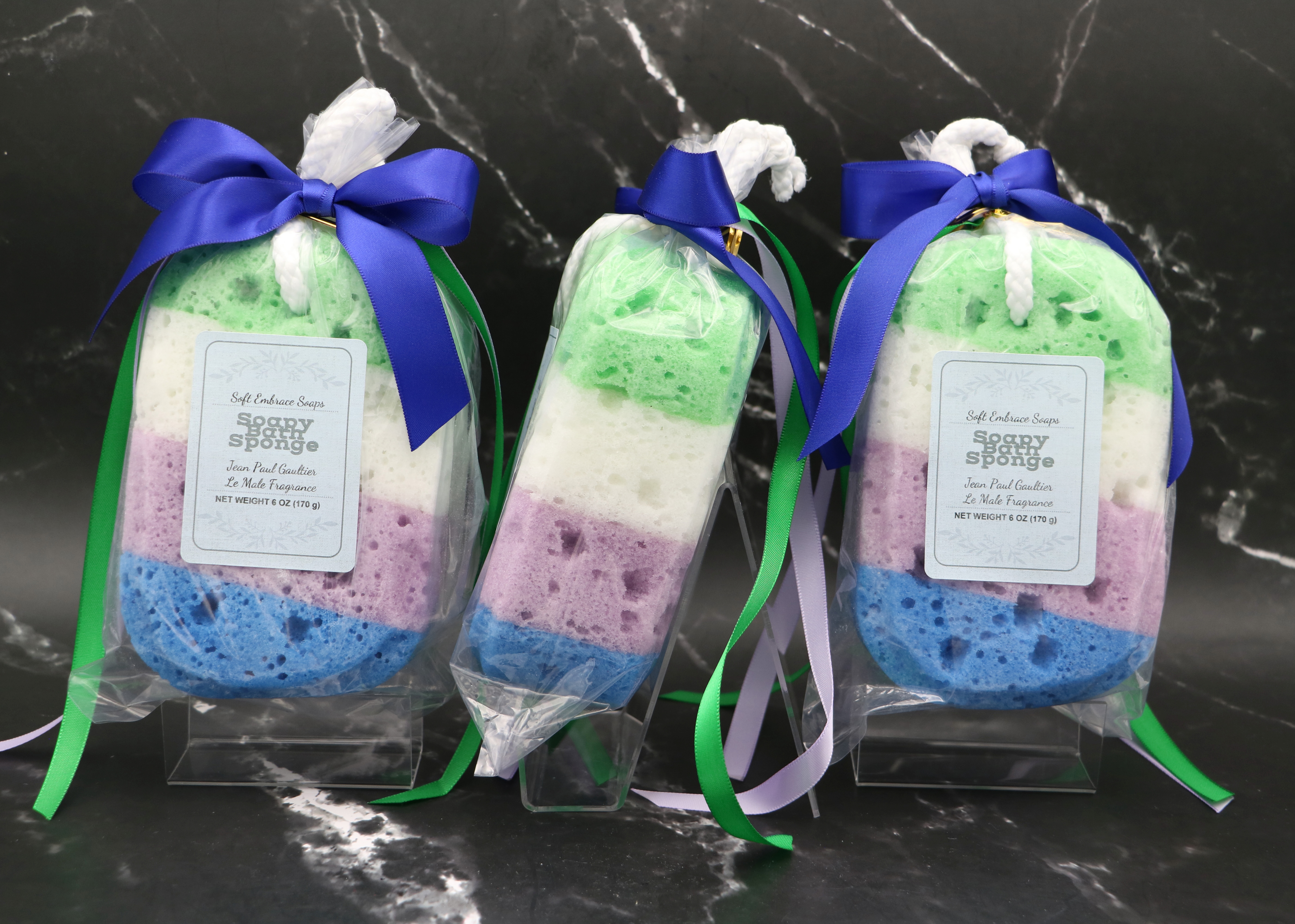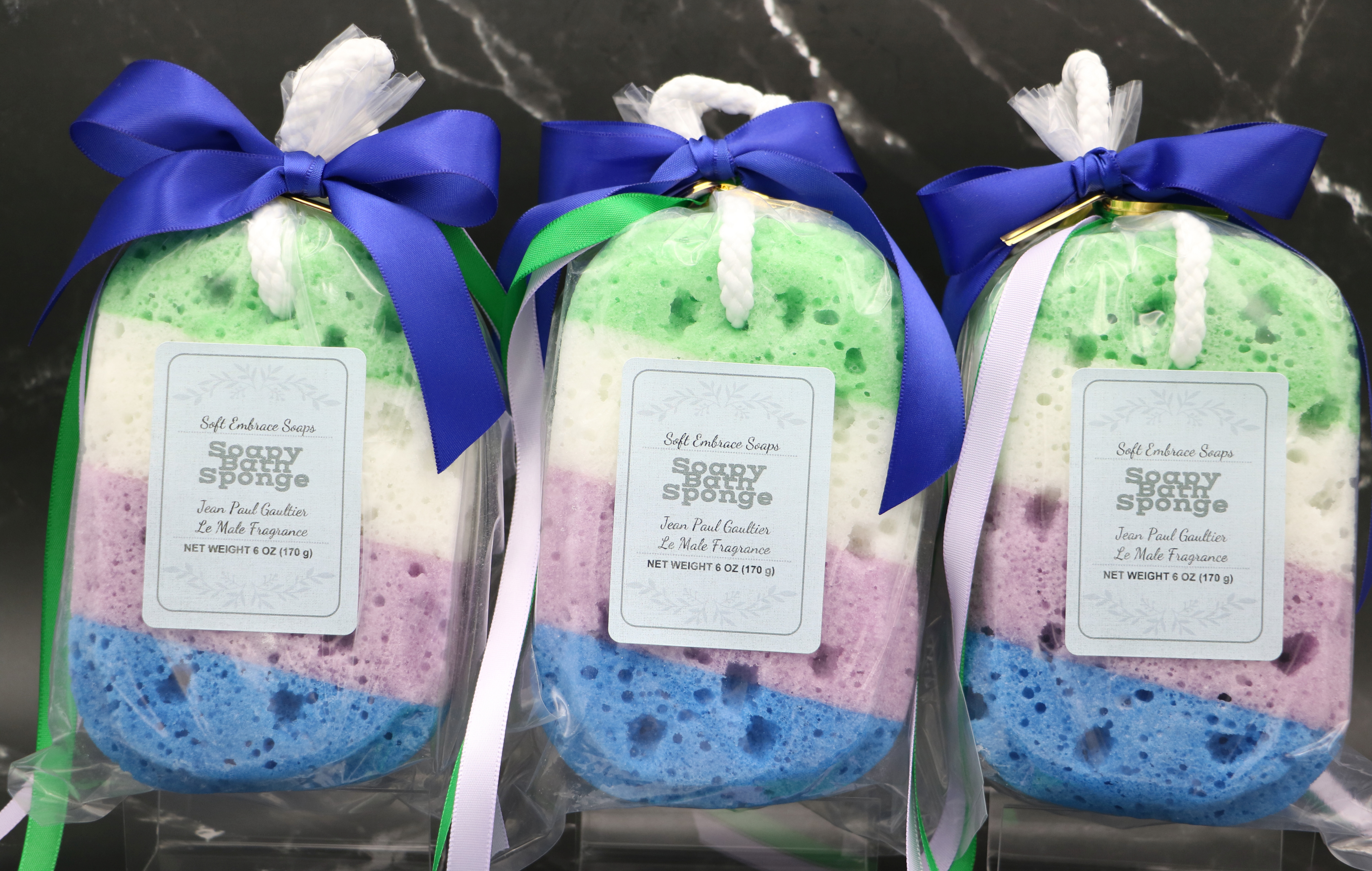 This plush bath sponge is scented with a fragrance that is a version of Jean Paul Gaultier Le Male. It is warm & masculine, slightly woody. Perfect gift for that special guy! Soapy Bath Sponges envelop your skin in a rich, foam filled lather that feels silky smooth & luxuriously soft, while the aromatic notes of the fragrance oils awaken your senses & elevate your bathing ritual.