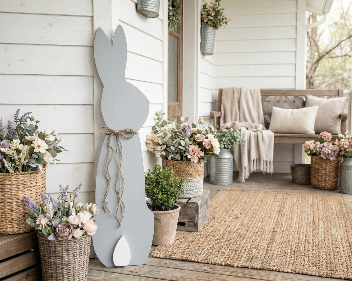 Welcome a touch of seasonal charm to your home with this handcrafted wooden rabbit porch leaner. Made from solid wood, this minimalist design is perfect for those who appreciate simple elegance. Whether placed outdoors on a covered porch or indoors in your entryway, this rabbit adds a cozy vibe to any space. A burlap bow tied around the neck completes the look, lending a delightful touch of texture and warmth. Sturdy and built to last, this rabbit leaner makes a lovely statement piece that celebrates the beauty of understated decor while seamlessly blending into your home’s style.