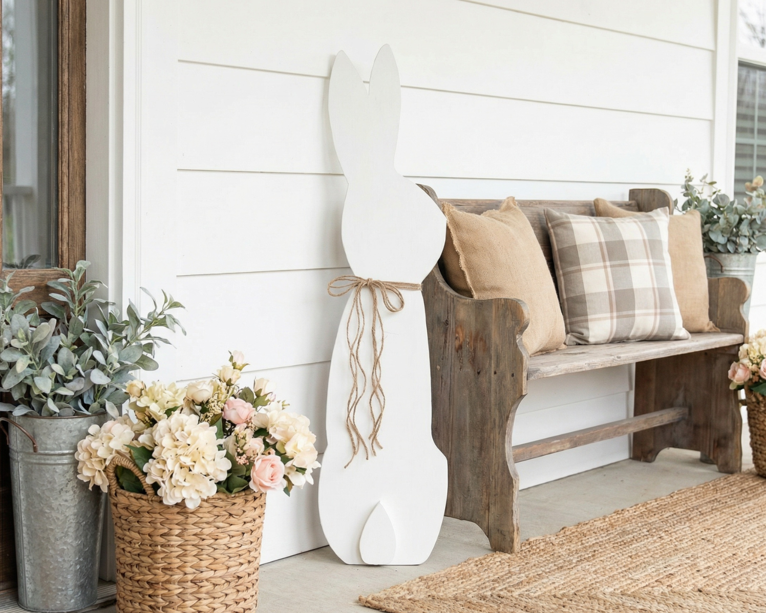 Welcome a touch of seasonal charm to your home with this handcrafted wooden rabbit porch leaner. Made from solid wood, this minimalist design is perfect for those who appreciate simple elegance. Whether placed outdoors on a covered porch or indoors in your entryway, this rabbit adds a cozy vibe to any space. A burlap bow tied around the neck completes the look, lending a delightful touch of texture and warmth. Sturdy and built to last, this rabbit leaner makes a lovely statement piece that celebrates the beauty of understated decor while seamlessly blending into your home’s style.