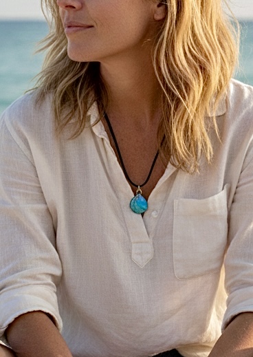 The pendant hangs gracefully from a sleek black cord, creating a versatile piece perfect for adding a touch of oceanic charm and natural elegance to any outfit. Ideal for beach lovers, bohemian styles, or anyone who appreciates unique, handcrafted jewelry.