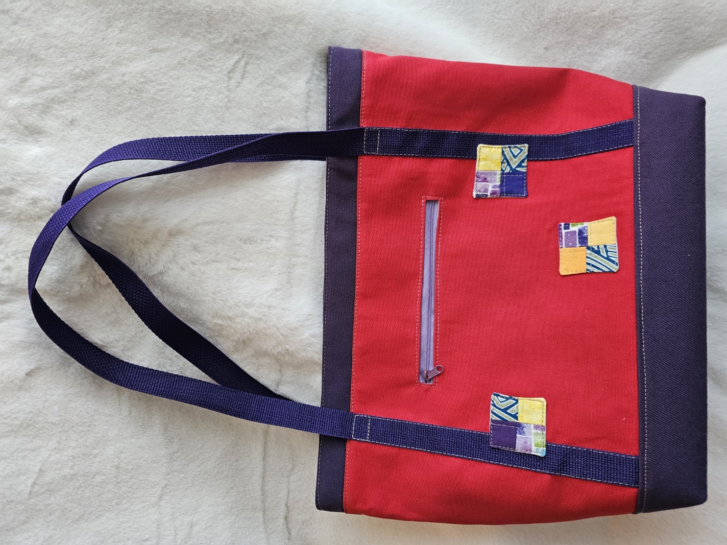 A cheerful red tote for your daily runs or just because. An original piece inspired by the 1" square quilt which became the generous front pocket. 100% cotton interior and exterior, with synthetic webbing shoulder straps.