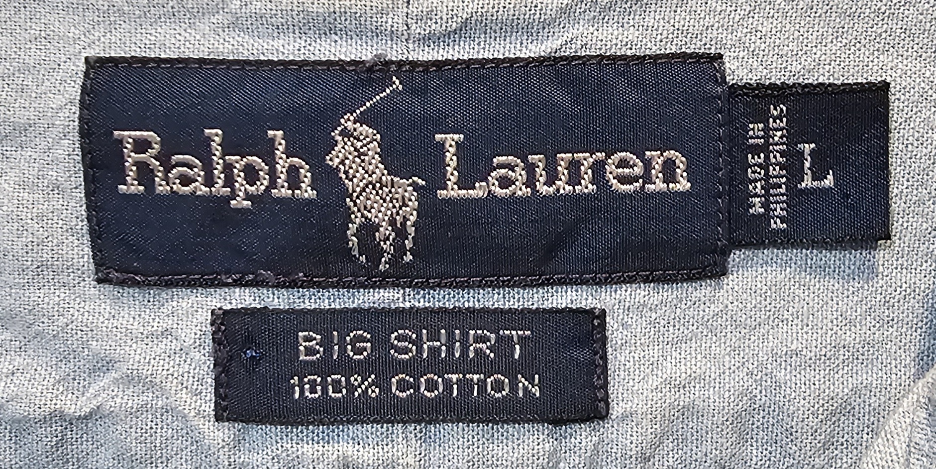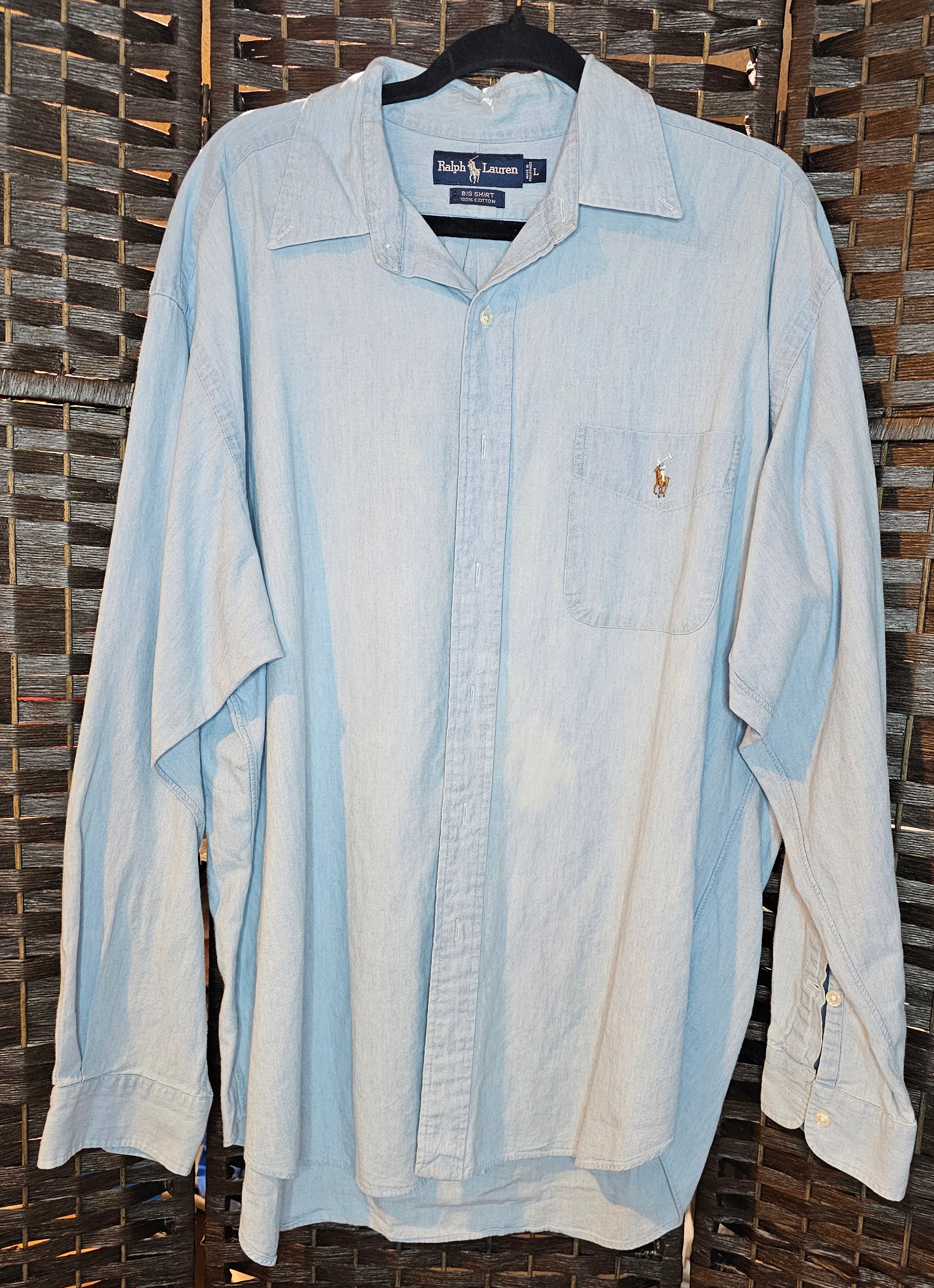 This is a thrifted Large Ralph Lauren denim top. 28.5 inches across pit to pit. 32.5 inches long from tip of shoulder to bottom of shirt. Embellished on back with a fabric panel.