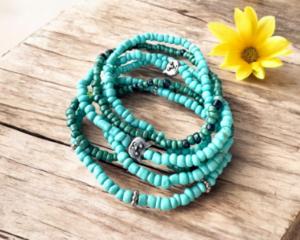 Handmade pair of western earrings are made of a turquoise-colored stone and other beads. At the end of the earring is a silver-plated leaf.