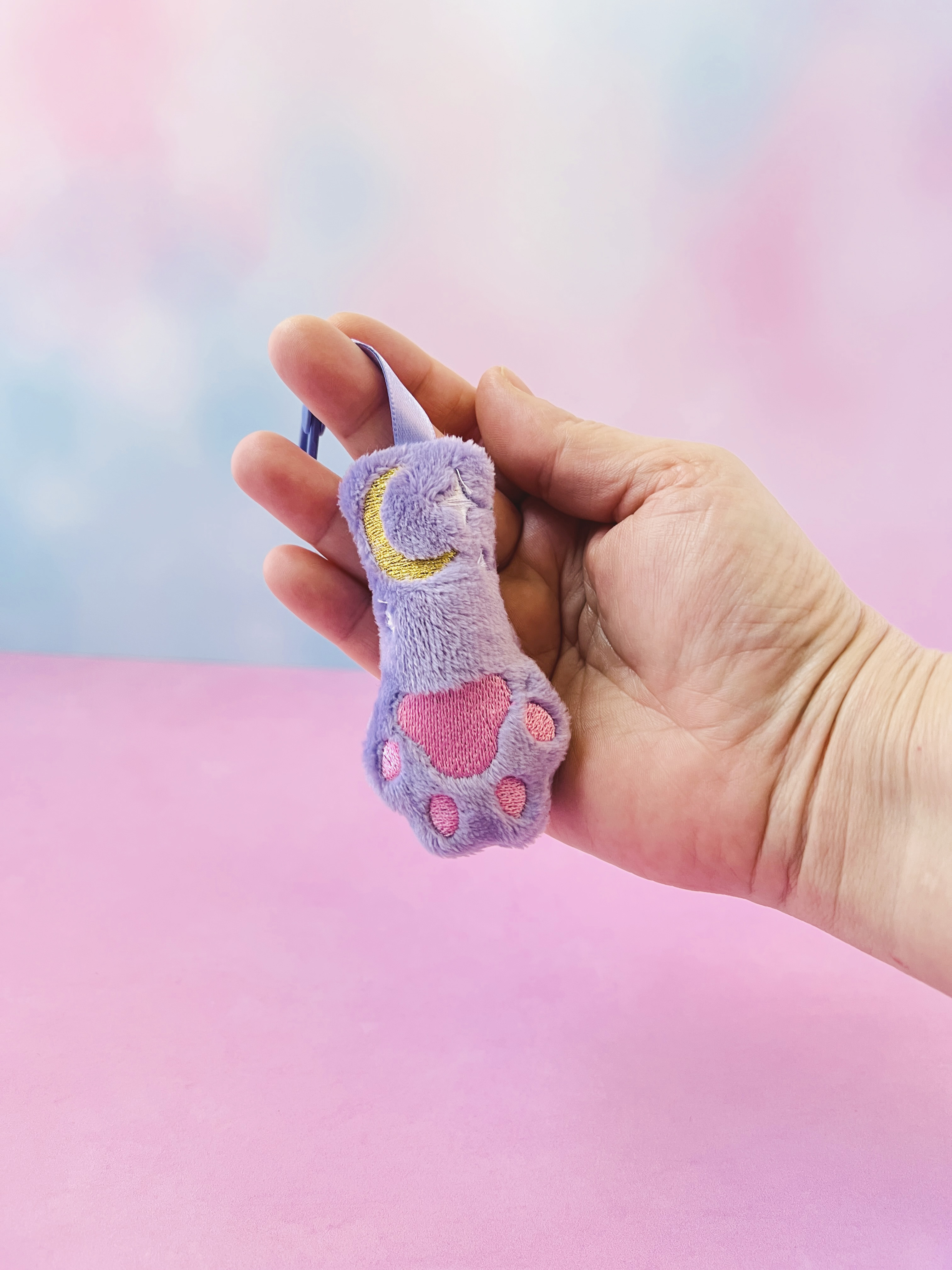 Lavender Celestial Cat Paw Plush Bag Charm, Kawaii Cat Paw Keychain Crescent Moon Stars, Cute Plush Keyring, Pastel Goth Astrology Accessory